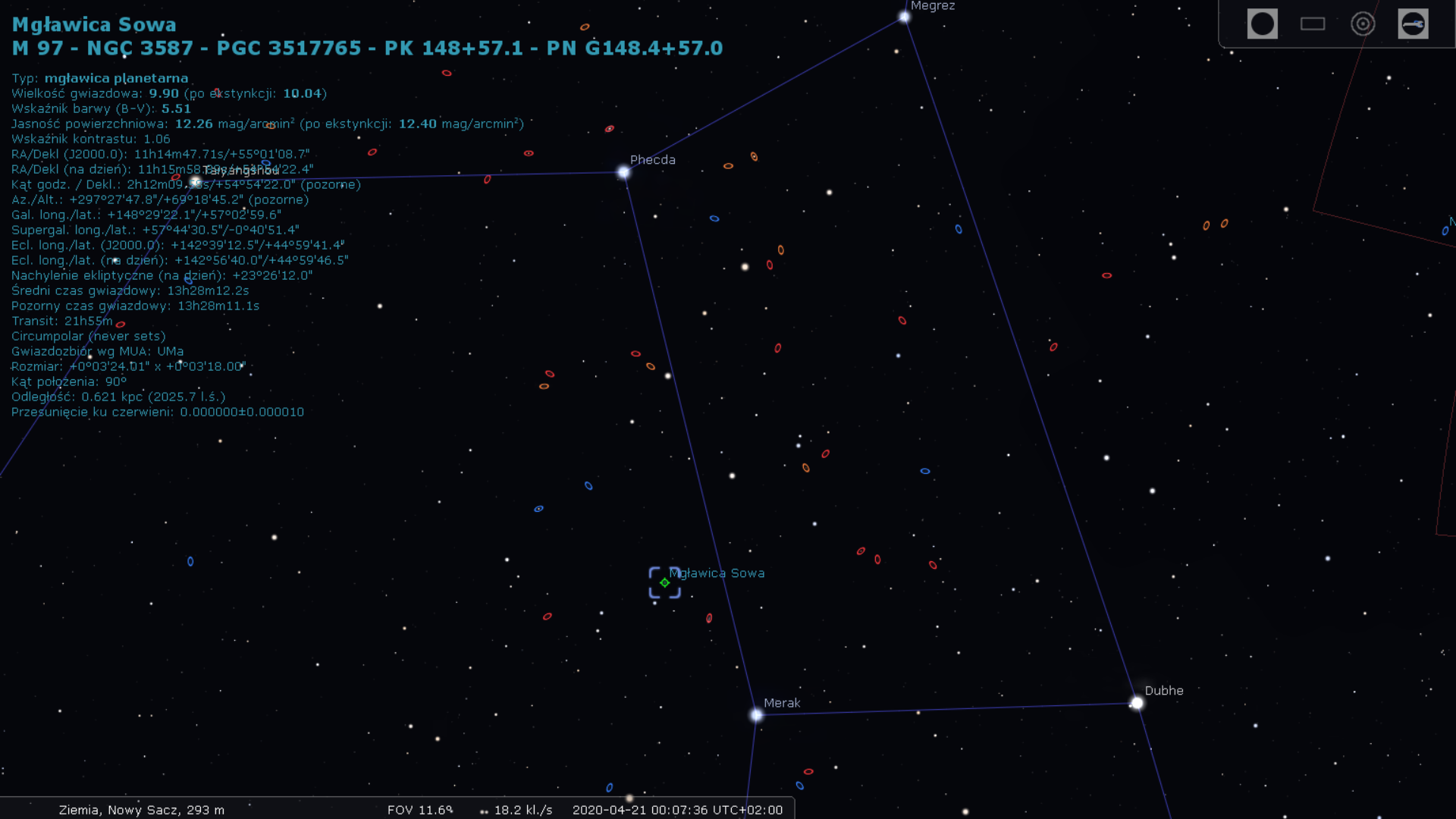 I przerywamy galaktyczną serię. W Wielkiej Niedźwiedzicy znajdziemy jeszcze jeden ciekawy obiekt z katalogu Messiera, który do galaktyk się nie zalicza. To M97, mgławica planetarna powstała po wybuchu supernowej. Nazywana jest Sową z powodu osobliwego wyglądu. Na owalnym tle w dużym teleskopie widzimy bowiem dwie ciemne plamy przypominające sowie oczy. Do zauważenia mgławicy jako małej, gwiazdopodobnej tarczki, musimy użyć instrumentu o średnicy co najmniej 70 mm. Znajduje się w odległości 1300 lat świetlnych od Ziemi. Na niebie odnajdziemy Sowę nieopodal gwiazdy Merak.