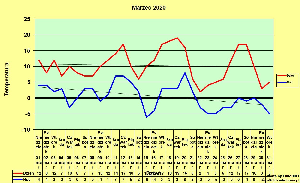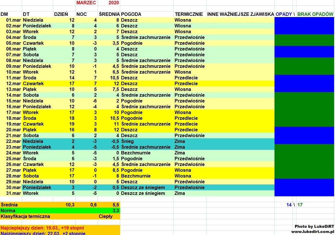Był to miesiąc całkiem udany, gdyż przyniósł sporo Słońca. Jednocześnie był on dość typowy - przyniósł zarówno dni niemalże zimowe, jak i dni iście wiosenne. Średnia anomalia marca 2020 była mniej więcej na poziomie marca 2016 oraz niższa niż np. w marcach 2012 i 2015. Winowajcą były przede wszystkim chłodne noce - średnia minimalna temperatura była na niższym poziomie niż w lutym
