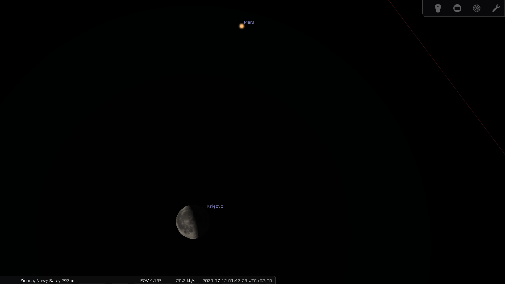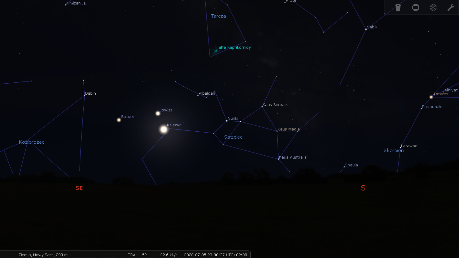 5 lipca bowiem wschodzący Księżyc będzie sąsiadował bezpośrednio z gazowymi olbrzymami - Jowiszem i Saturnem - które w lipcu będą królować na niebie. Poniższa symulacja przedstawia widok nieba 5 lipca o godzinie 23:00. Księżyc i Jowisza będzie można zmieścić w polu widzenia przeciętnej lornetki (10x50).