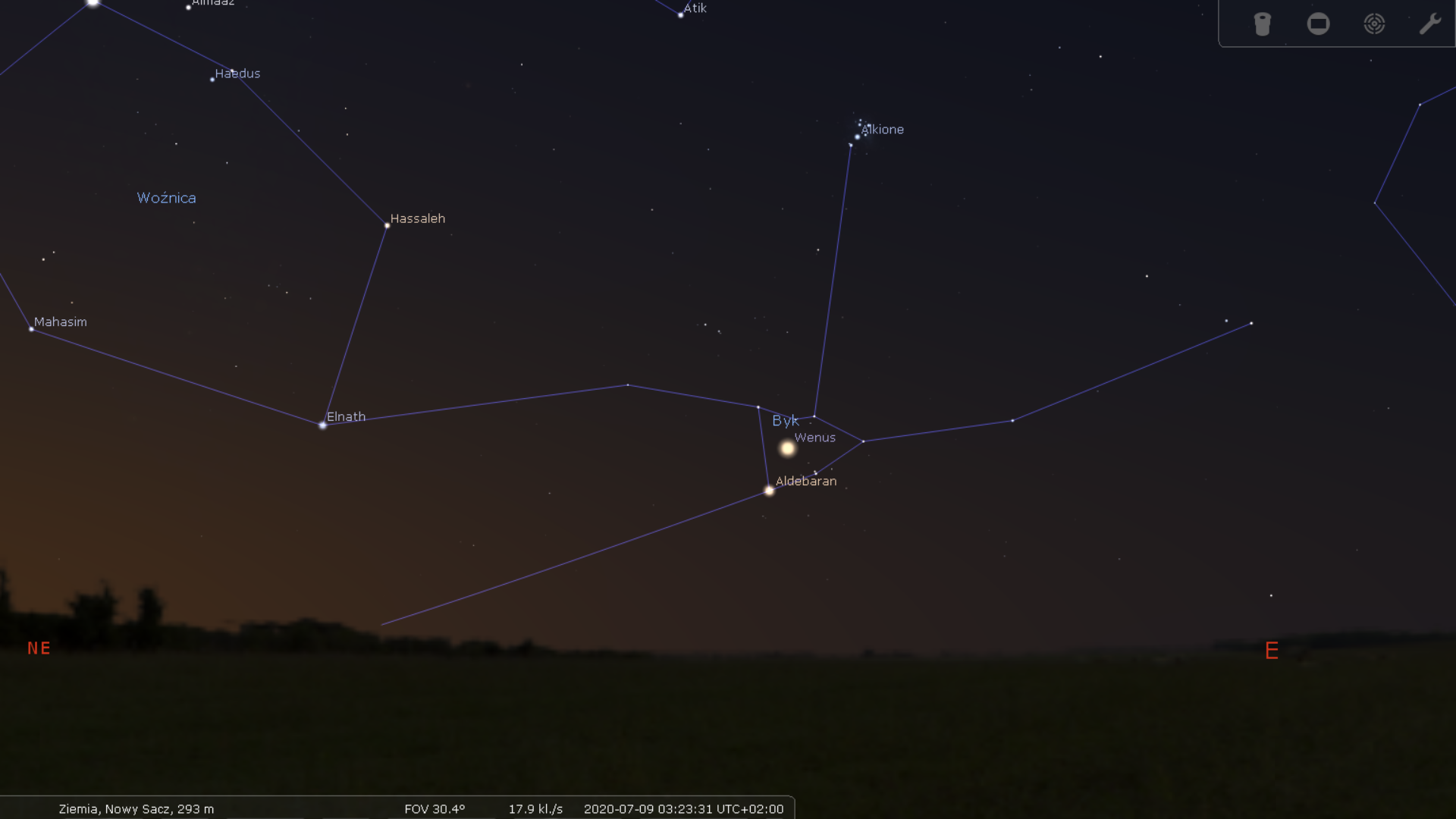 9 lipca do planet górnych dołączy planeta dolna. Wenus, która od grudnia 2019 do maja 2020 roku towarzyszyła nam niezmiennie na niebie wieczornym w wyjątkowo korzystnym położeniu, teraz - po koniunkcji ze Słońcem - przechodzi na niebo poranne. Po godzinie 3:00 widoczna będzie na tle rozległej gromady otwartej Hiady w późnojesiennym gwiazdozbiorze Byka. Z racji wzrostu jasności nieba, do obserwacji zalecany będzie instrument optyczny, gdyż łuna brzasku wygasi pomniejsze gwiazdy należące do gromady.