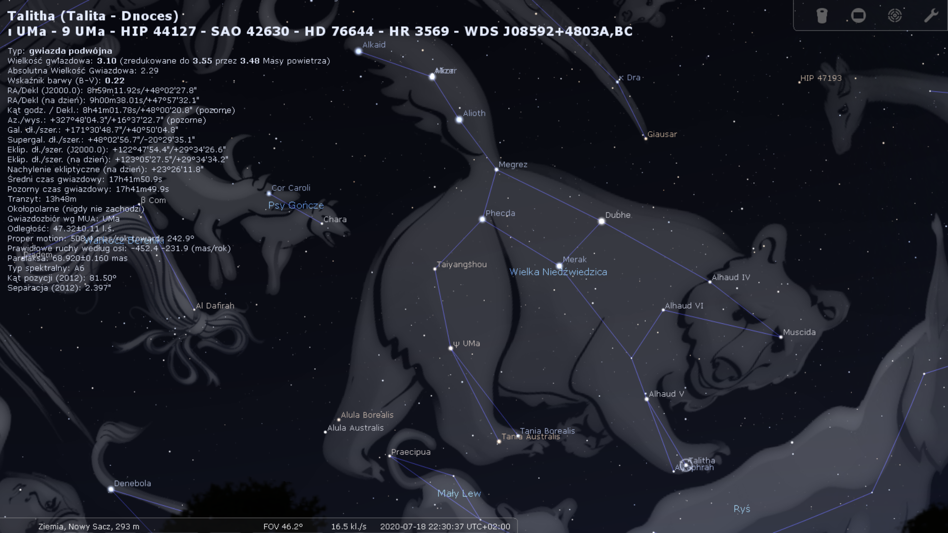 W nocy z soboty na niedzielę 18/19 lipca kometa C/2020 F3 (Neovise) może być widoczna (jeśli przetrwa wcześniejsze spotkanie ze Słońcem) bardzo blisko gwiazdy Talitha, wyznaczającej łapę Wielkiej Niedźwiedzicy. Właśnie wtedy odnalezienie komety będzie najłatwiejsze, z uwagi na bliskość dość jasnej gwiazdy. Warto wykorzystać tę okazję do jej obserwacji; kometa będzie prawdopodobnie dobrze widoczna już w lornetkach, ale jej jasność w tym czasie jest jeszcze niepewna. Położenie gwiazdy Talitha, która znajdzie się tej nocy tuż obok, ilustruje poniższa grafika: