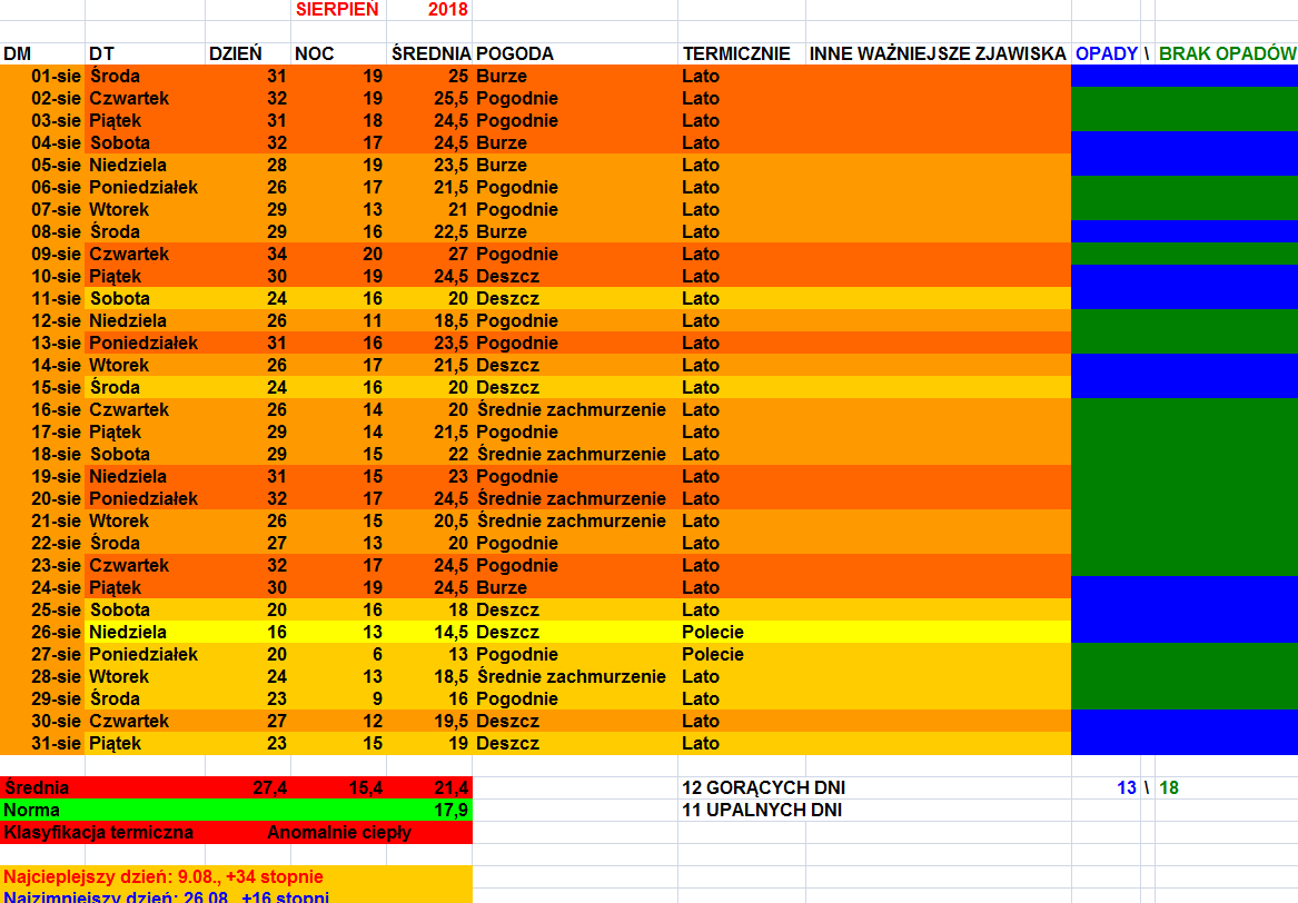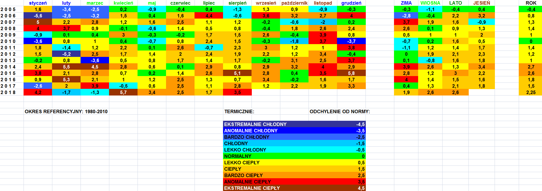 Według mojej klasyfikacji termicznej odchylenia w sierpniach 2007 i 2008 były mniejsze. Ale wiem, że w oficjalnych danych może się to różnić. Poza tym w wykresach lipca i sierpnia 2007, które wrzuciłem tutaj na forum, są inne klasyfikacje niż w poniższym obrazku, dlatego że nie zdążyłem wszystkich miesięcy uaktualnić - jak na razie klasyfikację 1980-2010 wprowadziłem tylko w poniższej tabelce, bo nie chce mi się każdego miesiąca z każdego roku uaktualniać...