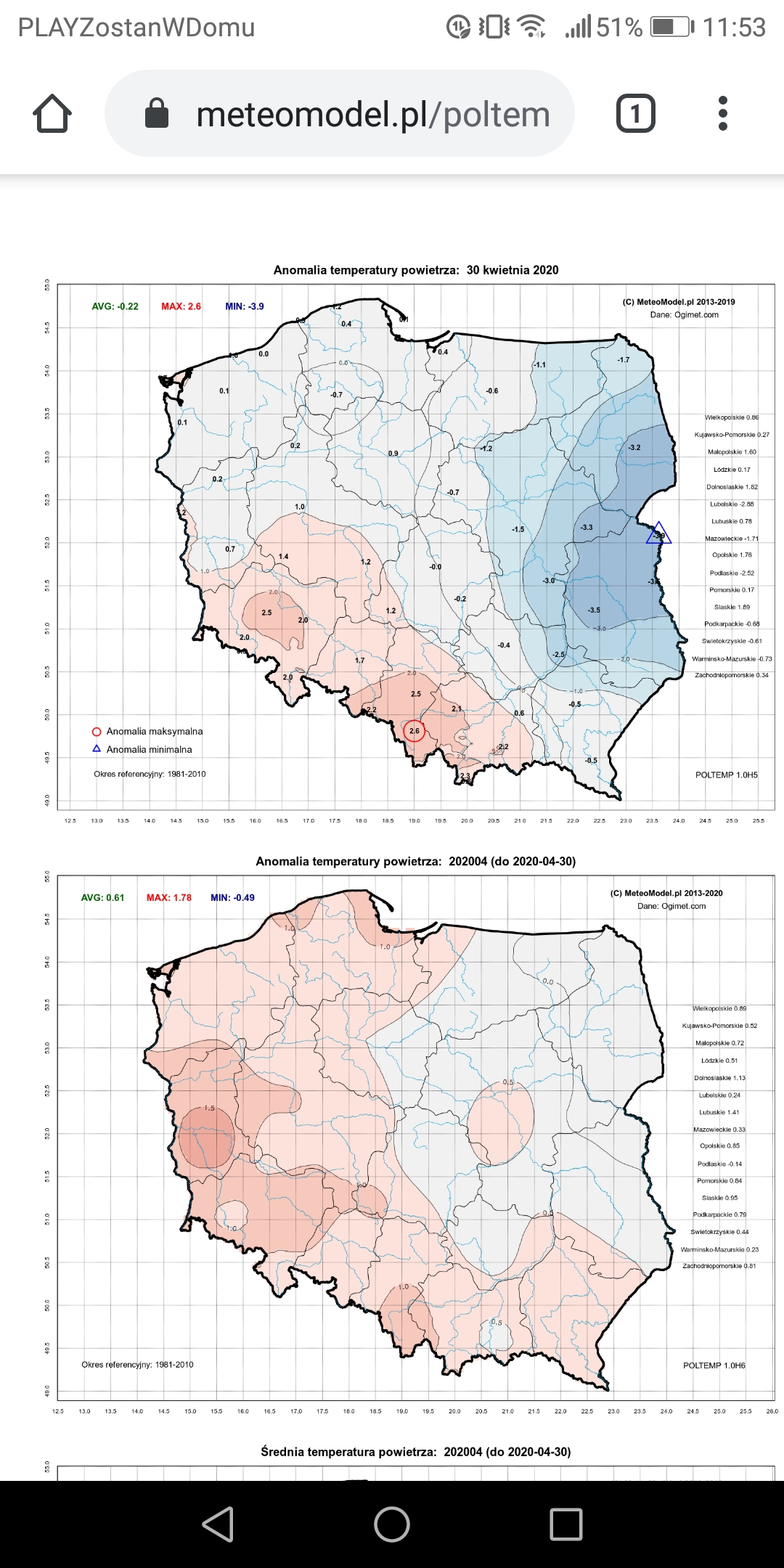 Anomalia tego kwietnia wyniosła +0,61K, czyli raczej zwyczajnie ciepły. Widać dużą różnicę między zachodem, a wschodem Polski, która się formowała przez cały miesiąc