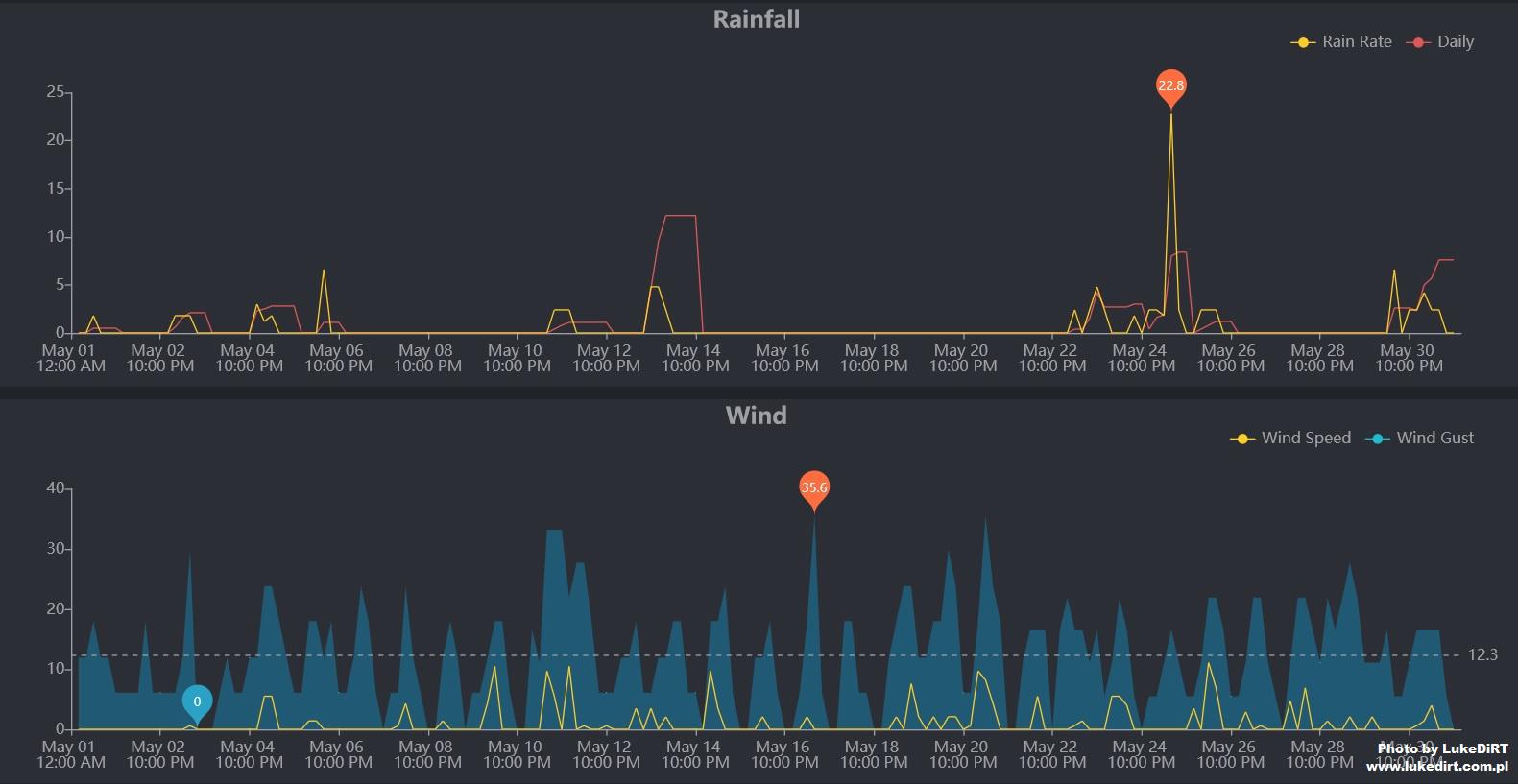 Tu może wydam się dziwny, ale nie postrzegałem tego miesiąca jako strasznie zimny. W ciągu dnia było na ogół chłodno, jednak temp. w przedziale 15-20 C znalazło się sporo (właściwie taki przedział dominował, na 2 miejscu było (nie)stety 10-15 C, ale w sumie dni 20-25 C też nie zebrało się szczególnie mało). Rok temu w I połowie (poza Majówką) lwią część stanowiły temp. ledwo ponad +10 C, a w II połowie nastąpił nagły termiczny przeskok (ale nadal z nietęgą aurą). Takie naprawdę ładne dni może dostrzegłem z 2-3 w tamtym miesiącu, a ten miał ich więcej (ogólnie wydaje, że usłonecznienie na S kraju jakoś szczególnie na "-" od norm nie odbiegało, mimo że nawet Rodzice stwierdzili, że jest na ogół "smutno" za oknem- ale jak się mylę, to przepraszam ), choć owszem nocami panowała znacznie większa zimnica. Rok temu w I połowie maja pochmurna i deszczowa aura chroniła skutecznie przed przymrozkami, a w tym roku wystąpiło ich no z 2-3 na pewno (przy gruncie mogło być i 4, a nawet więcej). Straszne jest to, że ledwo 2 dni mocniej popadało pod koniec, a niektóre blogi (m. in. Królowa) już założyły wpis o falach wezbraniowych. Na Boga to było tylko 30-40, no może miejscami 50-60 mm spokojnie padającej wody!!! Ciekawi mnie, jakie wpisy powstaną po ewentualnych nawałnicach spowodowanych przez niż czarnomorski, który ma obecnie na pogodę w naszym kraju większy wpływ. Myślę, że możliwe 5 dni burzowych pod rząd (zwłaszcza we wschodnich województwach- tj. m. in. Podkarpacie, Lubelszczyzna- bo na ogół niż czarnomorski tam się najbardziej zaznacza) jest większym powodem do niepokoju niż 2 dni chłodnych (anomalia dobowa wcale nie była strasznie niska w tym okresie- ba... tam gdzie nie padało, to pewnie było wręcz ciepło), ale ze słabym/umiarkowanym, rozłożonym w czasie deszczem.
