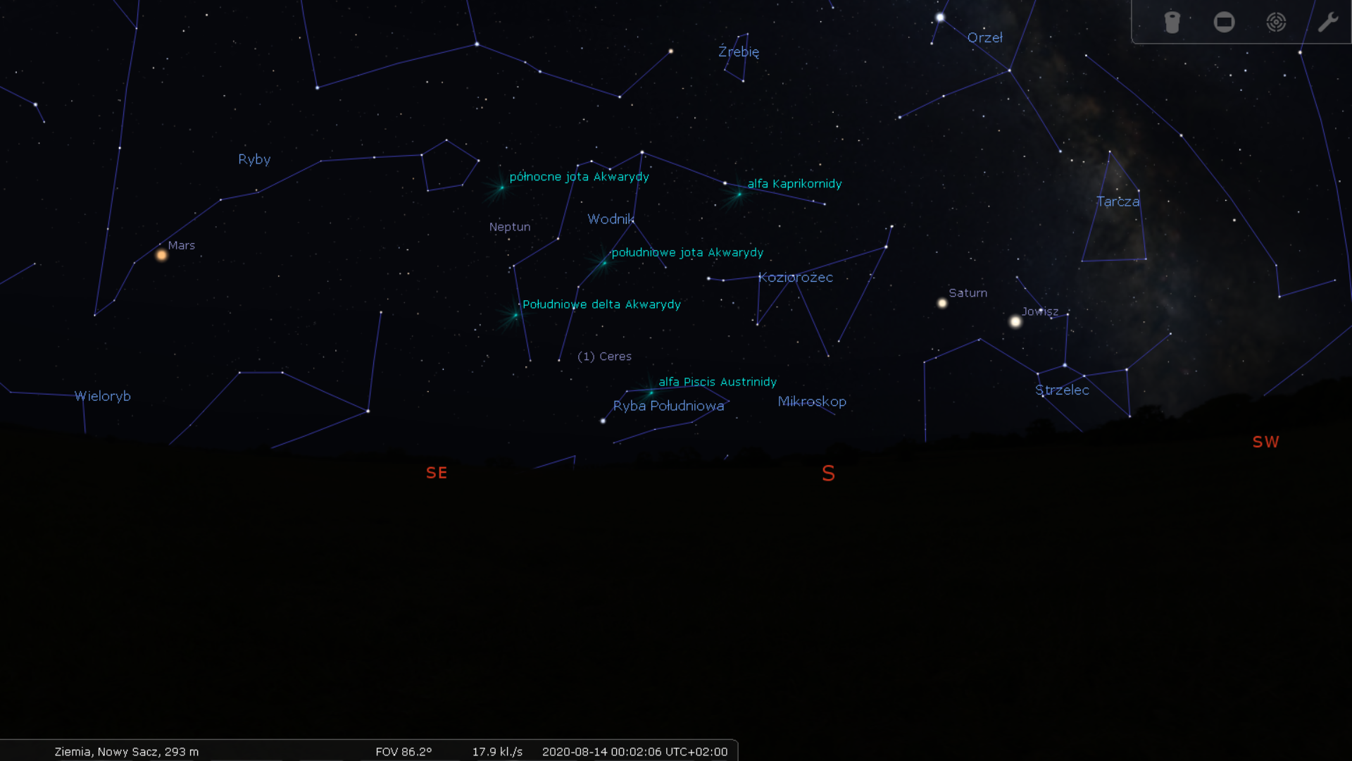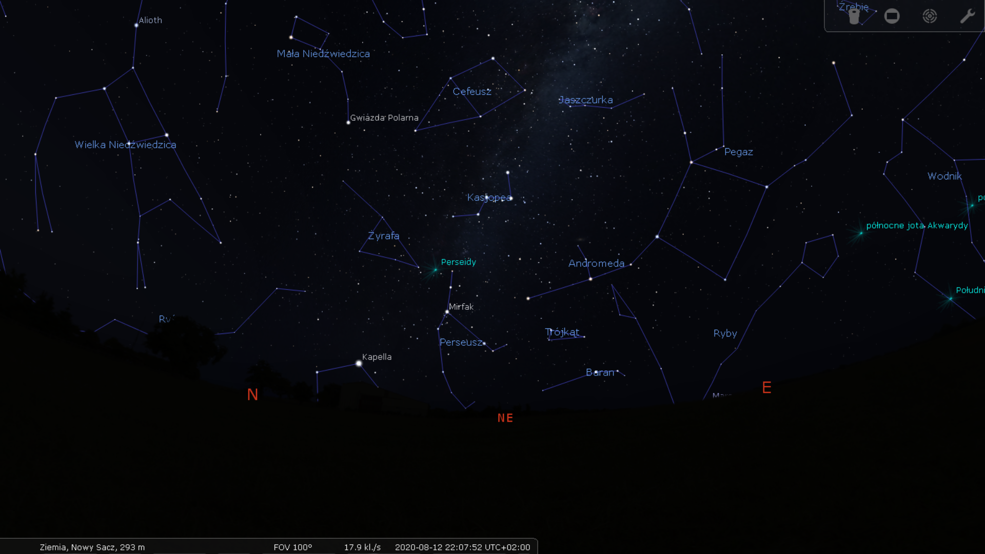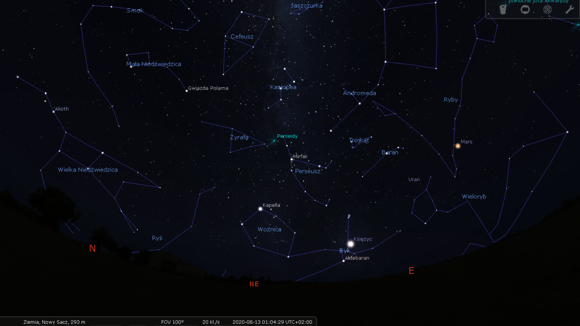 Im później, tym wyżej Perseusz ulokuje się na nieboskłonie. Najlepszymi godzinami do obserwacji będą moim zdaniem godziny między 23:30 a 0:30, jeszcze przed wschodem Księżyca. Ale i później nie zrażajmy się jego obecnością. O 1:00 Perseusz znajdzie się już tak wysoko:
