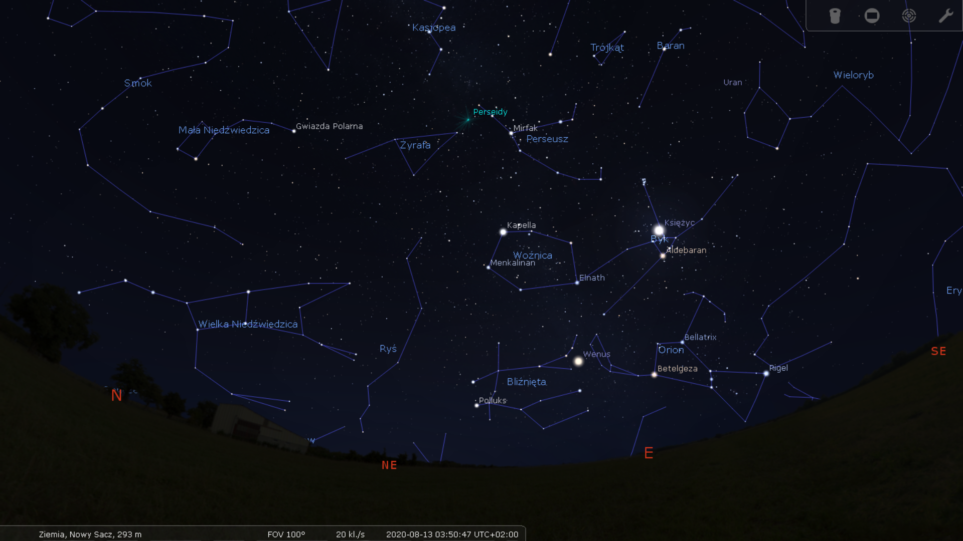 Tuż przed brzaskiem, o godzinie 3:50, Perseusz znajdzie się u szczytu swojej widoczności, blisko zenitu. W 2016 roku to o tej późnej porze obserwowano najlepsze sztuki, a zatem warto było znieść chłód panujący tej nocy w znacznej części Polski. W tym roku o tej godzinie prócz Perseusza królować na niebie będzie jasna Wenus, która tej nocy osiągnie maksymalną elongację zachodnią, co jest kolejną atrakcją. A jeszcze niedawno podziwialiśmy ją na niebie wieczornym! Wtedy jeszcze mogliśmy obserwować gwiazdozbiory nieba zimowego, zaś za kilka dni... już będziemy mogli je zobaczyć. Przed wschodem Słońca w oczy rzuci się nam Orion i Bliźnięta, przez które z pewnością nieraz przemieszczą się Perseidy.