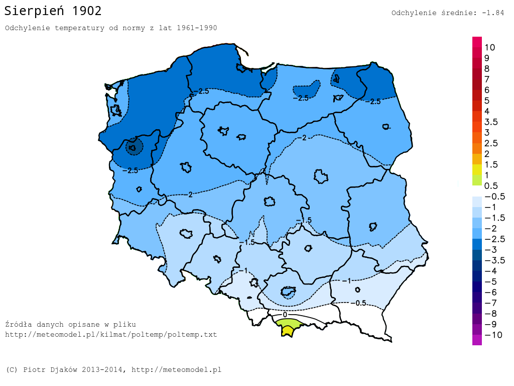 Znalazłem jeszcze na Meteomodelu wykres anomalii okresu kwiecień-sierpień w uśrednieniu na przestrzeni wielu lat, z którego wynika że ten w 1902 roku nie był jednak najzimniejszy w historii - ustępuje temu z 1785 i 1864 roku, który był rekordowy. Szkoda że nie ma danych z 1864 roku... a może to i dobrze.