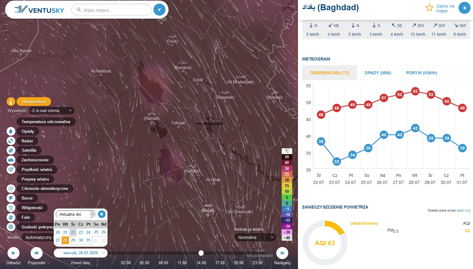 Nie wiem, ile w tym prawdy, ale portal Ventusky prognozuje, że za niecały tydzień (wtorek, 28 lipca) na Bliskim Wschodzie, w stolicy Iraku - Bagdadzie, ma być 53, albo nawet 54 stopnie