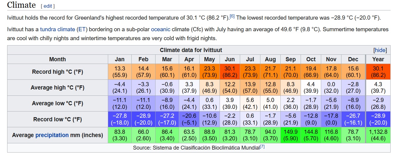 Grenlandia będzie mi się kojarzyła z zimnem. Nic nie poradzę- szerokość geograficzna jest wysoka. To jest chyba przykład subekumeny, czyli osiedlają się jacyś mieszkańcy i mogą tam pełnić jakieś funkcje gospodarcze, ale na nielicznym obszarze. Są to krańce południowe wyspy, gdzie pogoda jest dogodniejsza (i tam pewnie głównie w przeszłości Wikingowie się osiedlali). Podobno Prąd Północnoatlantycki sprawia, że tam warunki są znacznie bardziej łagodne i sprzyjające niż w głąb terytorium, a co dopiero na krańcach północnych, blisko Bieguna Północnego. Podejrzewam, że ta stacja Ivittut to krańce południowe wyspy, a wówczas no... może być taka sytuacja możliwa. :-(