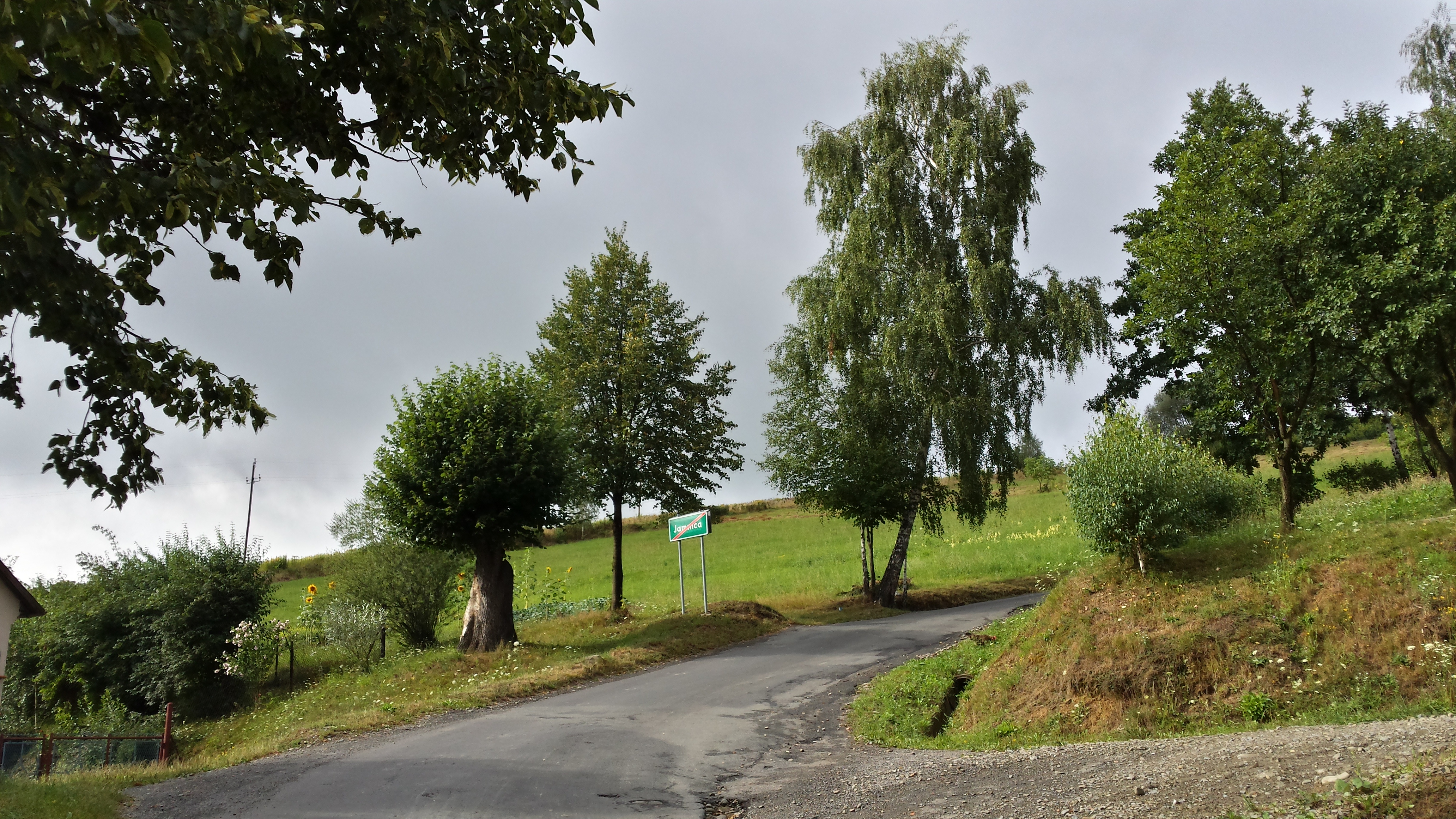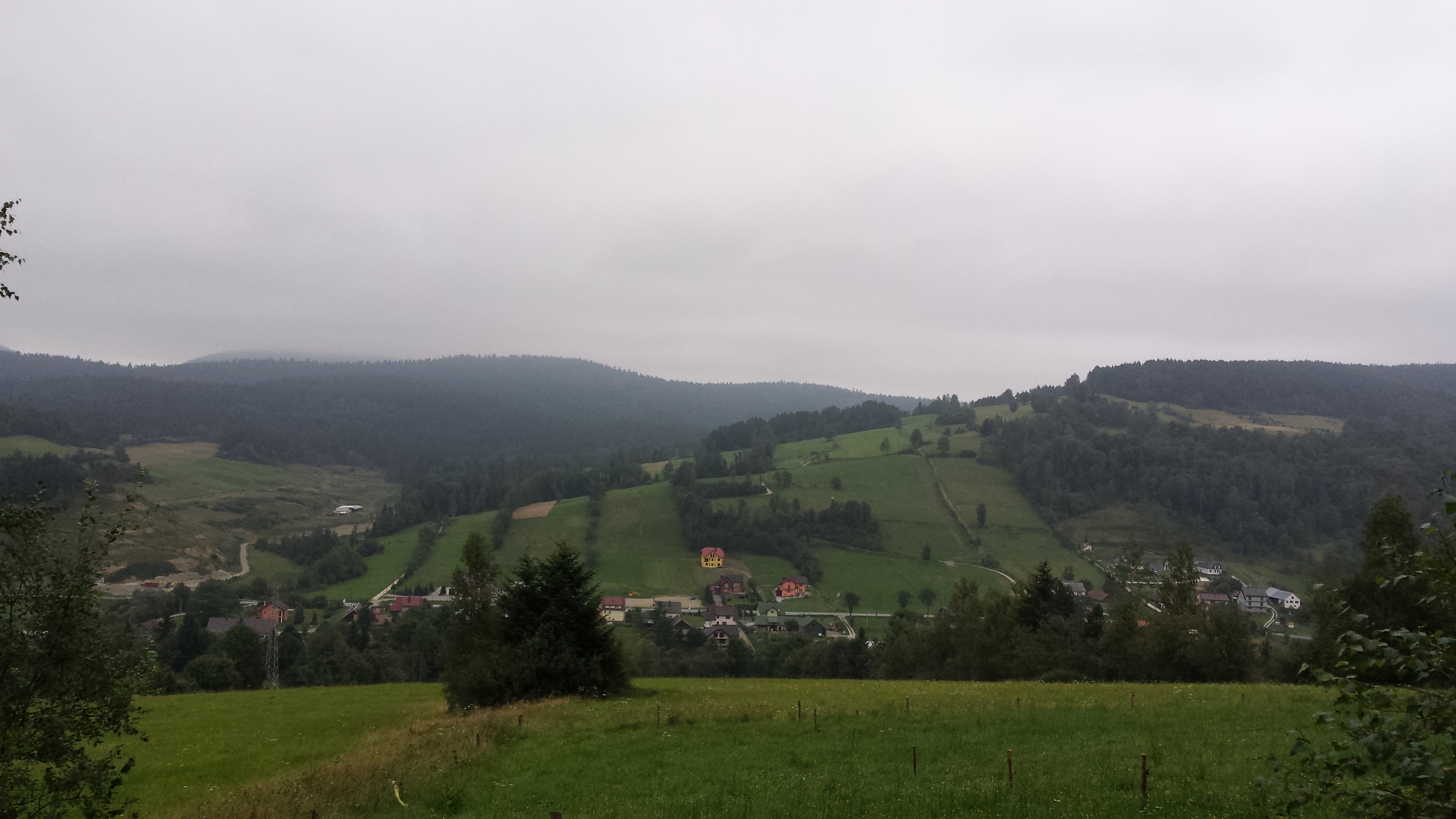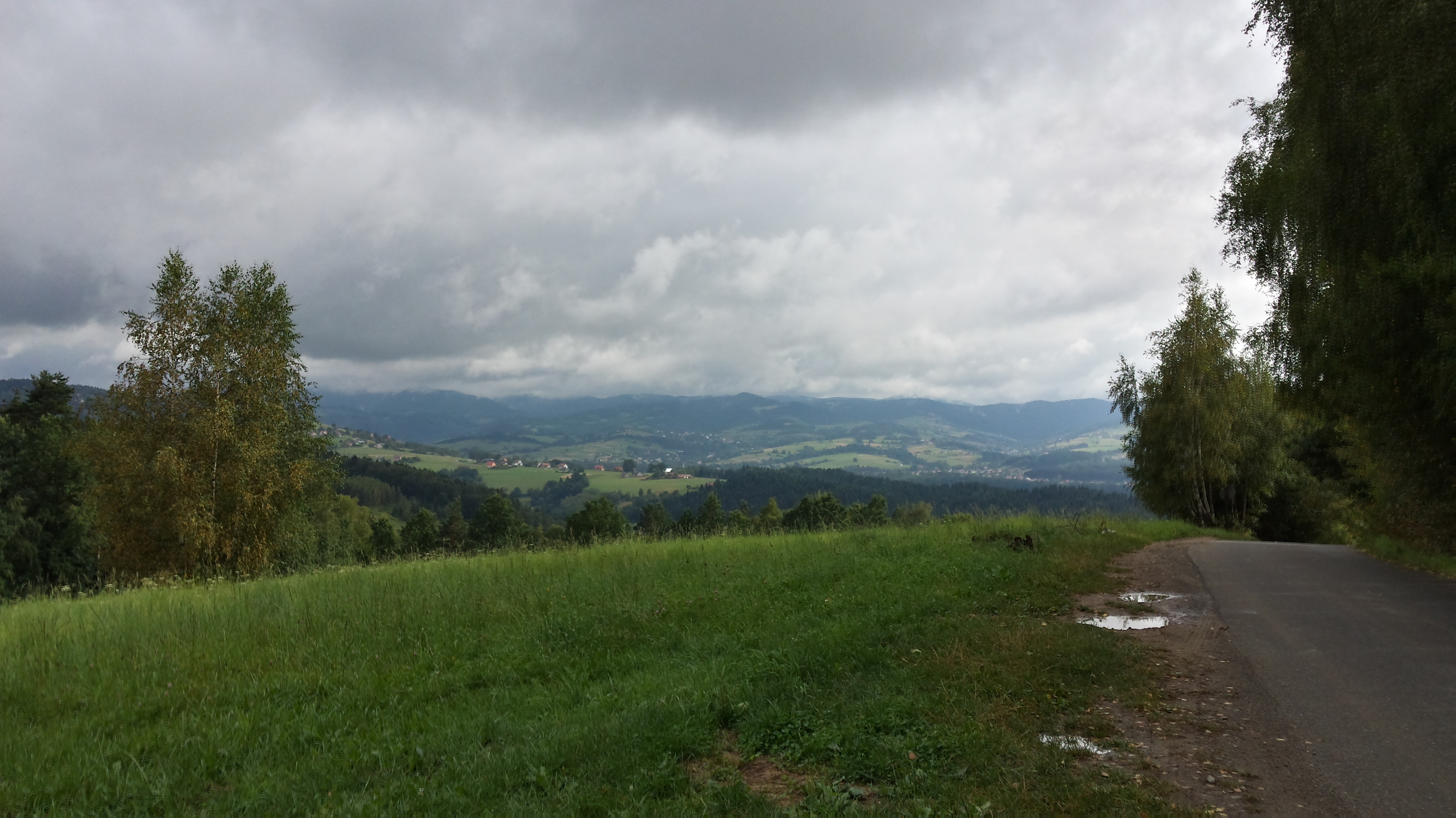 12 sierpnia był dniem zmiany pogody. Od rana było pochmurno z tylko niewielkimi i krótkimi przejaśnieniami, a temperatura wynosiła niewiele więcej niż 20 stopni, choć wartość z godziny 18 UTC dnia poprzedniego szyfruje 28,2 stopnia. To była pogoda w sam raz na rowerowe wspinaczki po nieutwardzonych szlakach i przemieszczanie się po trudnym terenie, choć długość przygody wystarczyła do tego, by pogoda zaczęła się zmieniać. Nie wziąłem bluzy, oczekując że stanie się to później, a tu już około 15:00 temperatura spadła poniżej 20 stopni. Zaczął kropić deszcz i niestety, obawy i złe przeczucia miały swoją podstawę. Jeden z nas wpadł w lekki poślizg i upadł. Nic mu się nie stało, ale po chwili usłyszeliśmy syk, jakby węża. Każdy z nas wolałby, aby był to wąż, lecz niestety to opona poszła. Z dala od innych ludzi, nie ma zasięgu i tu taka przygoda... Całe szczęście, że jeden z nas dysponował samochodem, który czekał na parkingu kilka kilometrów od końca zaplanowanego szlaku, ale najpierw trzeba było się tam jakoś dostać. W sytuacji zagrożenia człowiek może wiele znieść i wymyślić, toteż udało nam się wpaść na szalony pomysł. Niczym McGyver odważyliśmy się skorzystać z rozwiązań niestandardowych i... zapchaliśmy oponę mchem i trawą. W ten sposób udało się wyjechać na większą przestrzeń. Trochę padało i wobec zaistniałego zdarzenia nie jechaliśmy już dalej, lecz wybraliśmy powrót na przełaj, przez pastwiska, pagórki i dwa strumyczki przez które przenosiło się rowery korzystając z kładki o szerokości pół metra :D
