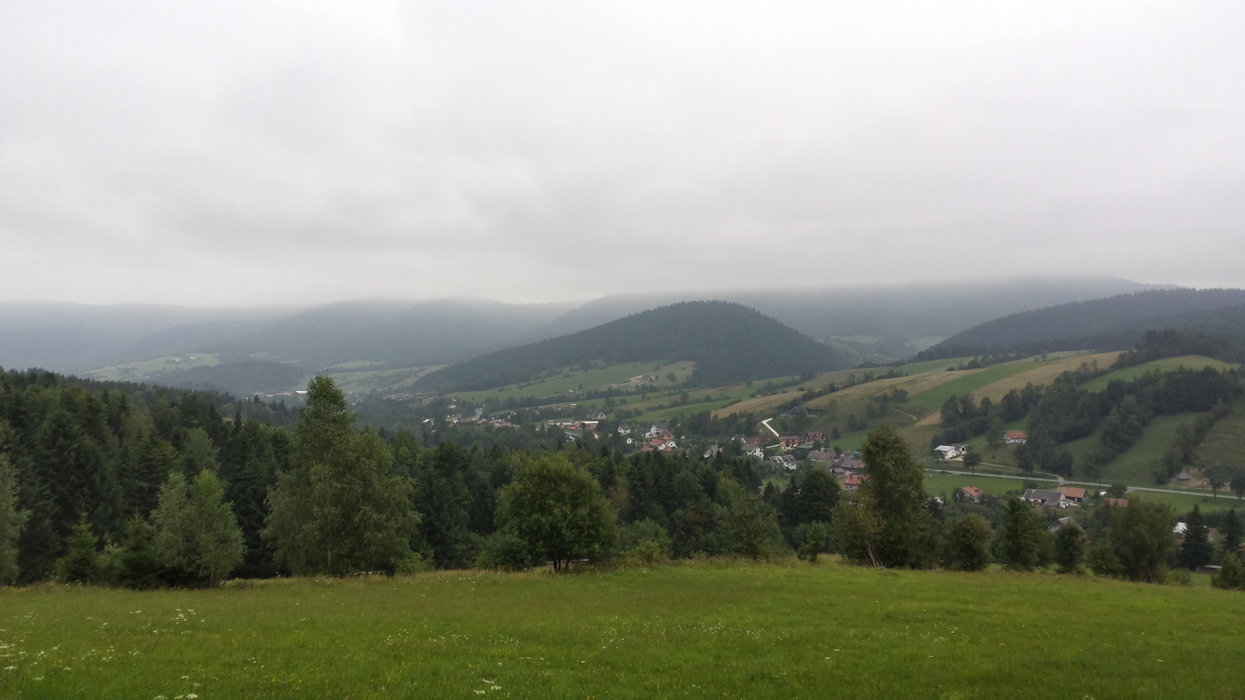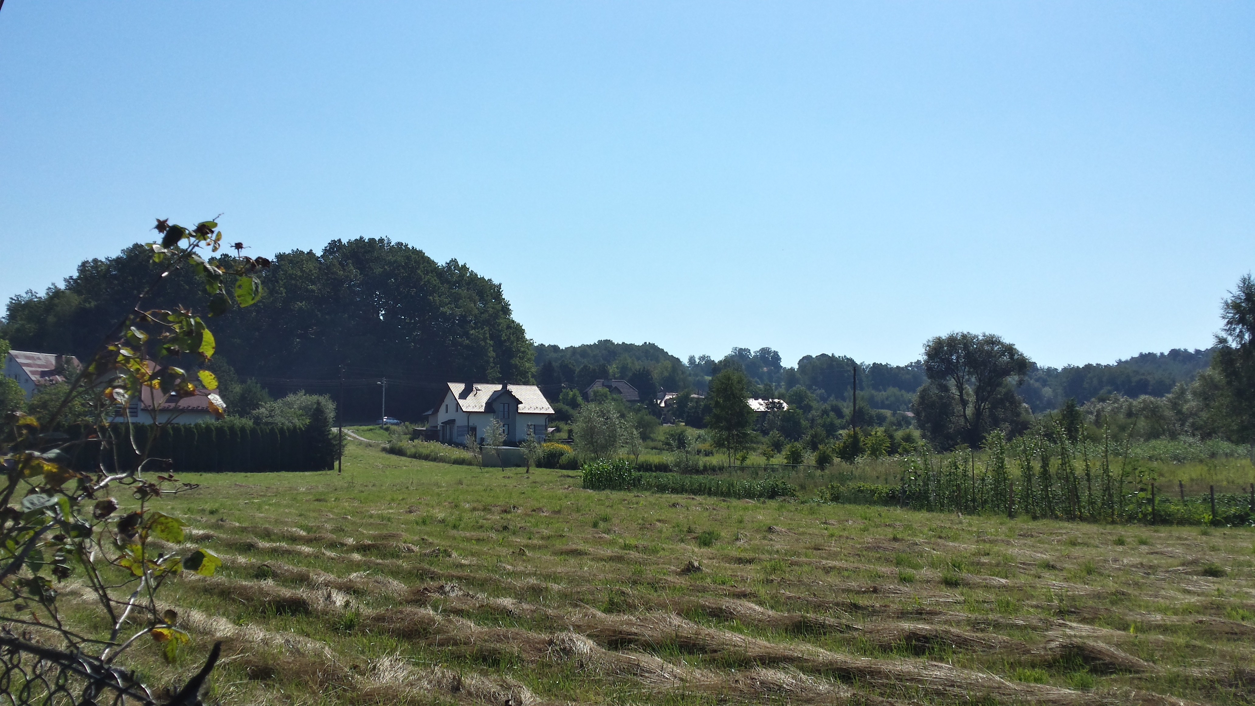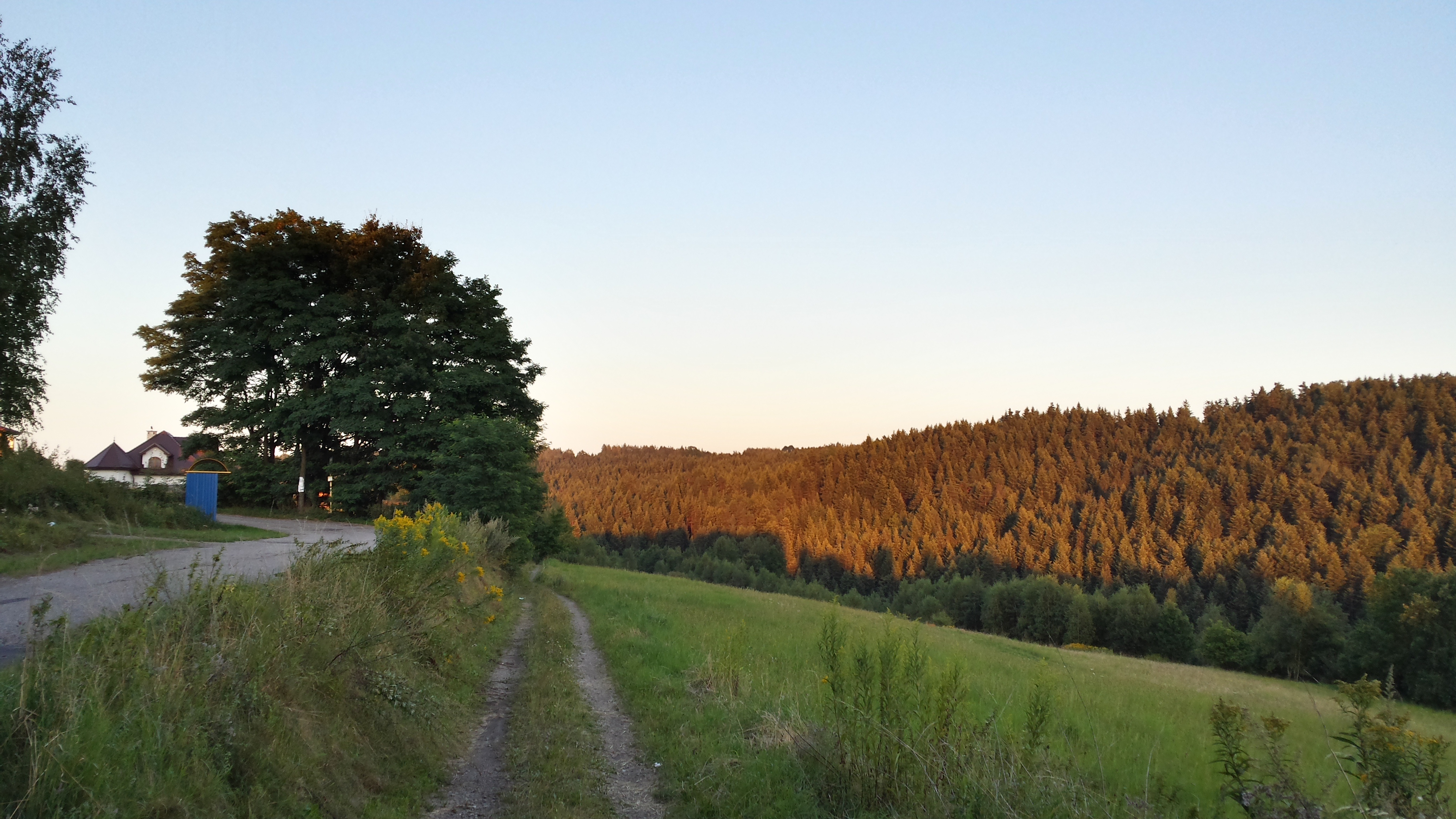 12 sierpnia był dniem zmiany pogody. Od rana było pochmurno z tylko niewielkimi i krótkimi przejaśnieniami, a temperatura wynosiła niewiele więcej niż 20 stopni, choć wartość z godziny 18 UTC dnia poprzedniego szyfruje 28,2 stopnia. To była pogoda w sam raz na rowerowe wspinaczki po nieutwardzonych szlakach i przemieszczanie się po trudnym terenie, choć długość przygody wystarczyła do tego, by pogoda zaczęła się zmieniać. Nie wziąłem bluzy, oczekując że stanie się to później, a tu już około 15:00 temperatura spadła poniżej 20 stopni. Zaczął kropić deszcz i niestety, obawy i złe przeczucia miały swoją podstawę. Jeden z nas wpadł w lekki poślizg i upadł. Nic mu się nie stało, ale po chwili usłyszeliśmy syk, jakby węża. Każdy z nas wolałby, aby był to wąż, lecz niestety to opona poszła. Z dala od innych ludzi, nie ma zasięgu i tu taka przygoda... Całe szczęście, że jeden z nas dysponował samochodem, który czekał na parkingu kilka kilometrów od końca zaplanowanego szlaku, ale najpierw trzeba było się tam jakoś dostać. W sytuacji zagrożenia człowiek może wiele znieść i wymyślić, toteż udało nam się wpaść na szalony pomysł. Niczym McGyver odważyliśmy się skorzystać z rozwiązań niestandardowych i... zapchaliśmy oponę mchem i trawą. W ten sposób udało się wyjechać na większą przestrzeń. Trochę padało i wobec zaistniałego zdarzenia nie jechaliśmy już dalej, lecz wybraliśmy powrót na przełaj, przez pastwiska, pagórki i dwa strumyczki przez które przenosiło się rowery korzystając z kładki o szerokości pół metra :D