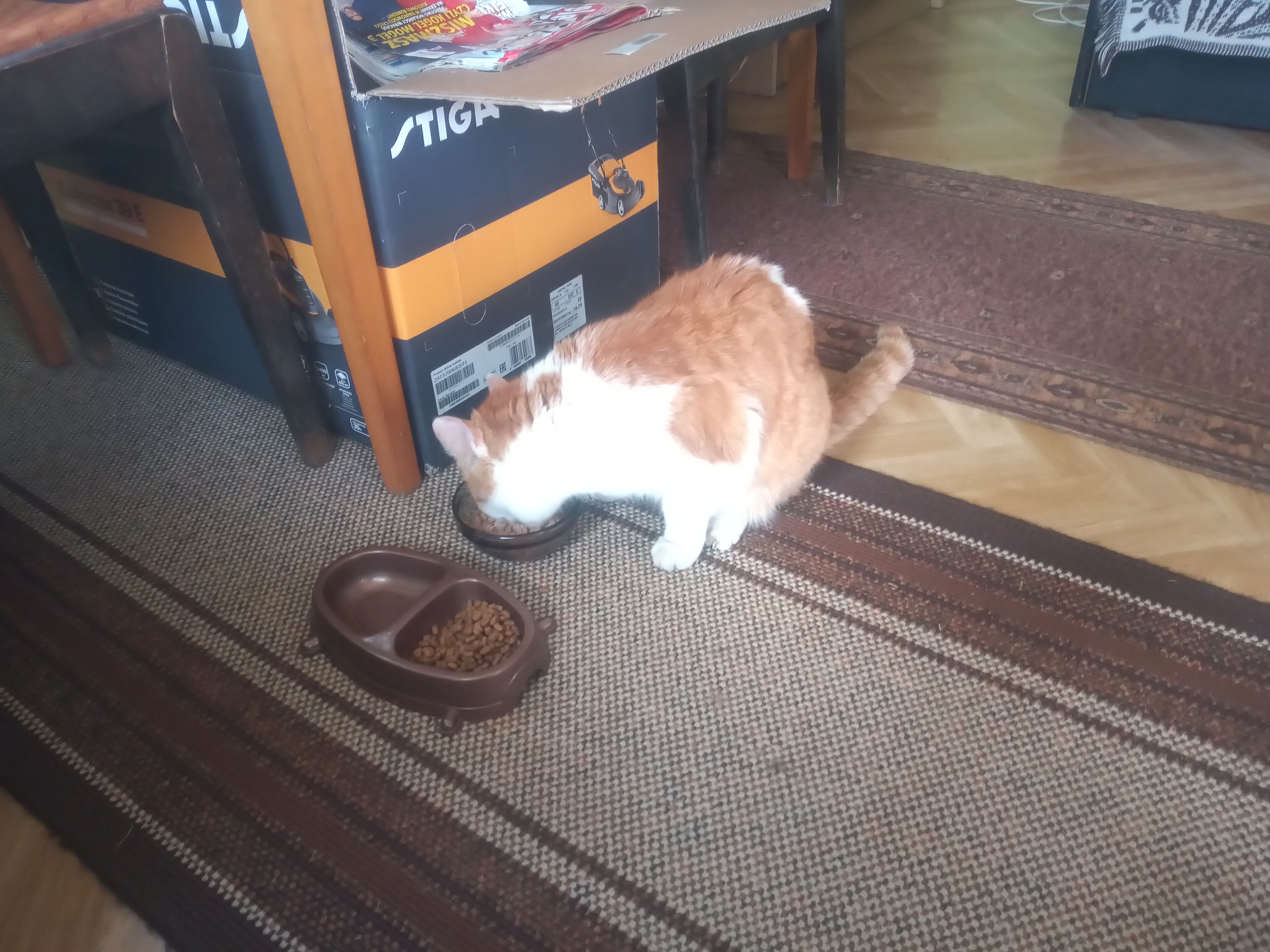 Ona najbardziej lubi taka "kiełbasę" z odpadków rzeźnych, którą jako"karmę dla psów" sprzedają w sklepach "Wierzejek" po 3,50 za kg. Ale ona, jak to kotka czytać nie potrafi i o tym nie wie dlatego wcina ja z apetytem. Tak samo suchą karmę PURINY. Zresztą PURINE lubi także nasz kocur. Dostaje też saszetki "Feliksa". A co upolują (przeważnie nornice), to zazwyczaj przynoszą "w prezencie" pod drzwi.