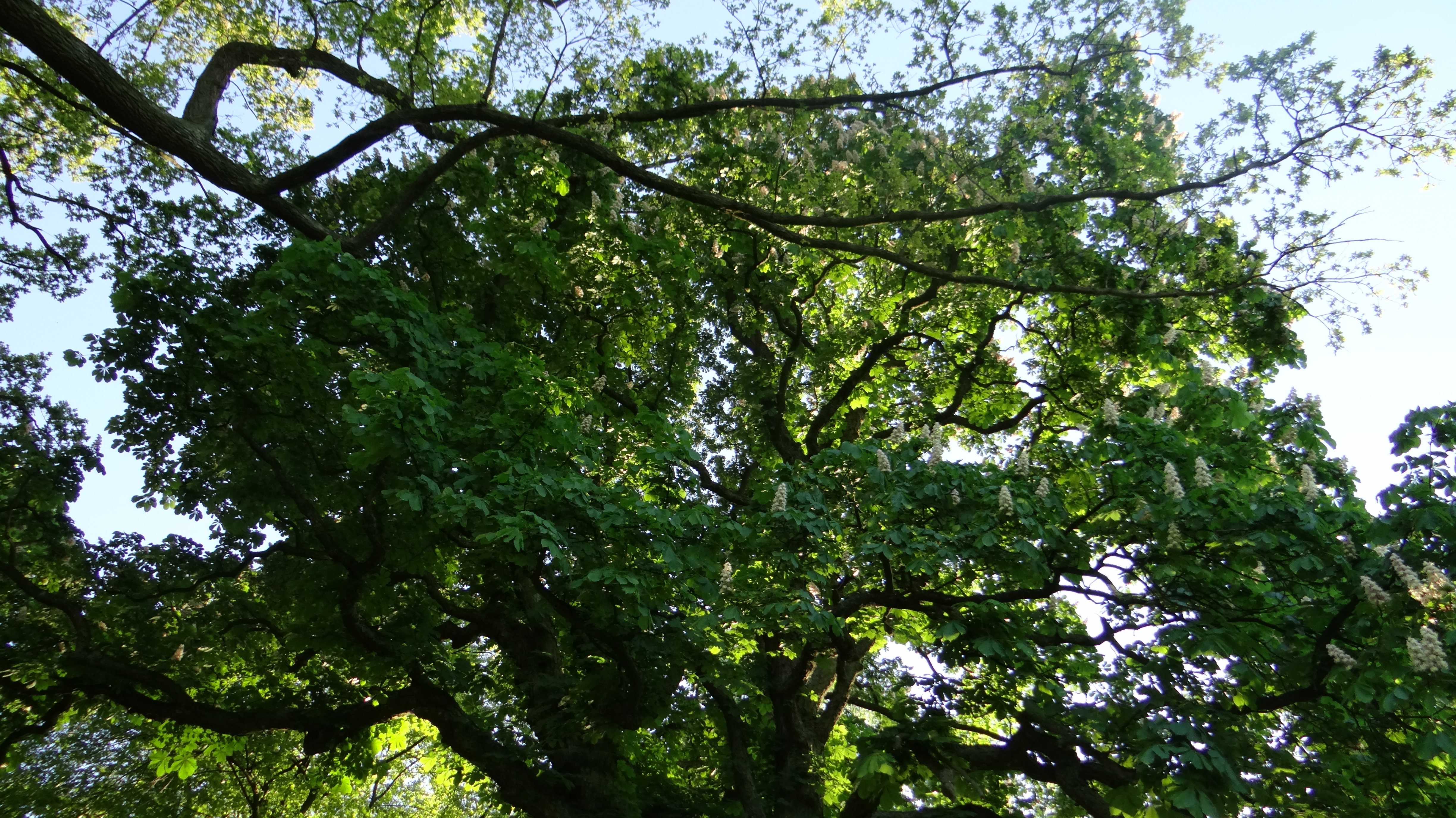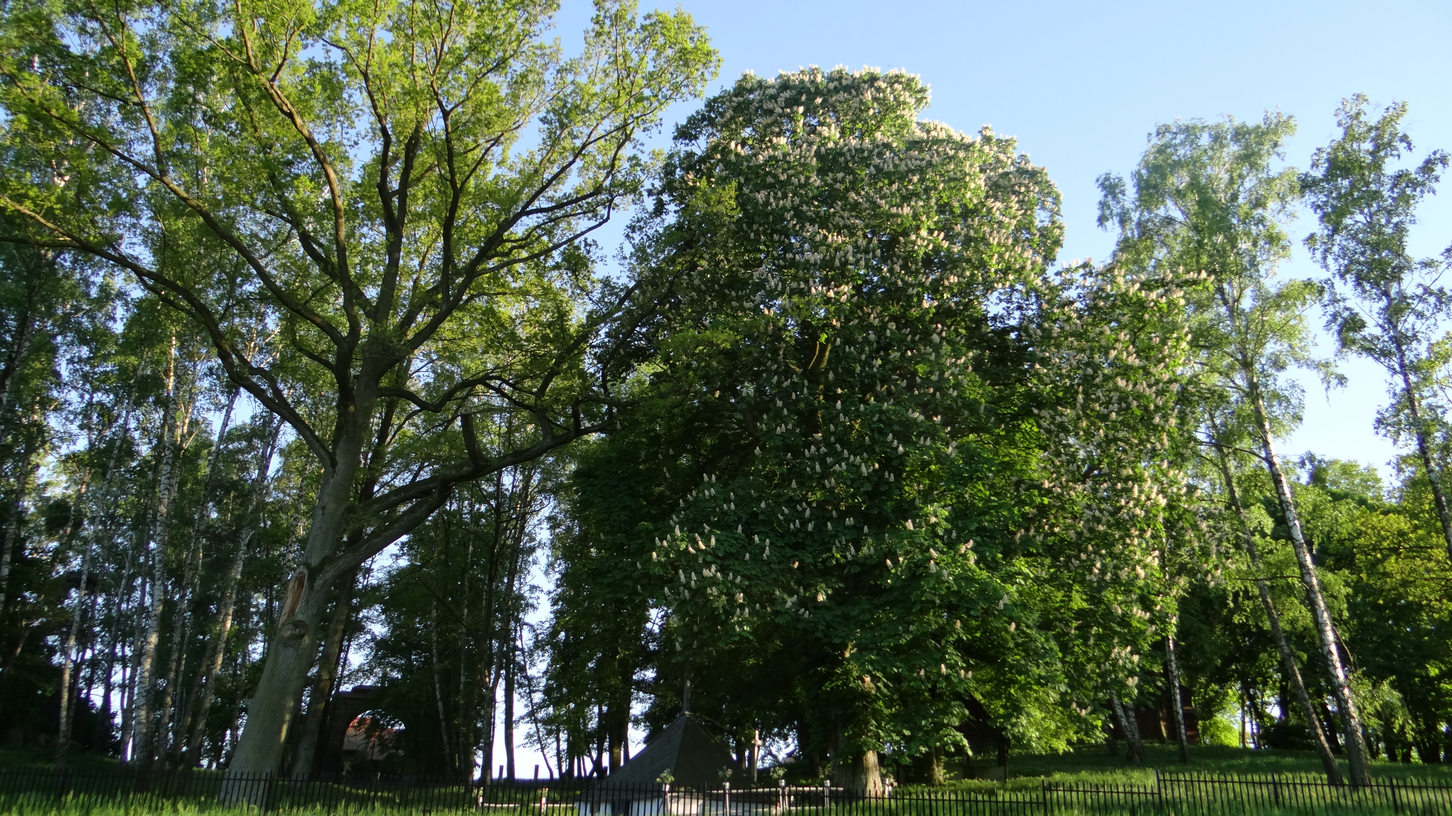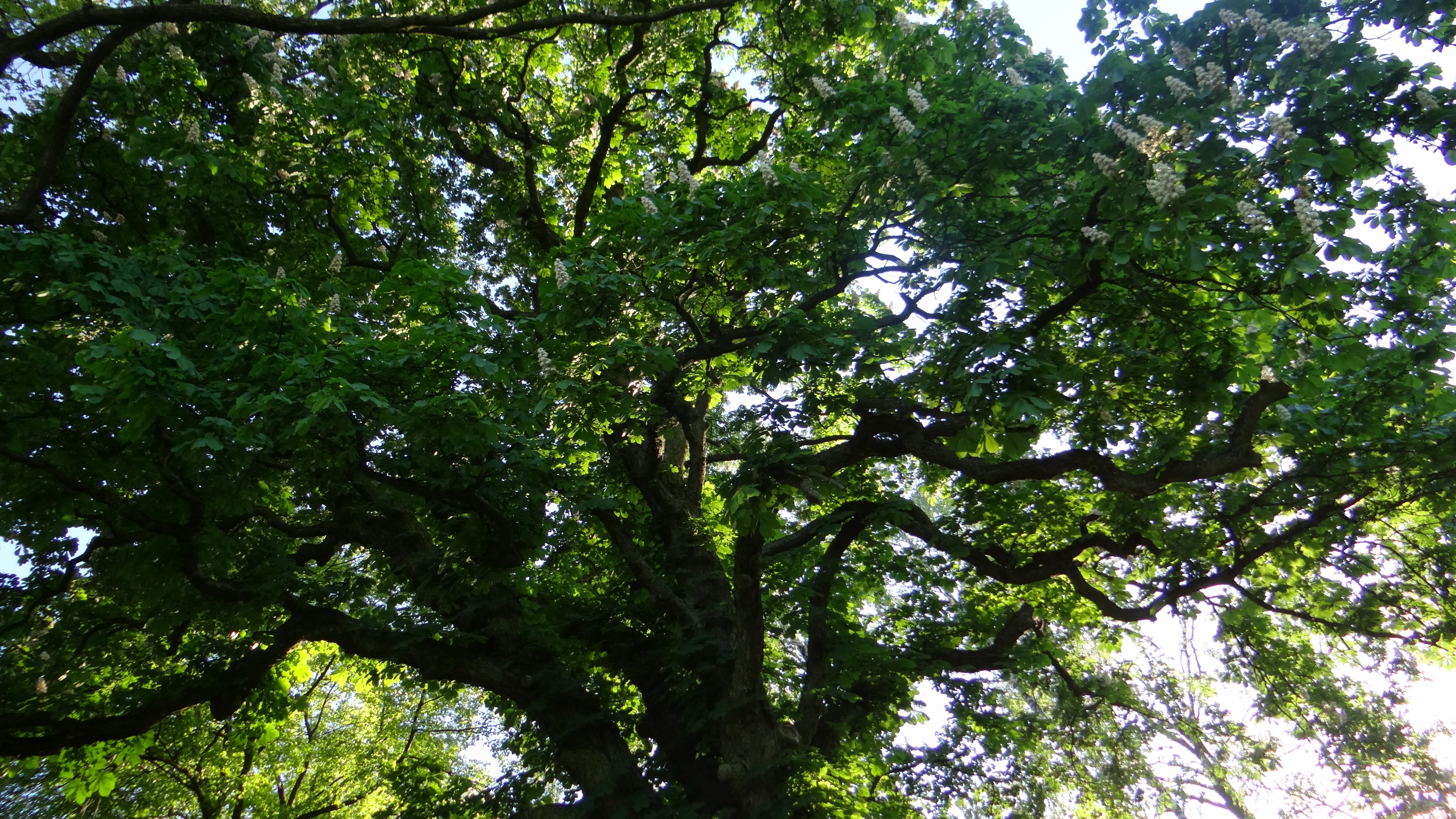 W mojej okolicy, niedaleko stacji meteorologicznej nad Dunajcem, rosną dwa stare, zaprzyjaźnione ze sobą kasztanowce, które razem składają się na wyjątkowo imponujący widok. Nie wiem ile mogą mieć lat, ale na pewno grubo ponad setkę, to pomniki przyrody. Zdjęcie zrobiłem 21 maja 2016 roku.