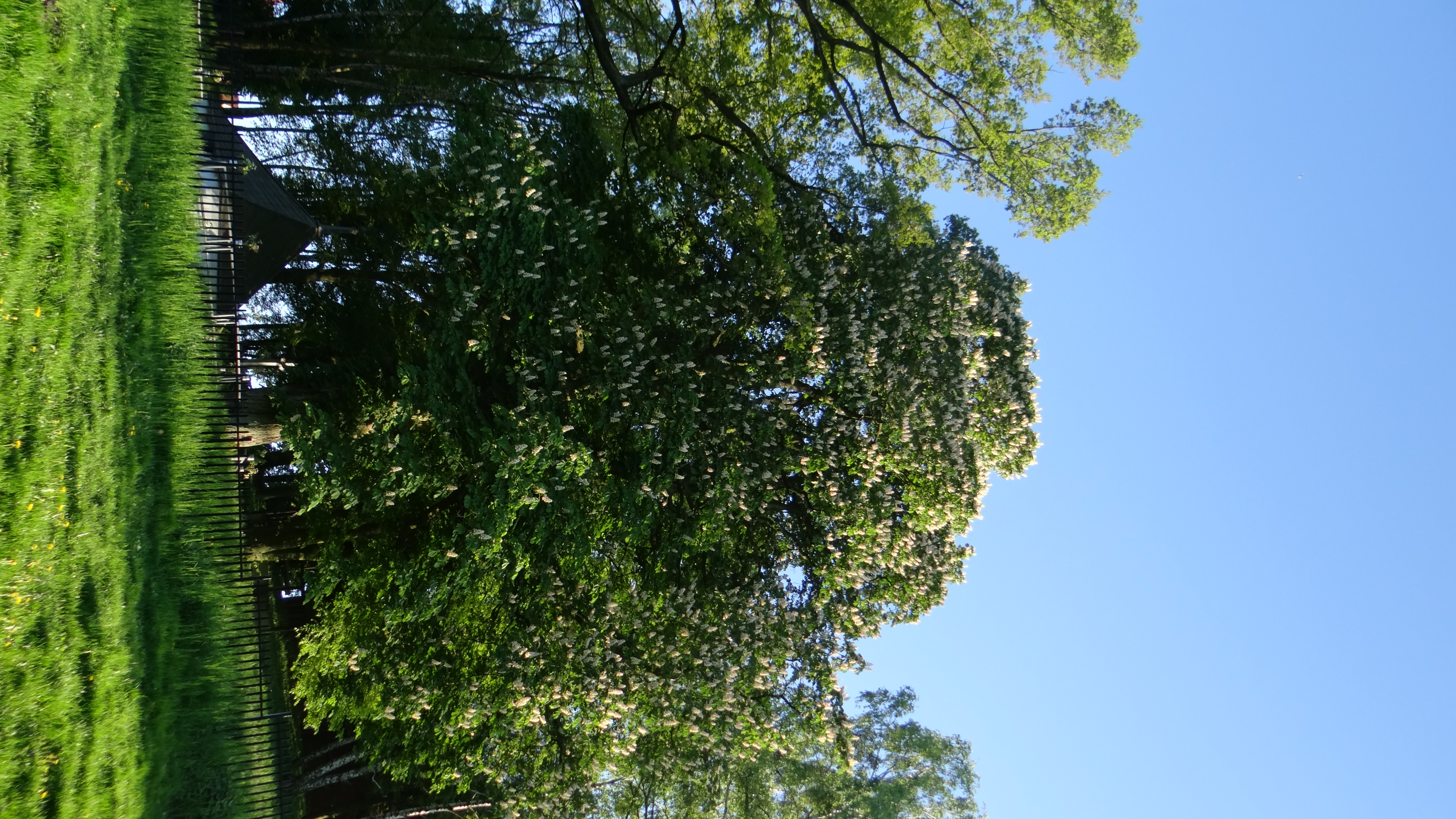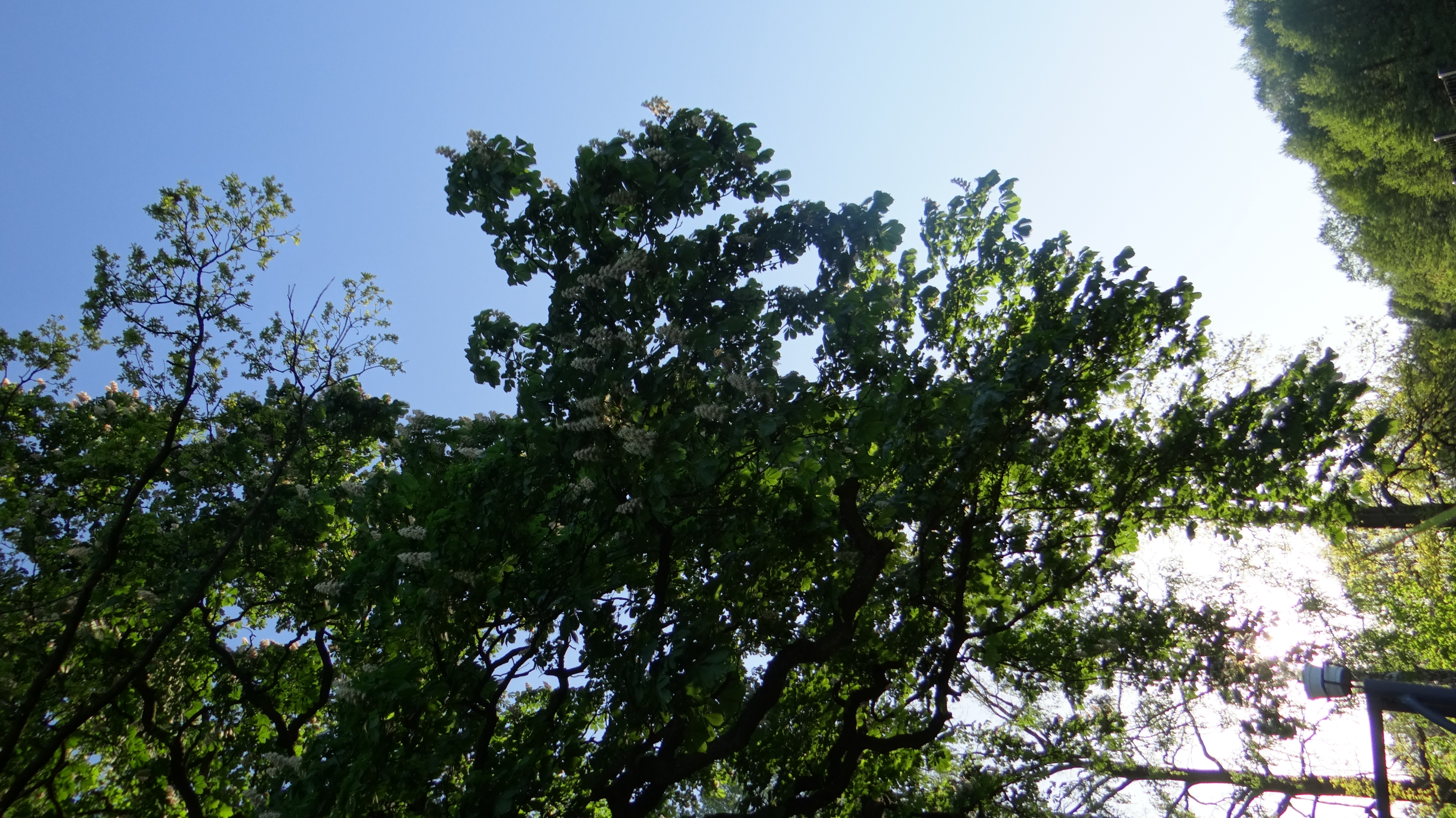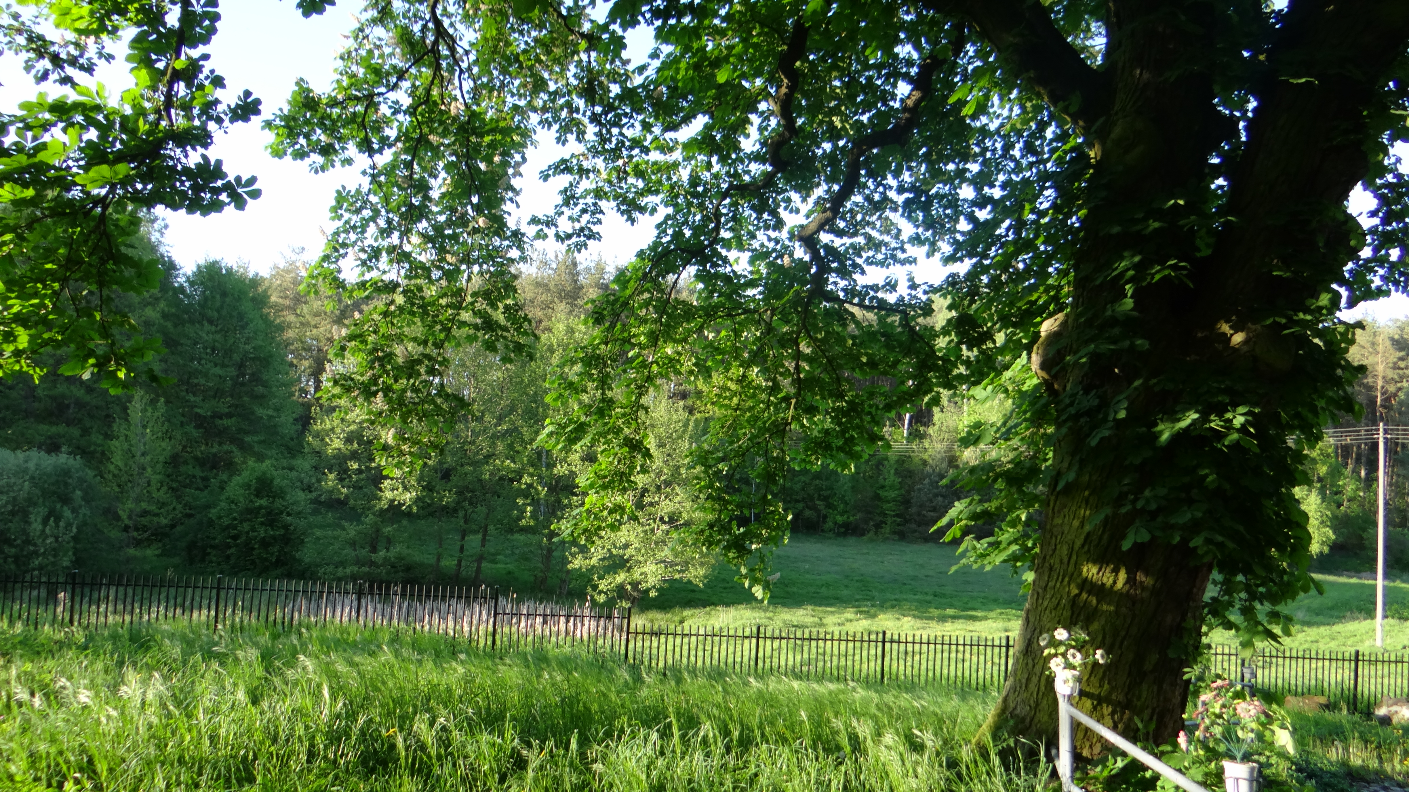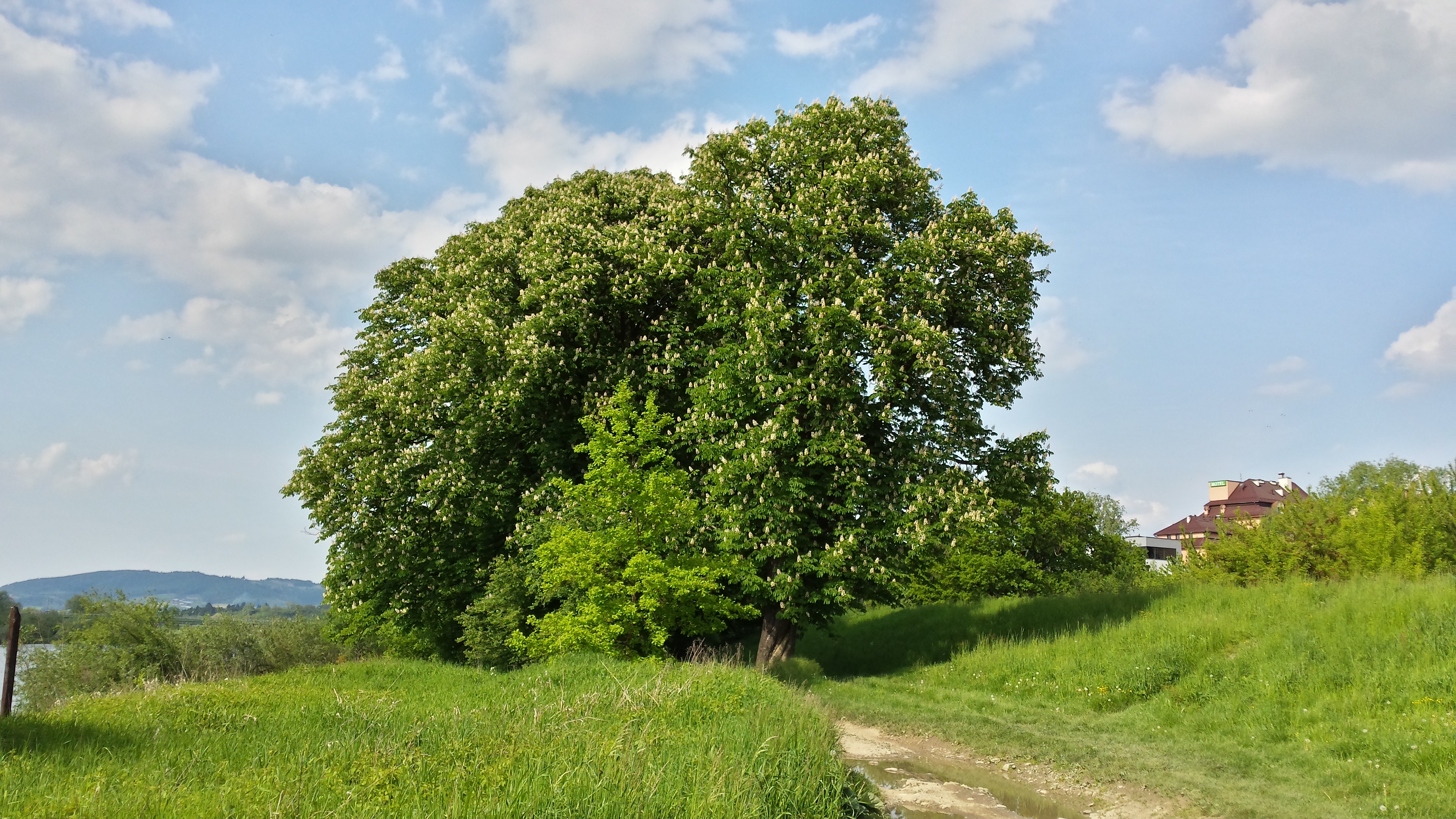 W mojej okolicy, niedaleko stacji meteorologicznej nad Dunajcem, rosną dwa stare, zaprzyjaźnione ze sobą kasztanowce, które razem składają się na wyjątkowo imponujący widok. Nie wiem ile mogą mieć lat, ale na pewno grubo ponad setkę, to pomniki przyrody. Zdjęcie zrobiłem 21 maja 2016 roku.