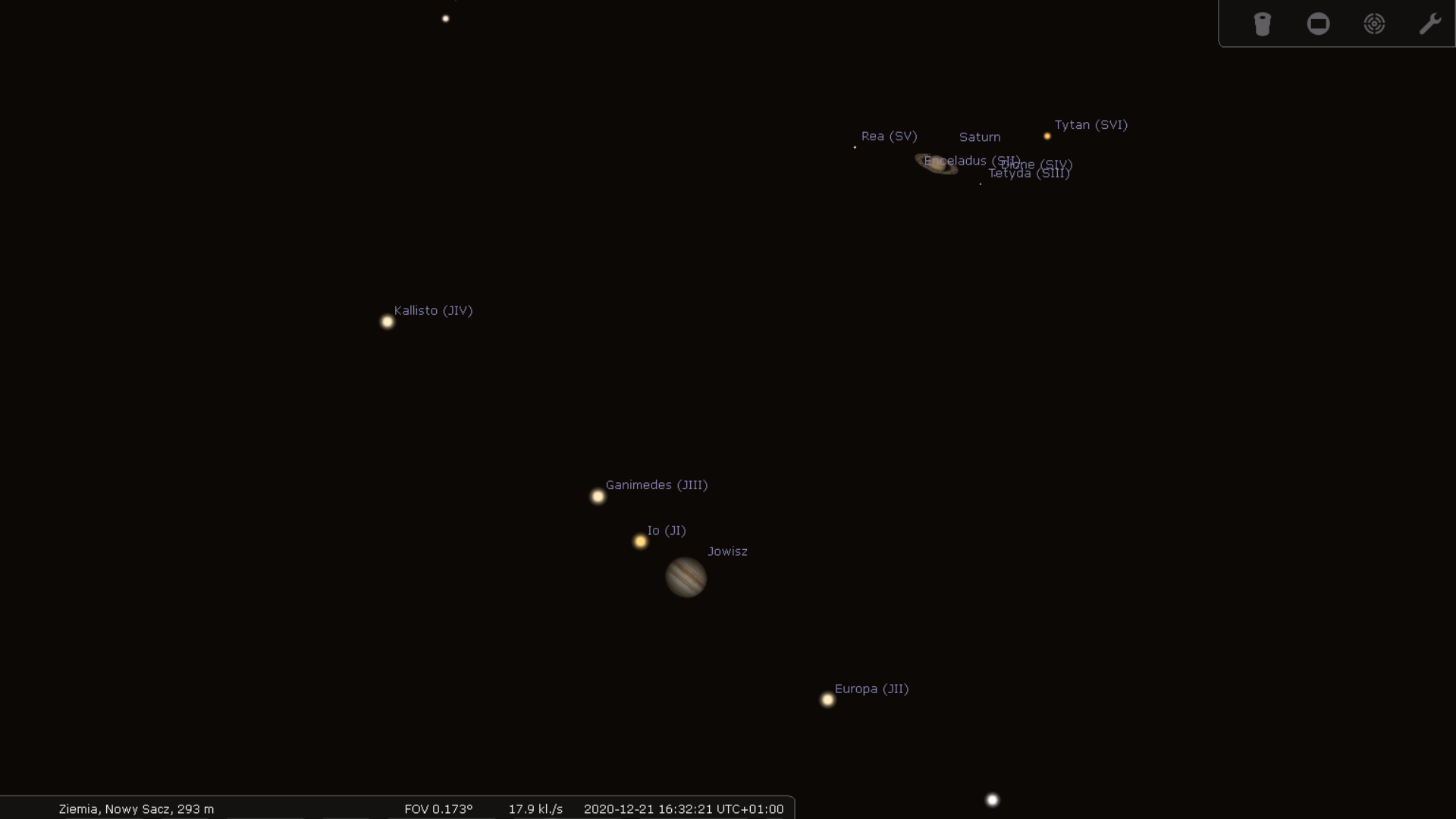 Już na początku tego miesiąca Jowisz i Saturn zbliżyły się do siebie na mniej niż 5 stopni, co sprawiło że zaczęły mieścić się w polu widzenia większości lornetek. Na początku grudnia będą to już tylko 2 stopnie, a w połowie ostatniego miesiąca roku odległość ta stanie się mniejsza od średnicy Księżyca w pełni.