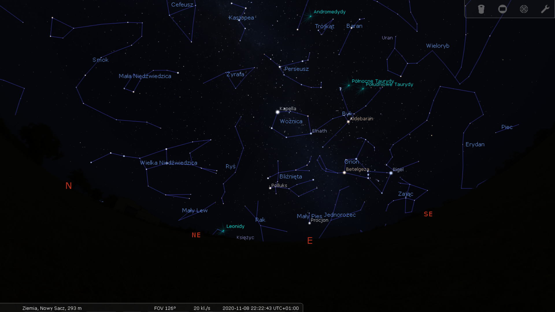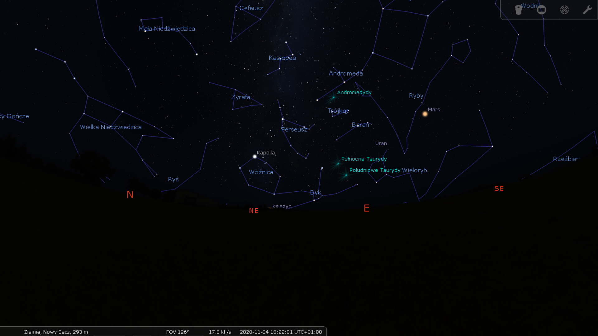 W tym samym czasie na północnym i wschodnim niebie widzimy już pełnię jesieni, która wyraża się w ulokowanej blisko zenitu Kasjopei i Andromedzie, a także wznoszących się coraz wyżej konstelacjach Woźnicy i Byka z Plejadami.