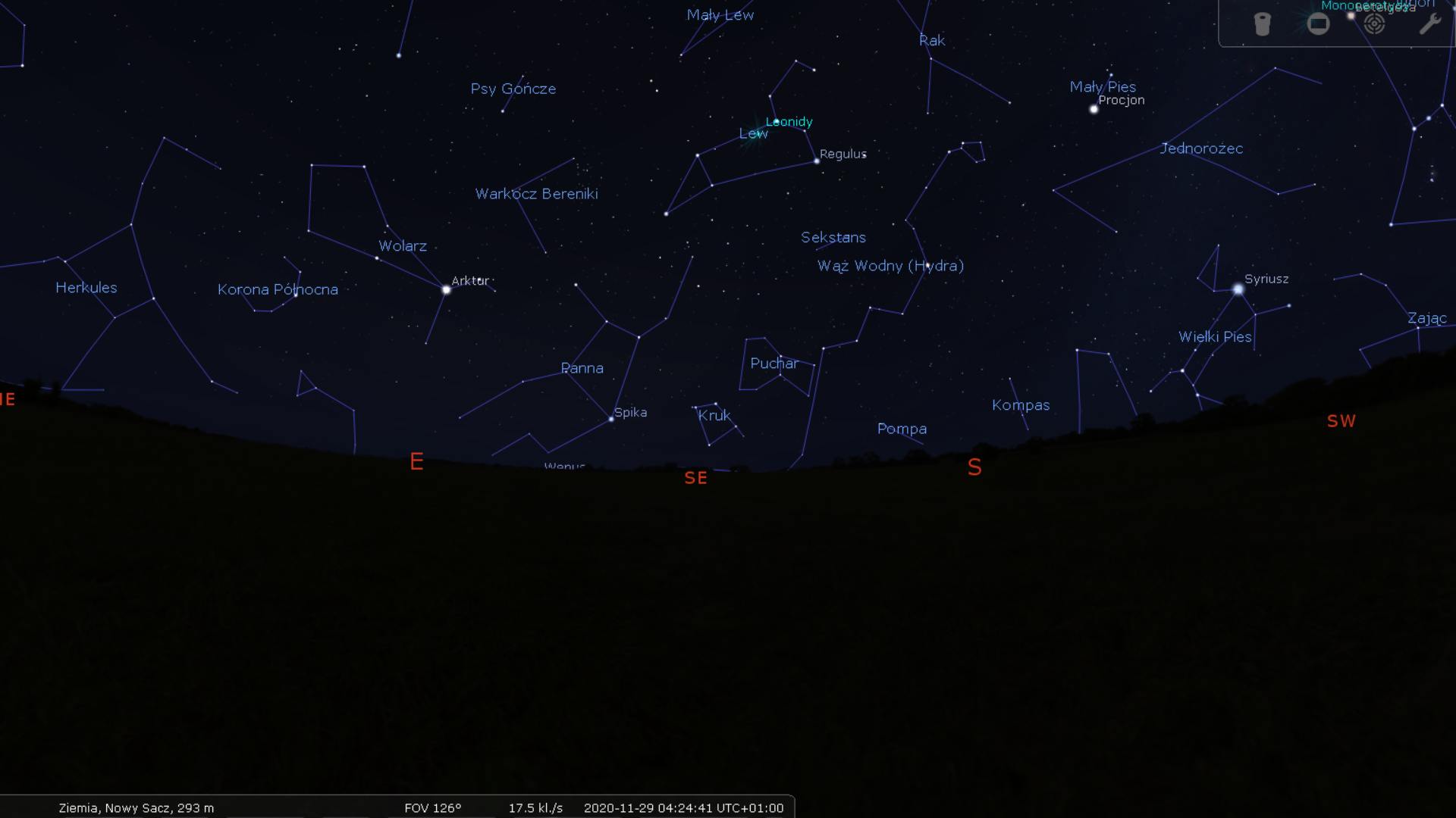 W nocy z 16 na 17 listopada przypadnie maksimum roju meteorów Leonidów. Jest to rój bardzo nieprzewidywalny, który najczęściej szczędzi "spadających gwiazd", ograniczając się do około 10 przelotów na godzinę, jednak co kilka lat obserwuje się jego podwyższoną aktywność i nawet kilkadziesiąt zjawisk. Radiant tego roju znajduje się w gwiazdozbiorze Lwa, stąd widoczność rozpocznie się po godzinie 2:00.