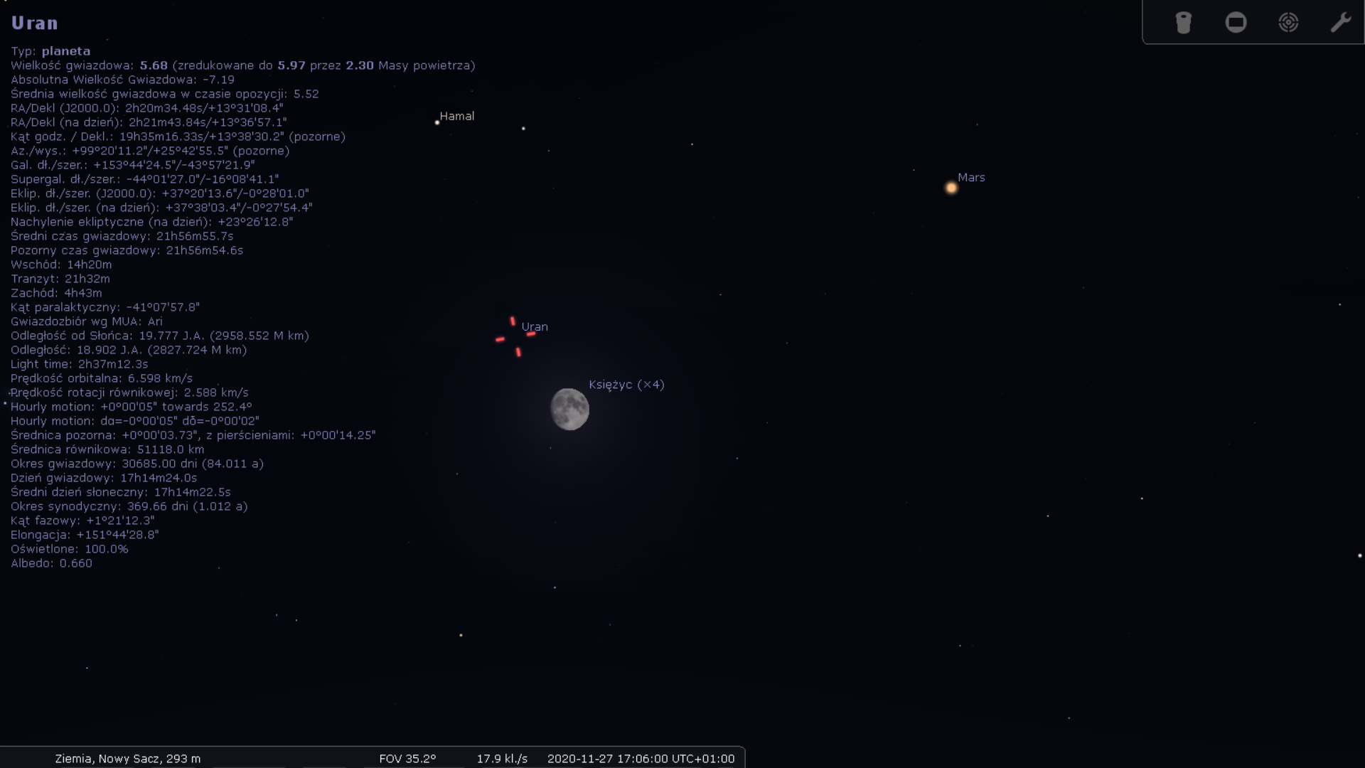 27 listopada przez całą noc w pobliżu Księżyca znajdować się będzie Uran. Razem z naszym naturalnym satelitą, a także Marsem świecącym nieopodal, utworzy trójkąt. W znalezieniu Urana powinna pomóc nam również znajdująca się w pobliżu jasna gwiazda Hamal w konstelacji Barana. Warto spróbować :)
