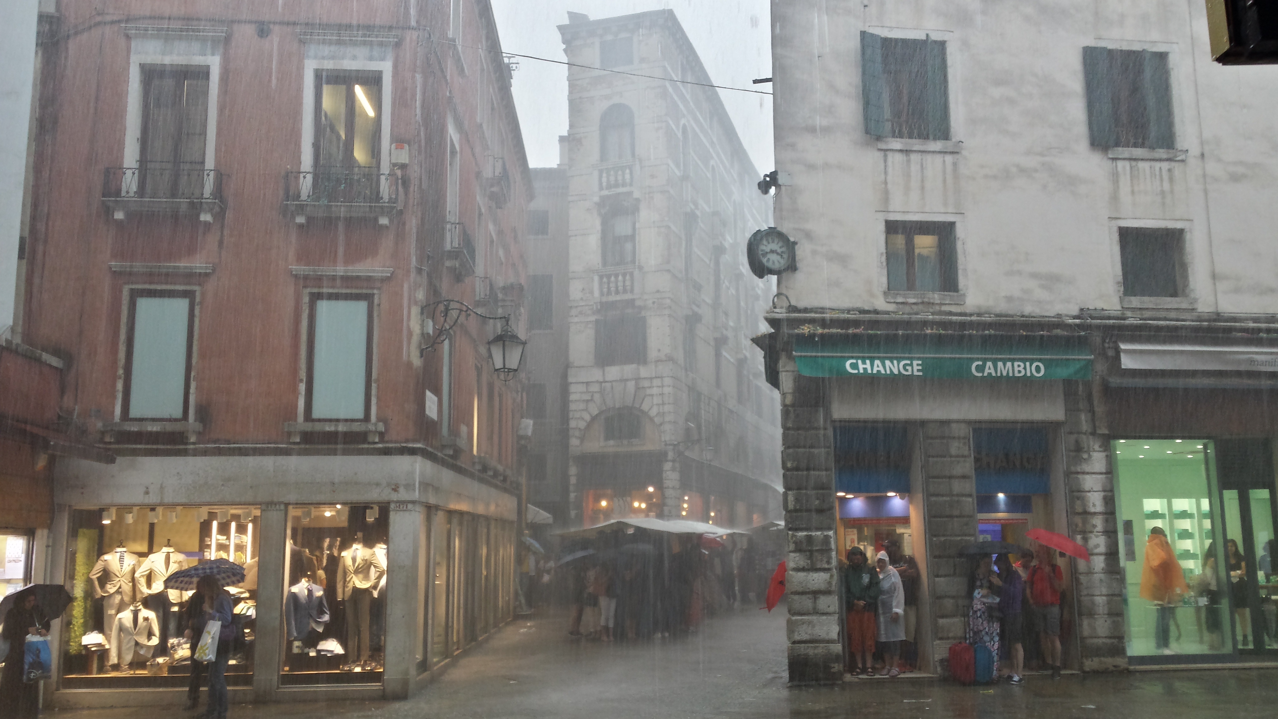 W tym mieście gwar jest tak potężny, że nie słychać było nawet grzmotów, tylko chmury które w końcu wyłoniły się sponad Pałacu Dożów, nie pozostawiły złudzeń. Znajdowaliśmy się akurat blisko głównego kanału, gdzie nie ma żadnych drzew, tylko kamieniczki przy których nijak szukać schronienia. Kiedy lunęło, okoliczne sklepy z miejsca wypełniły się przerażonymi ludźmi, a imigranci sprzedający parasolki i peleryny za taką cenę, jakby wyprodukował je prawdziwy włoski projektant, a nie taki udawany spod Pekinu czy innego Wuhanu, mieli chyba utarg życia. A ja sobie podarowałem. Nigdzie nie dałbym rady się schronić, peleryn nie lubię, parasolki strzelały w górę tak szczelnie, że możnaby po nich przechodzić... trudno, zmoknę. A że zmokłem do suchej nitki, tak absolutnie, to już inna sprawa. Woda nie brudzi i nie zepsuła mi dobrego humoru. Ci wszyscy panikarze też zmokli, inaczej się nie dało.