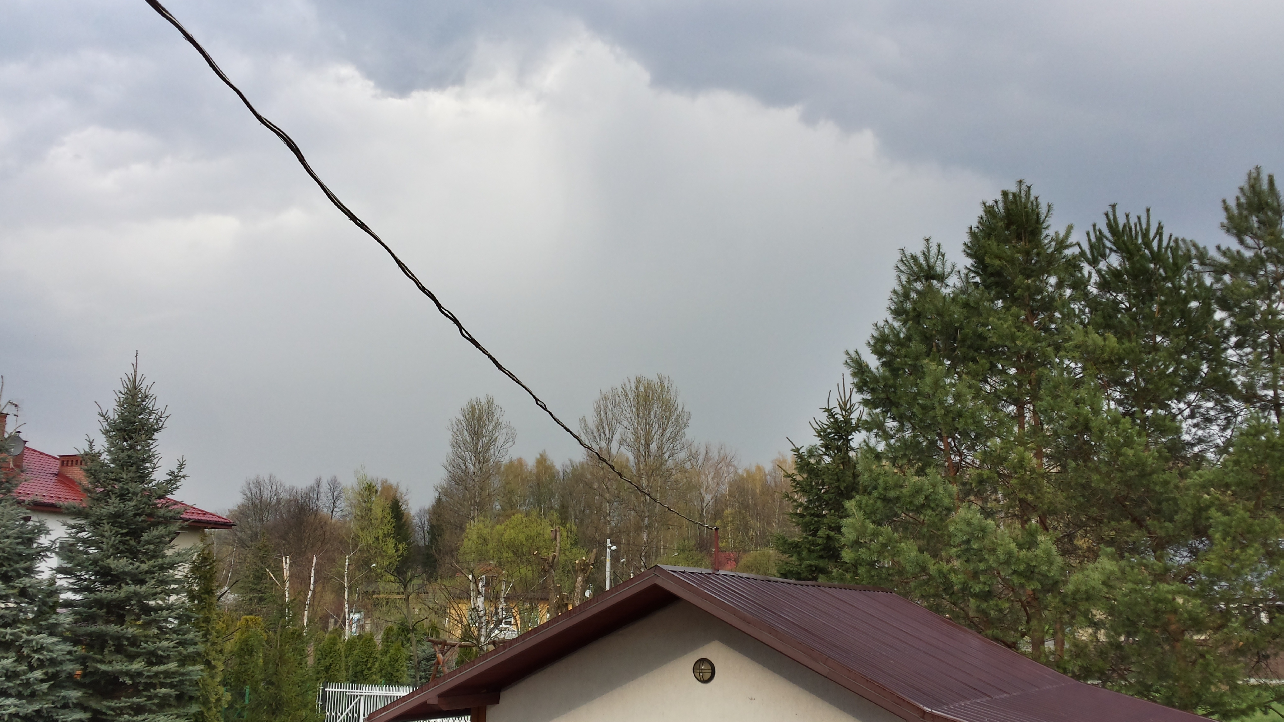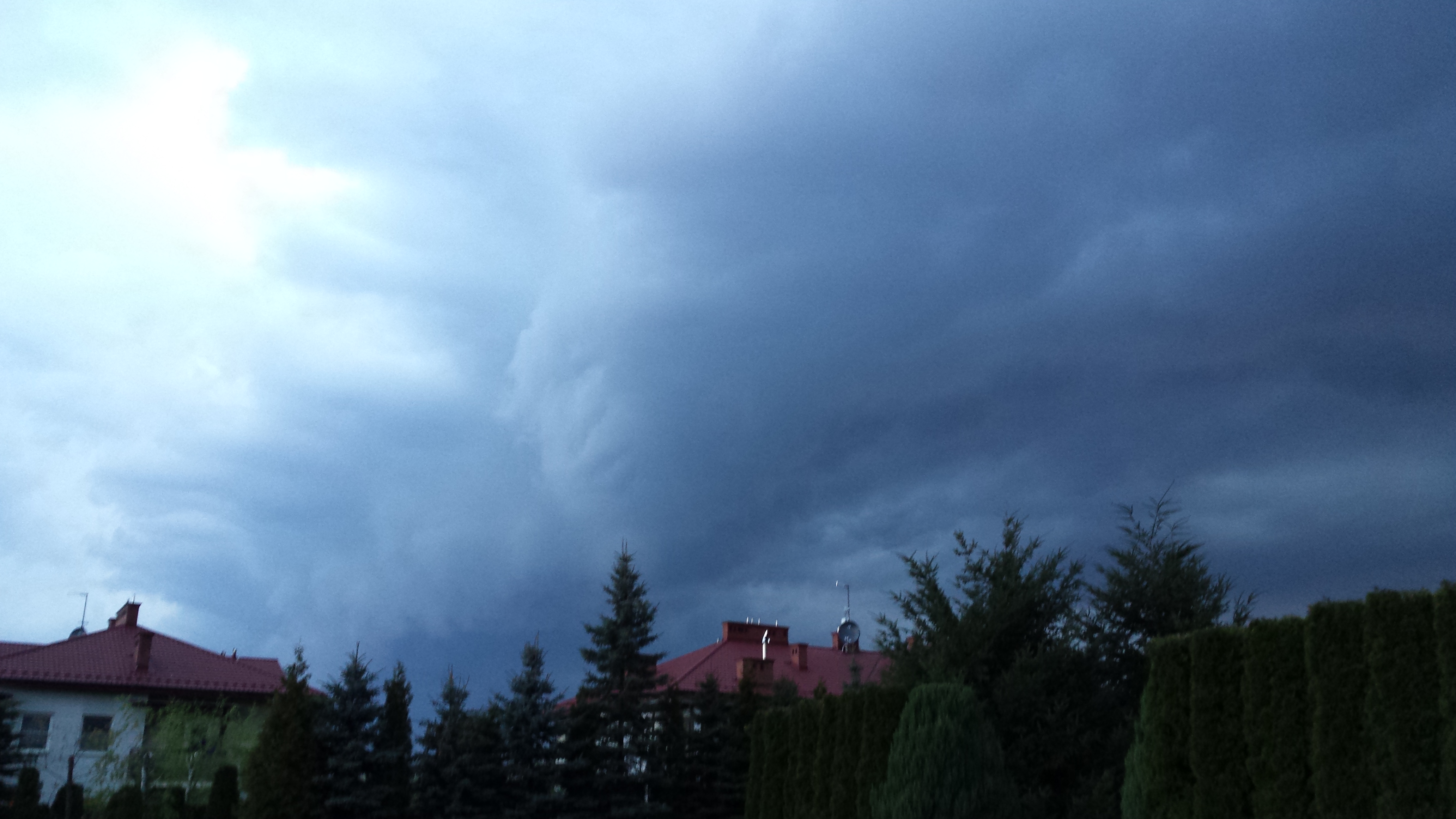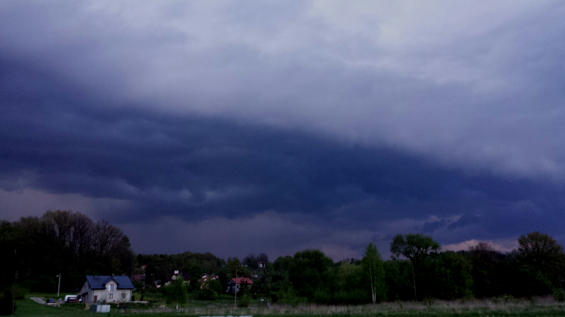 Wieczorem, kiedy zrobiło się już ciemno, widziałem kilka odległych żółtych błyskawic (już bez grzmotów), gdy burza przesuwała się na południe. Lepsze widoki miałem następnego dnia, 5 maja, kiedy słoneczny, lekko upiększony drobnymi chmurkami dzień zupełnie nie zdradzał tego, co zobaczę wieczorem. Kiedy około 19:00 się zachmurzyło i zobaczyłem pociemnienie nieba na wschodzie, nie spodziewałem się że stamtąd coś mnie dosięgnie, od tamtej strony rzadko napływają do mnie burze. Tym razem jednak racja była połowiczna. Nie było bijących piorunów, a deszczyk pokropił bardzo lekko, ale chmura... napędziła emocje. Taki szelfik zjawił się nade mną tego majowego wieczora.