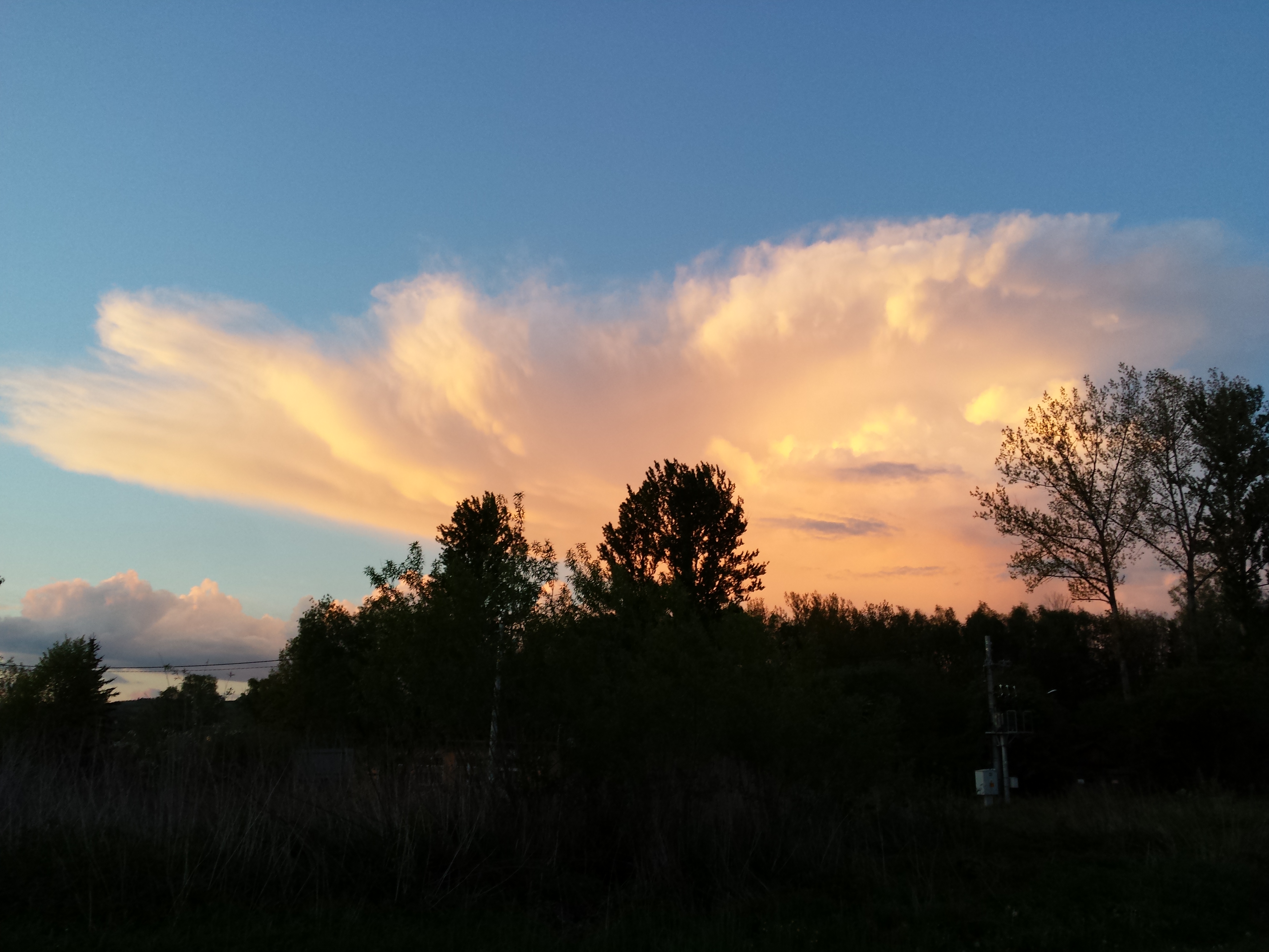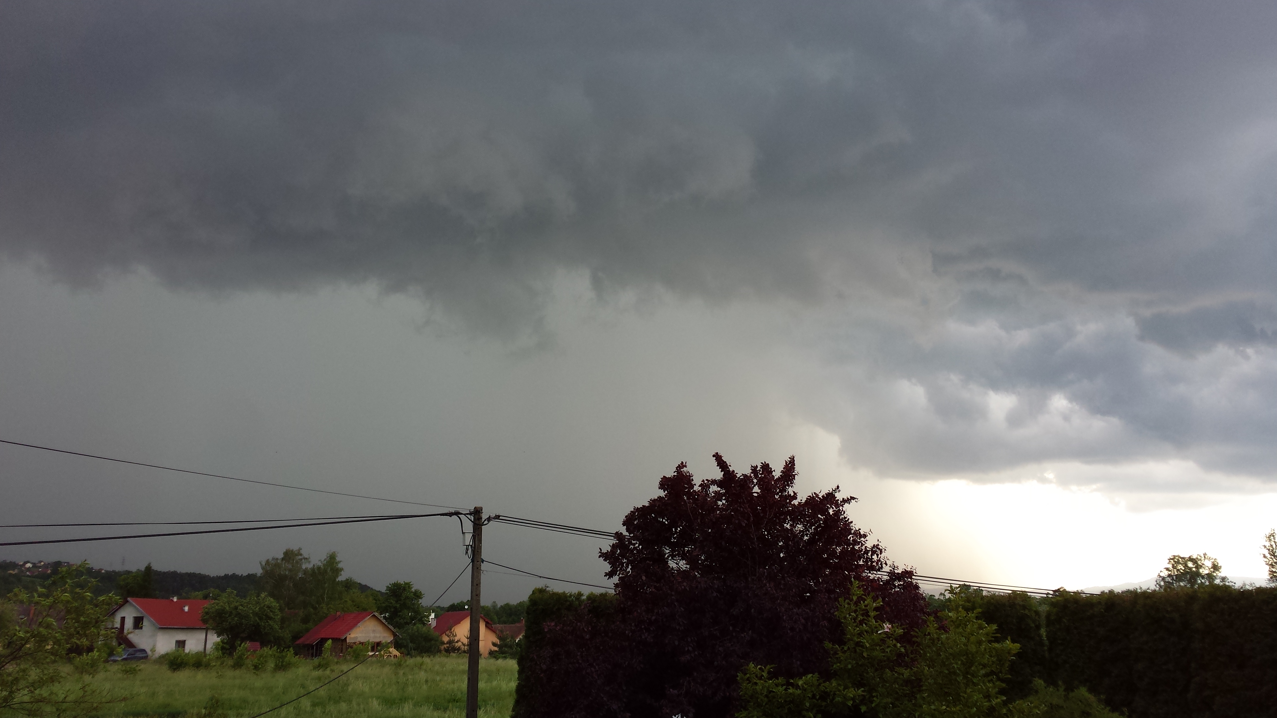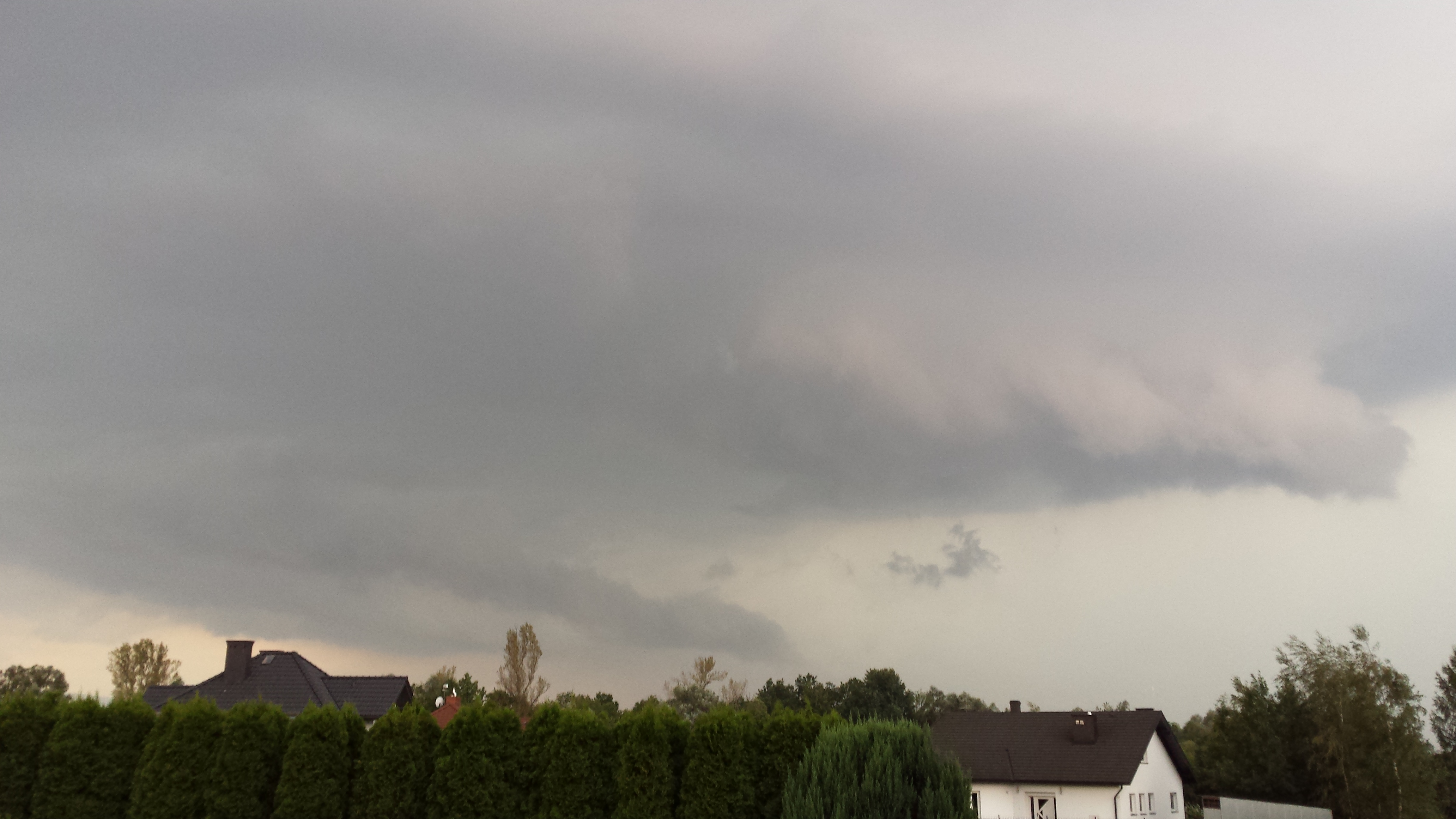 Wieczorem, kiedy zrobiło się już ciemno, widziałem kilka odległych żółtych błyskawic (już bez grzmotów), gdy burza przesuwała się na południe. Lepsze widoki miałem następnego dnia, 5 maja, kiedy słoneczny, lekko upiększony drobnymi chmurkami dzień zupełnie nie zdradzał tego, co zobaczę wieczorem. Kiedy około 19:00 się zachmurzyło i zobaczyłem pociemnienie nieba na wschodzie, nie spodziewałem się że stamtąd coś mnie dosięgnie, od tamtej strony rzadko napływają do mnie burze. Tym razem jednak racja była połowiczna. Nie było bijących piorunów, a deszczyk pokropił bardzo lekko, ale chmura... napędziła emocje. Taki szelfik zjawił się nade mną tego majowego wieczora.