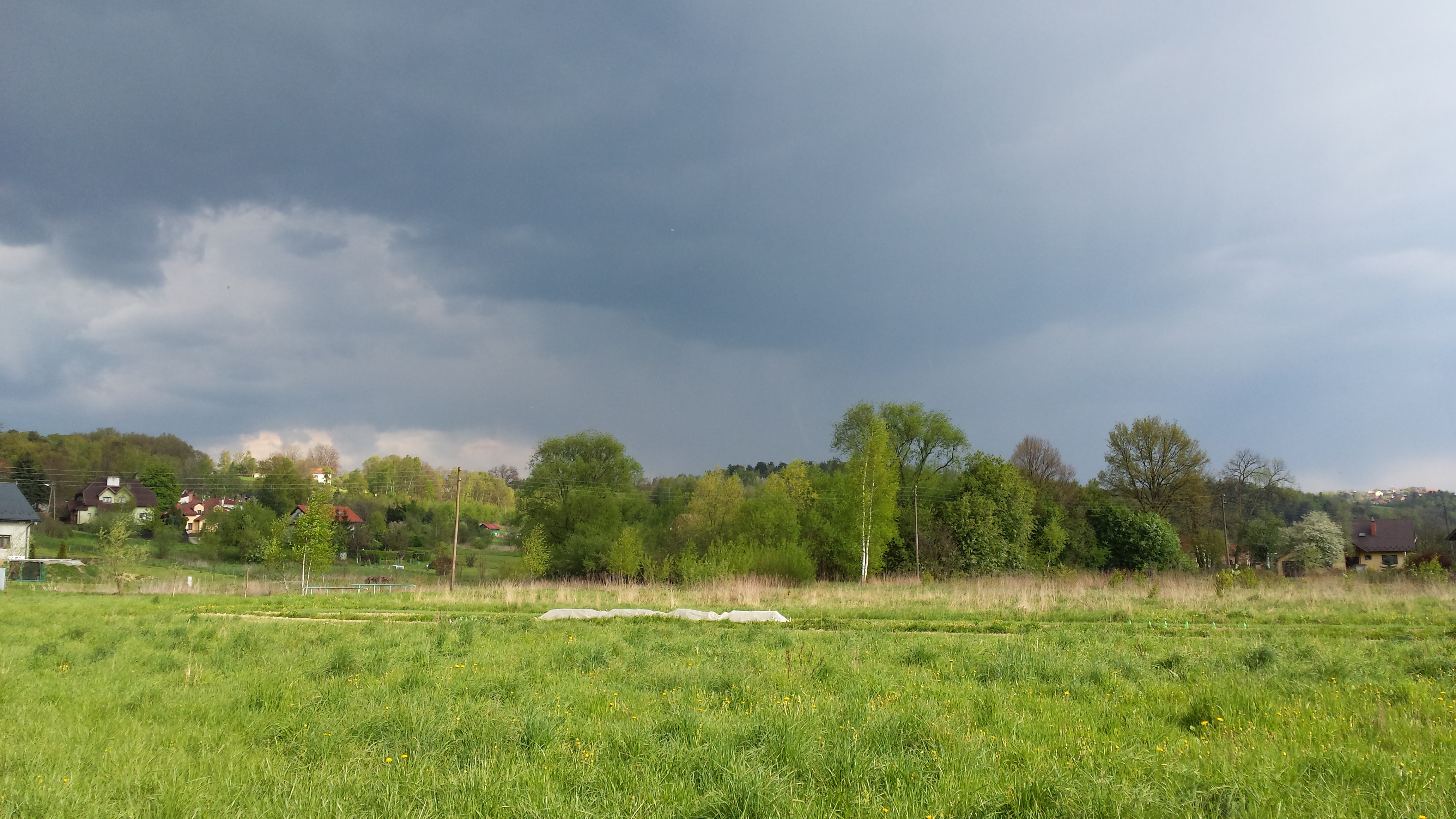 I wtedy przyszedł maj. Zielony, łagodny maj. Tak jak w piosence, która przekonuje nas, że Słońce w maju może i powinno czasem łączyć się z deszczem. Taka była właśnie I dekada. Może za mało deszczowa, a za bardzo pseudodeszczowa, jednak choćby za to ujęcie tematu tradycyjnych "majowych deszczyków" należy się jej uznanie. Łącząca w sobie łagodną wiosnę z ruchliwym latem pogoda nie zapominała także o burzach, które kilka razy pojawiły się w mojej okolicy. Najpierw 4 maja, w wolnym dniu kiedy starałem się jak najbardziej nasycić widokami przepięknej wiosny i sporo pojeździłem zahaczając o Beskid. Po powrocie kilka razy zagrzmiało i na wschód ode mnie pojawiła się ciemniejsza chmura. Obyło się bez deszczu i bliskich wyładowań, ale samo spojrzenie na ten pejzaż napawało optymizmem.