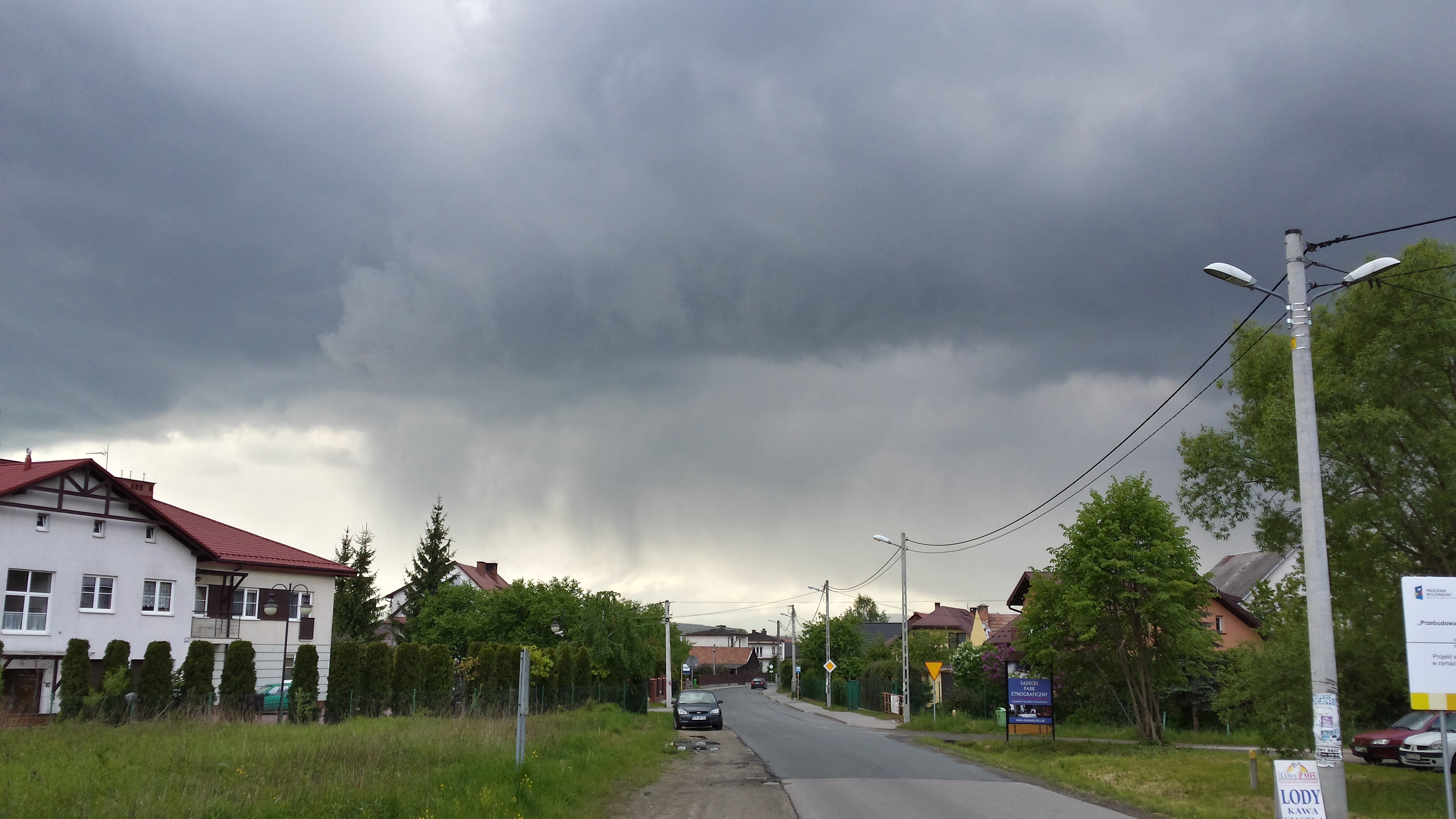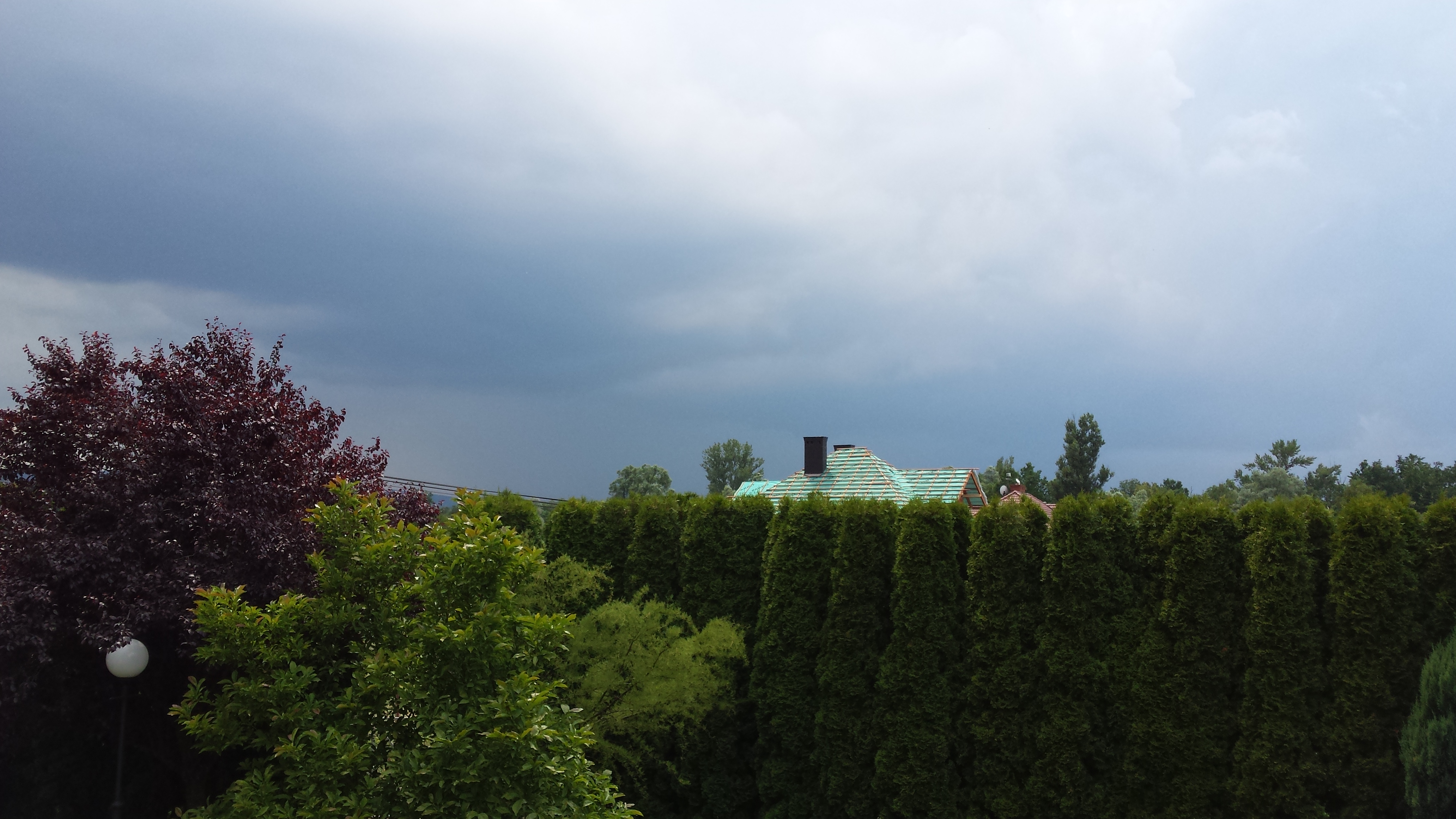 Tak oto dotarliśmy do III dekady, która na dobre przeniosła maj 2016 na ciepłą stronę mocy. Stanowiąc bardzo miły pomost między wiosną a latem, dała wiele bardzo ciepłych dni, dużo Słońca i żywego nieba, jak również burze. Podczas tej dekady miałem dość dużo nauki, bo zaczynało się wystawianie ocen, a z powodu czekającego mnie wkrótce wyjazdu, musiałem zatroszczyć się o wszystko zawczasu. Kończyłem kilka przedmiotów typu fizyka, chemia czy biologia, toteż ocena jaką miałem mieć wystawioną na koniec roku, miała być też oceną końcową, którą zobaczę na świadectwie w kwietniu 2018. Nie zabrakło mi jednak ochoty, by chociaż wieczorami trochę poużywać pięknej pogody. A na burze nie musiałem długo czekać. Dzień 30 maja 2016 zmienił dotychczasowe oblicze niedawno rozpoczętego sezonu burzowego, który jak dotąd stawiał bardziej na ilość niż jakość. Burza, która przeszła w przedostatnim dniu miesiąca, należy do najbardziej ognistych, jakie pojawiły się w maju. Tego dnia na szczęście kończyłem wcześnie i mogłem zaobserwować piękne oberwanie chmury i kłębiące się obłoki strzelające błyskawicami. Burza postępowała stopniowo. Około 12:30 jak zwykle wracałem na nogach do domu, kiedy grzmoty przybrały na sile (coś tam straszyło już godzinę wcześniej) i niebo nabrało już takiego złowrogiego koloru. Podjąłem decyzję, aby zboczyć z mojej drogi i pójść na przystanek, gdzie akurat za chwilę miał pojawić się autobus jadący w stronę mojego osiedla. Słusznie, bo do uderzenia idącej od południowego-wschodu nawałnicy pozostał kwadrans, nie zdążyłbym nawet gdybym biegł. A wtedy byłby kłopot. Chmura stawała się bardzo ciemna. Rozciągała się na dużej przestrzeni, a w najdalej wysuniętym punkcie na wschód ode mnie widziałem jak coś się bardzo kotłuje, zbiera, tak jak na grad. Nie myliłem się. Błyskawice stawały się coraz intensywniejsze. Przydarzyło się kilka ładnych wyładowań, ale nie miałem ich jak sfotografować. Nie mam okien na piętrze w kierunku wschodnim, a z parteru widok zasłaniały mi jabłonki i wiśnie. Tak nawałnica prezentowała się chwilę przed uderzeniem. Nie mogę jej darować, że strefa z błyskawicami poszła tyłem i nie miałem dobrych warunków do obserwacji.