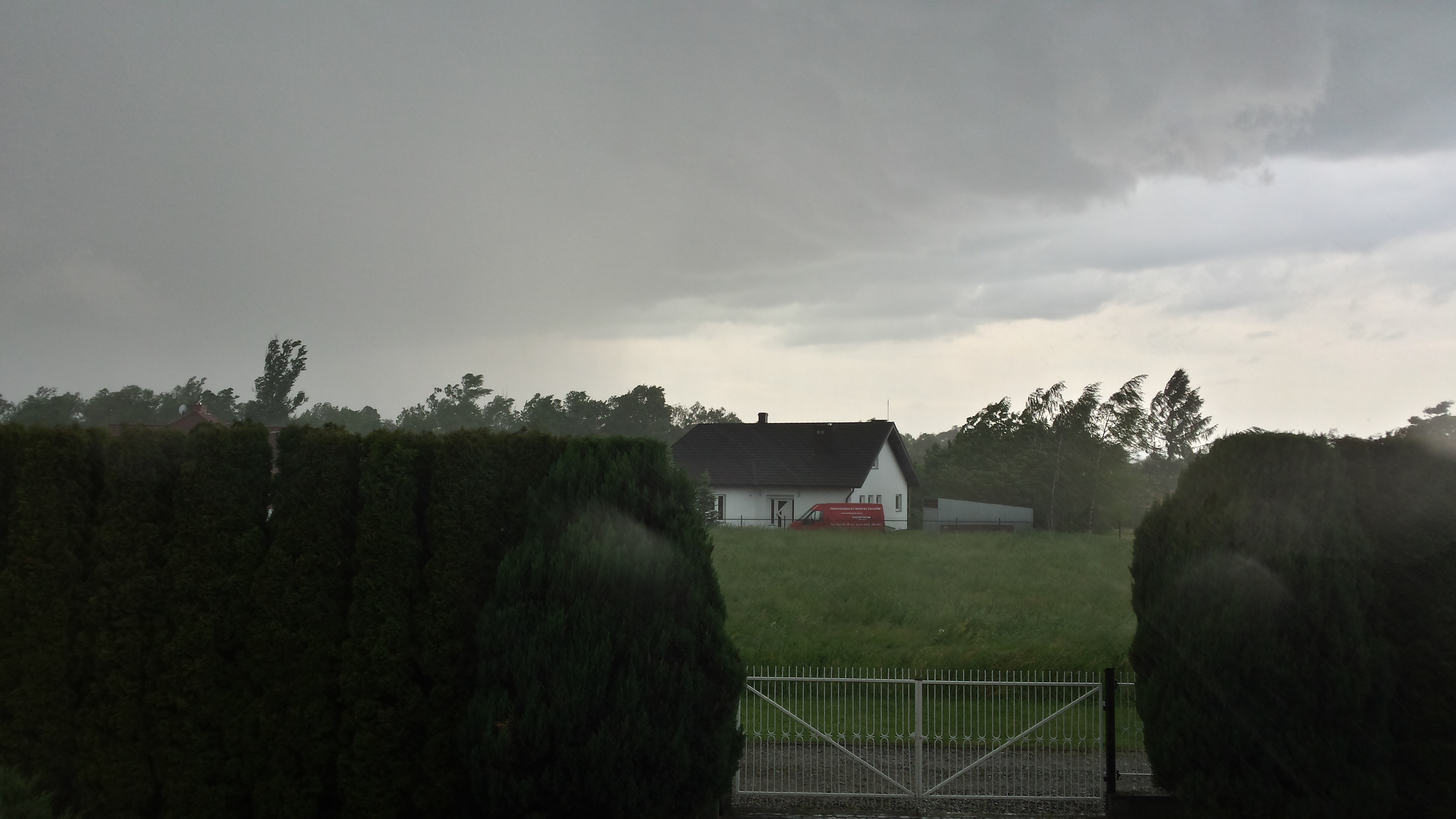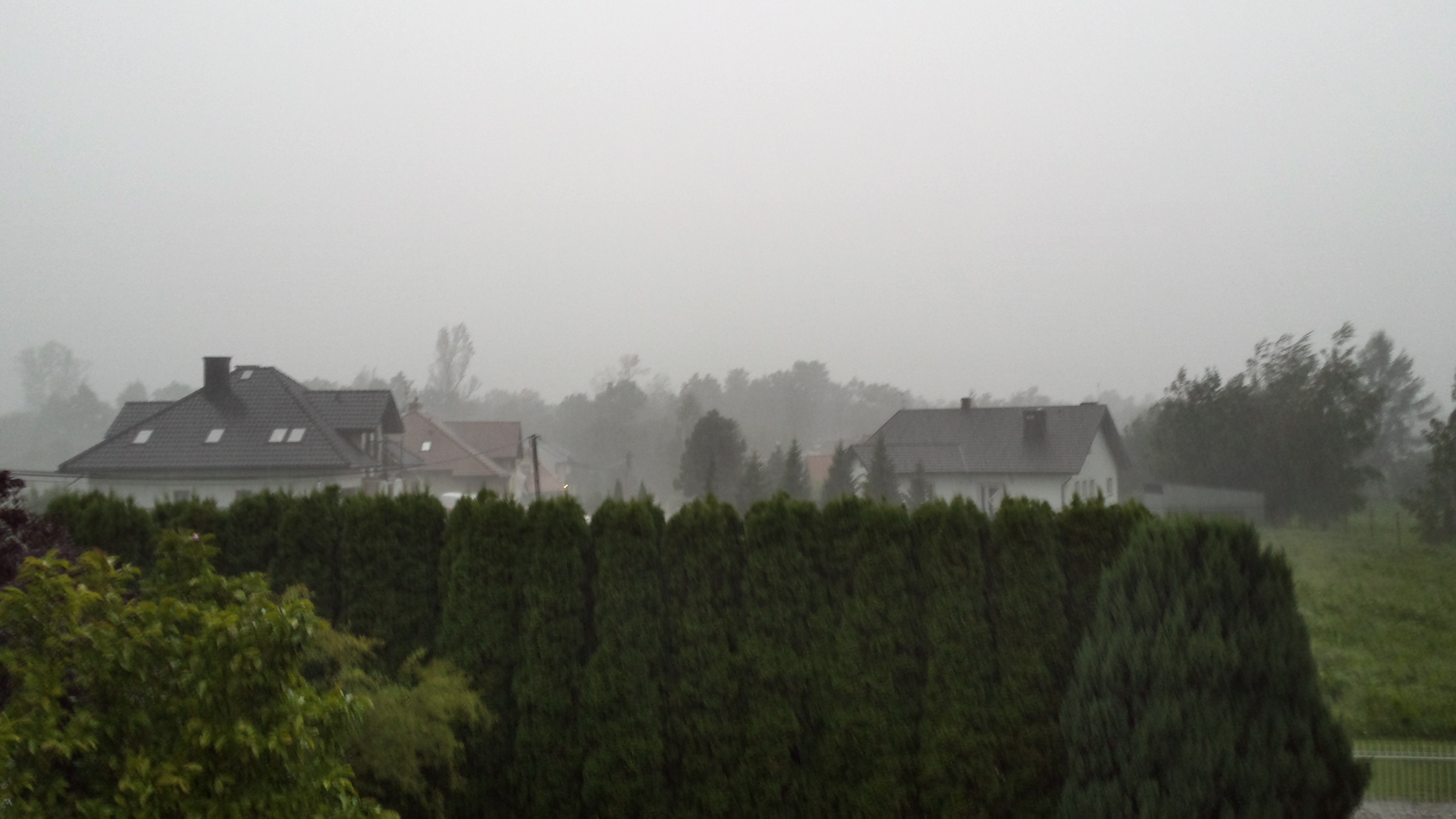 W szczytowym momencie opad zacinał prawie poziomo, a w konsekwencji przypuścił atak na mój domofon - kiedy dostała się do niego woda, zaczął dzwonić bez przerwy i dopiero wieczorem udało się go przywołać do porządku. Burza przesuwała się na zachód, a grzmoty były słyszalne jeszcze długo po ustaniu ulewy.