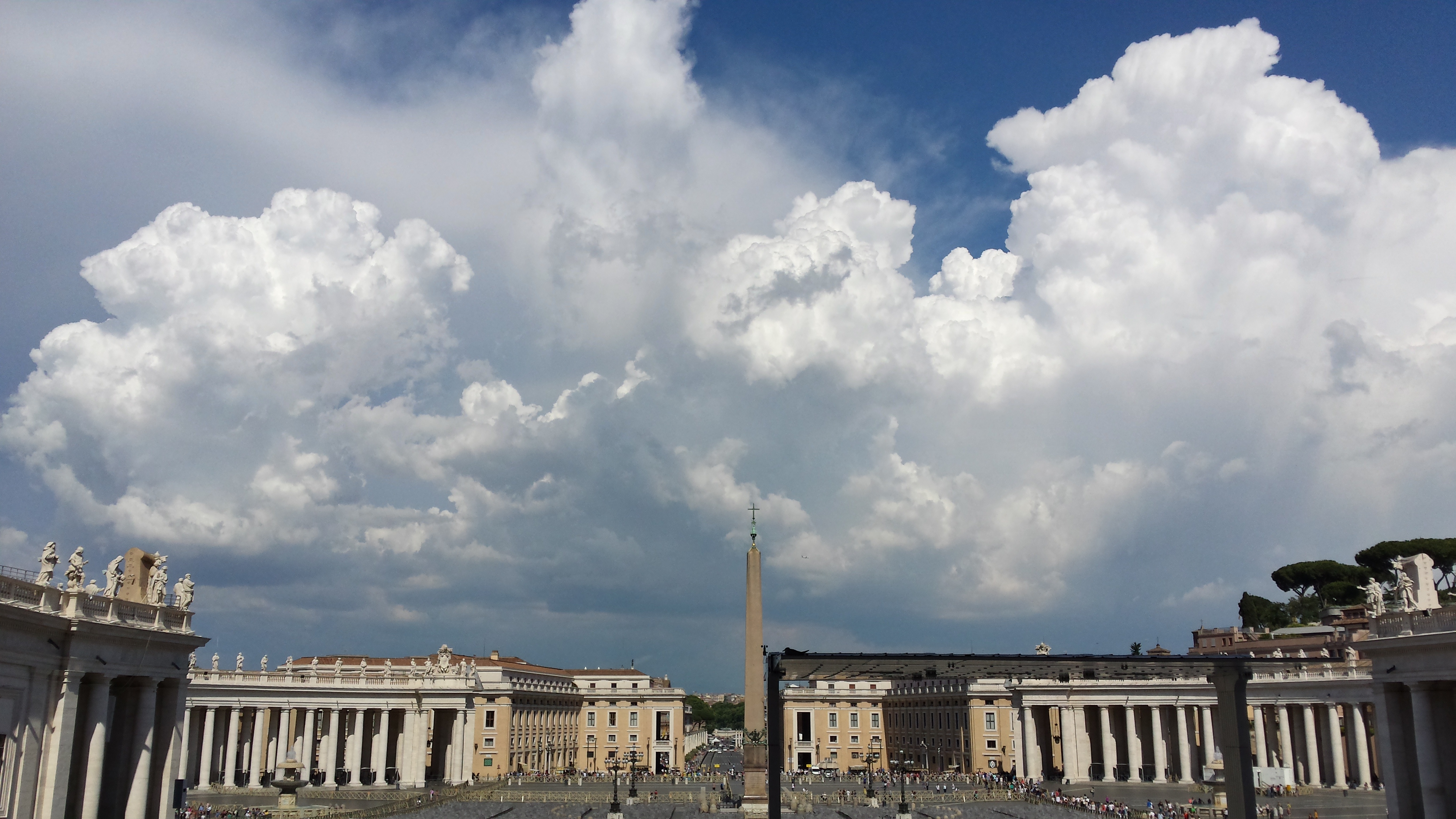 Ten piękny choć suchy czerwiec kojarzy mi się głównie z Euro, ale także z kolejną świetną podróżą. Kolejną w moim życiu do Włoch, tym razem w gronie rówieśniczym. Nie był to wyjazd ogólnoszkolny, lecz tylko chętnych osób z klas, które uczył mój wychowawca i jeszcze jeden zaprzyjaźniony z nim historyk, a także nauczyciel niemieckiego, który tworzył wraz z nimi pedagogiczne trio nie do podrobienia. Uzbierało się nas ok. 40 osób i tak dnia 3 czerwca, w pochmurną i deszczową pogodę opuściliśmy Polskę, zmierzając do Słonecznej Italii. Nawet nie wiem kiedy i kto nazwał leżący tam kraj „Słoneczną Italią”. Nie będę się o to spierać, ale fakty są takie że w kolejnych dniach Nowy Sącz okazał się zdecydowanie bardziej słonecznym miejscem, niż jakiekolwiek odwiedzone przeze mnie w ojczyźnie Francesco Petrarki i Leonarda da Vinci, gdzie burze nie odstępowały nas niemal na krok. Pierwsza już w drodze z Padwy do Cassino 5 czerwca, sprawiła że pod wpływem normalnej ulewy jak w Nouvel Songe 30 maja 2016, włoscy kierowcy zachowywali się jakby nadciągało tornado, masowo zjeżdżając na pasy awaryjne. Było więcej miejsca dla nas. A najpiękniejsze i tak miało nastać. Burza, która zastała nas w Rzymie 7 czerwca, była bardzo kompromisowa. Z zesłaniem deszczu poczekała aż dokończymy zwiedzanie i wsiądziemy do autokaru, ale zanim tak się stało, wyjątkowo pięknie podkreśliła walory Wiecznego Miasta. To nie był spektakl błyskawic (widziałem tylko jedną) czy innych zjawisk. To był spektakl przepięknych, oświetlonych chmur.