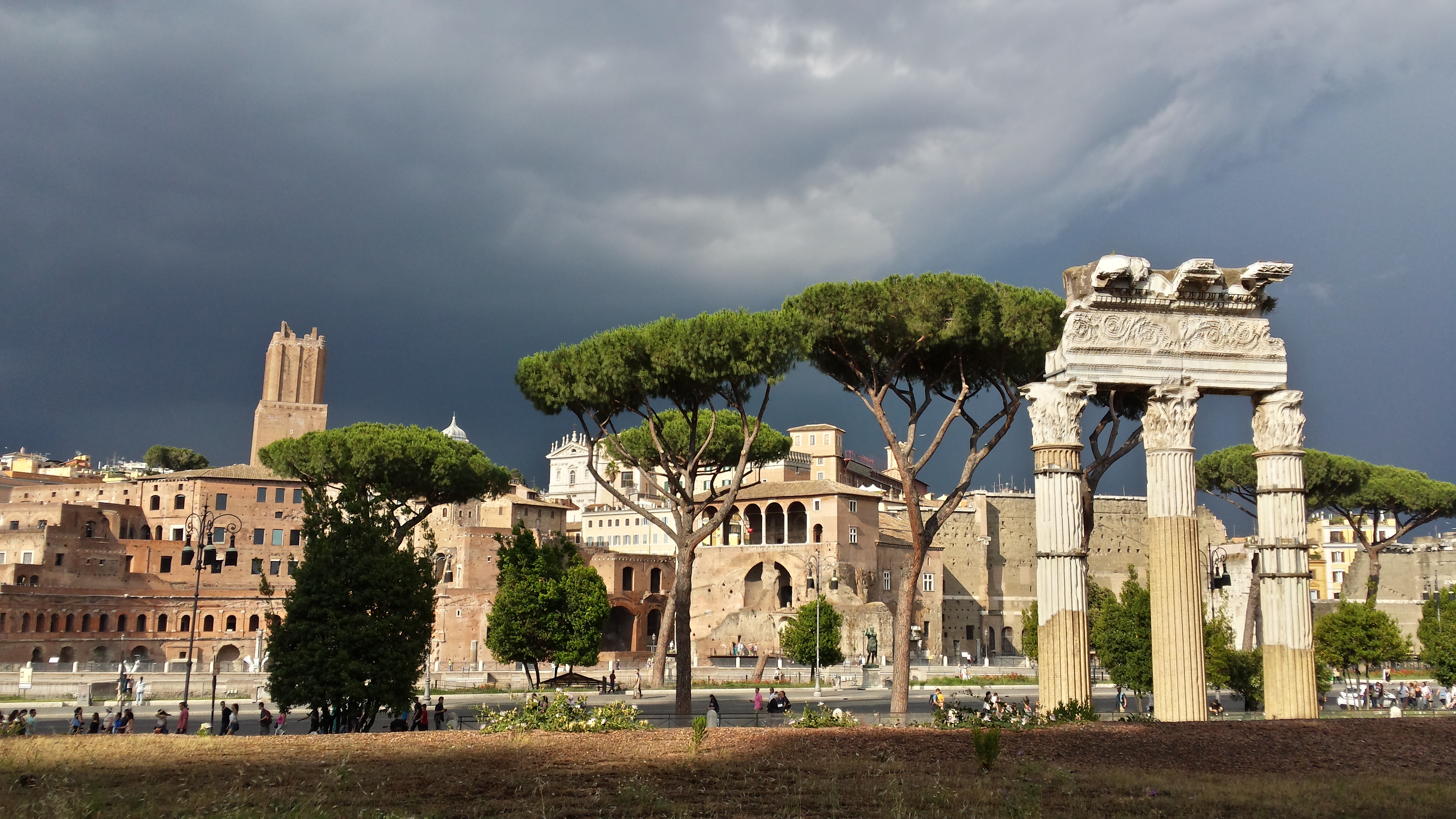 Ruiny Forum Romanum na tle mrocznego, przesiąkniętego burzą nieba, wyglądały zjawiskowo.