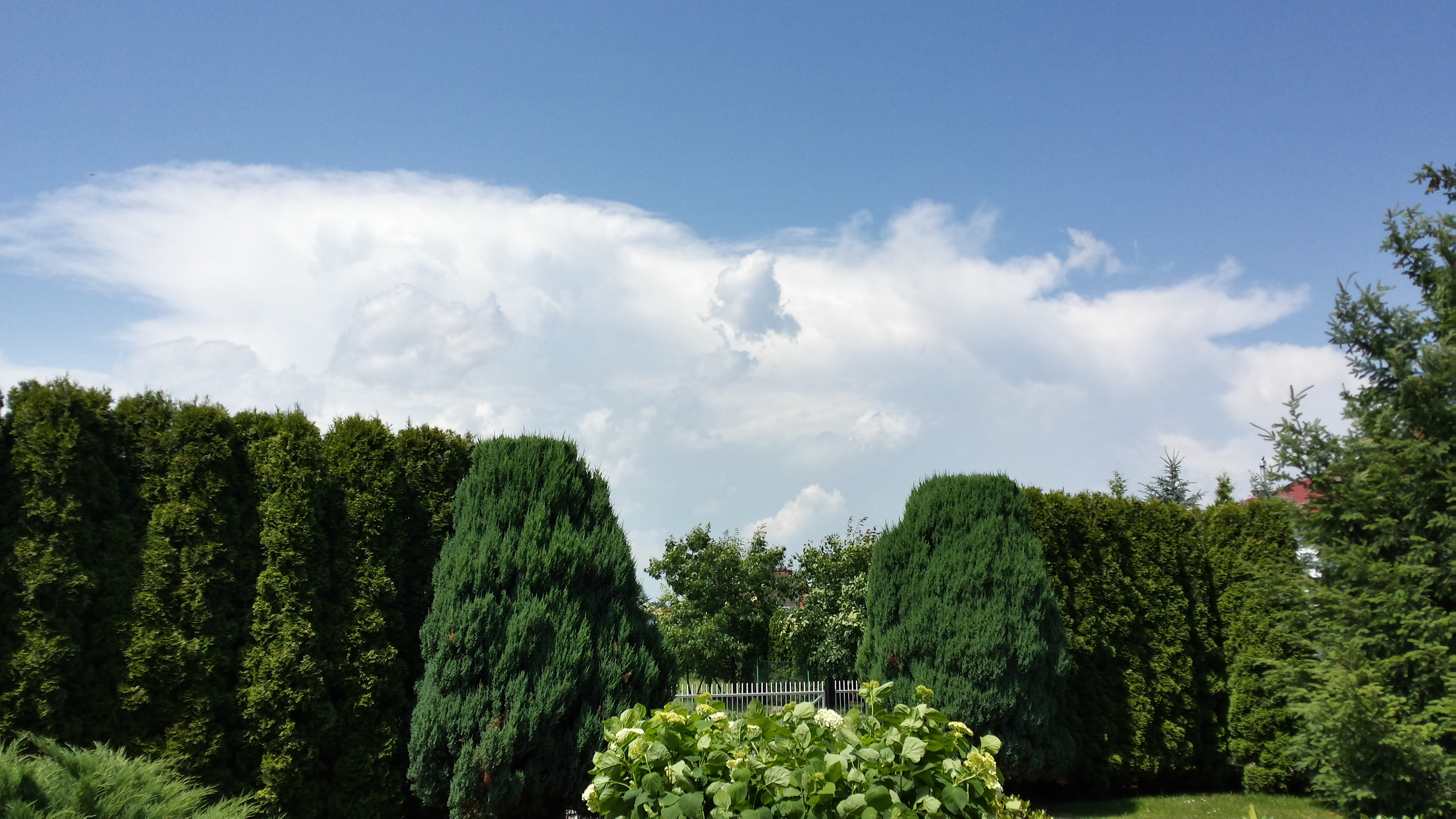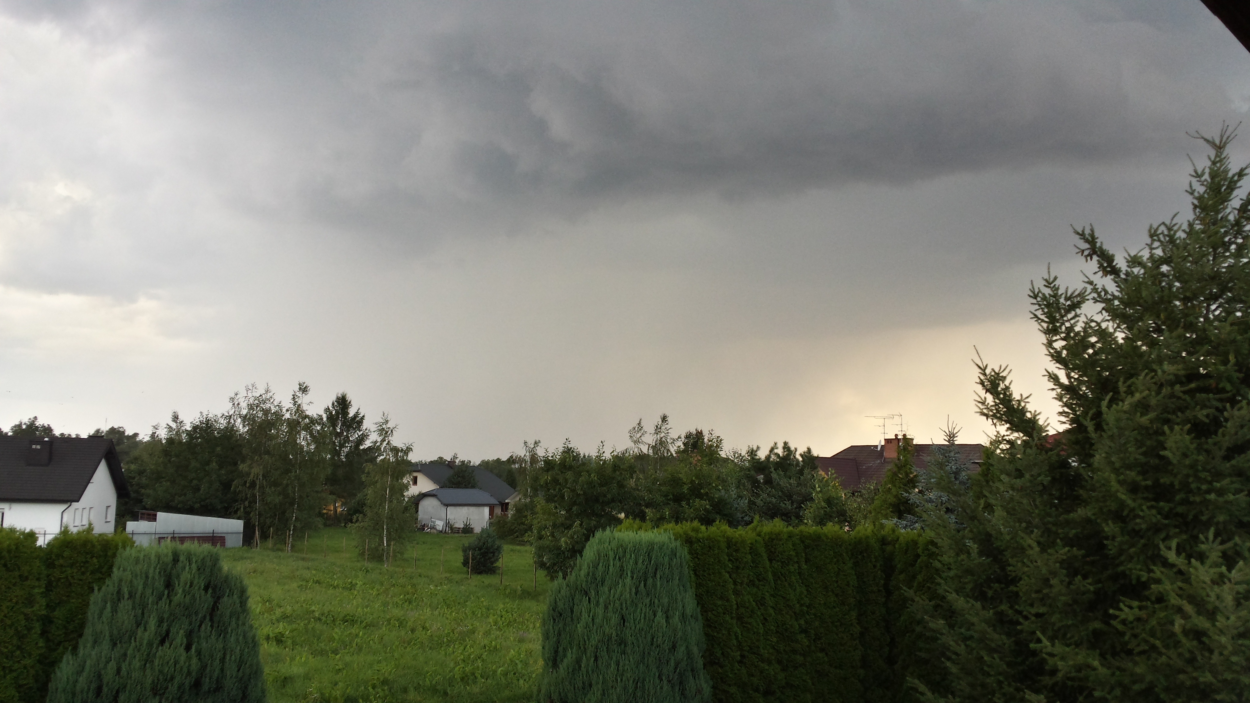 W ten parny i gorący dzień około godziny 13:00 mogłem przypomnieć sobie lipiec 2014 - nie tylko za sprawą piłkarskich emocji, ale głównie za sprawą burzy, która pokazała się na południe ode mnie, zbliżając się z każdą chwilą. Szła prawie po linii prostej, ale udało jej się jeszcze rozrosnąć tak, że swoim zasięgiem objęła szerszy obszar. Robotnicy na dachu budowanego domu sąsiadów uciekli dopiero, kiedy jeden z piorunów uderzył kilometr dalej.