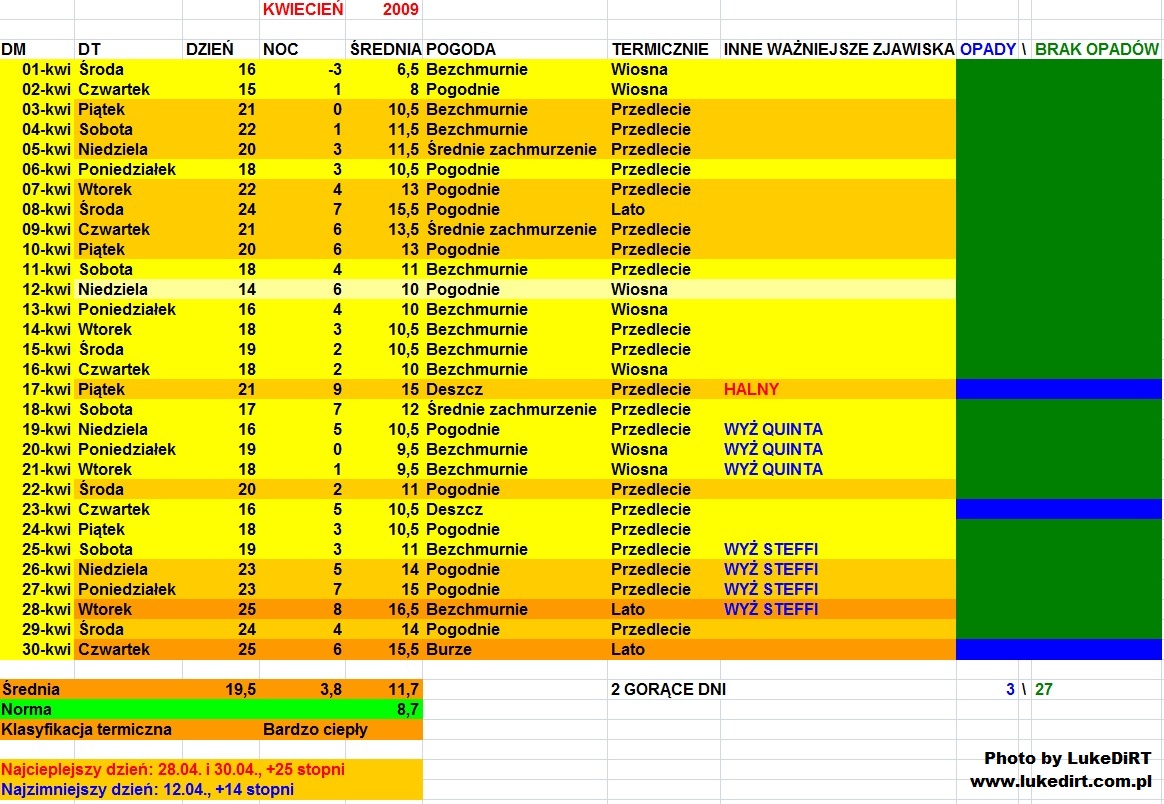 Tak jak kwiecień 2 l. wcześniej był to suchy i zdominowany przez wyże miesiąc, dzięki czemu w S i W Polsce temp. w ciągu dnia były wyższe niż w C, N i E kraju. Ten miesiąc był w porządku, ciężko mi się do czegokolwiek przyczepić. Może jedynie brakowało mi 1 dnia z oficjalnym przekroczeniem +25 C, ale to stacja w Balicach. ;-)