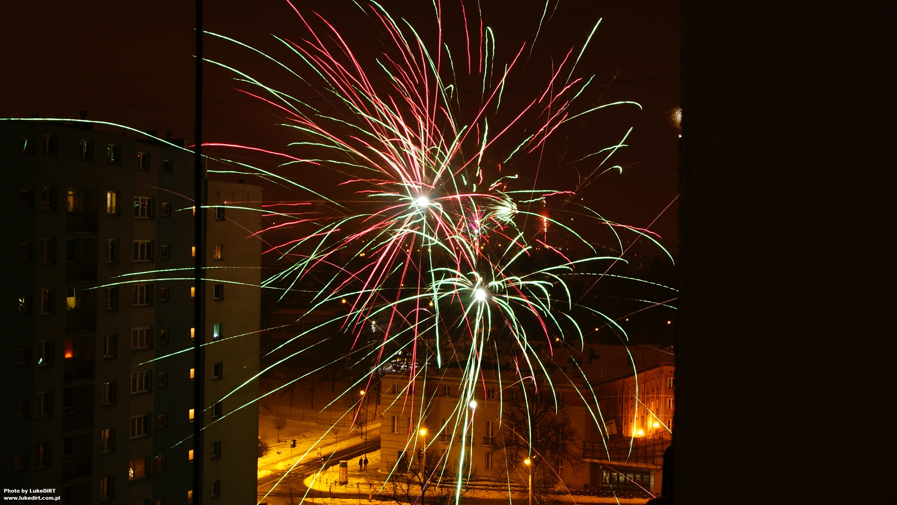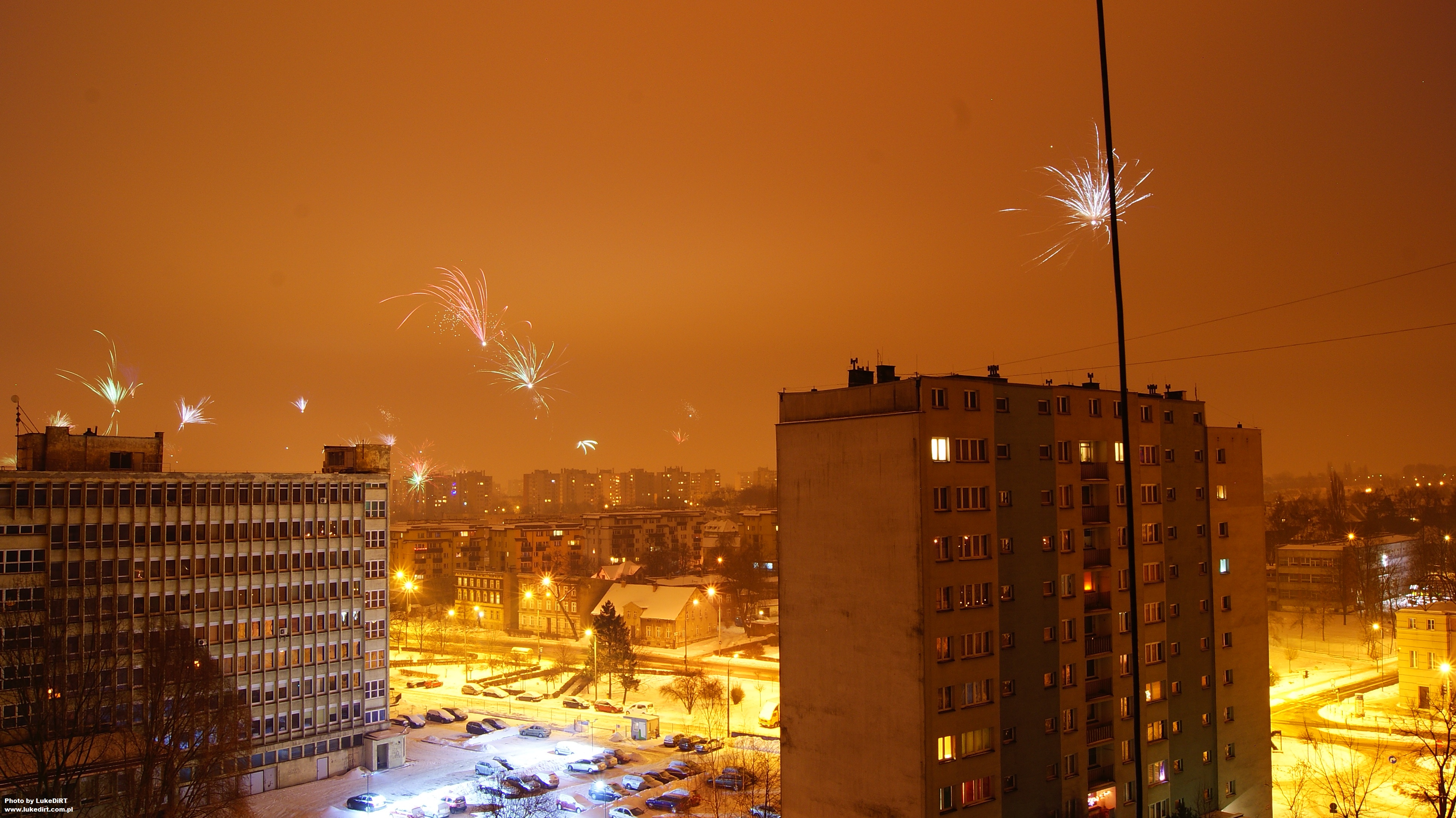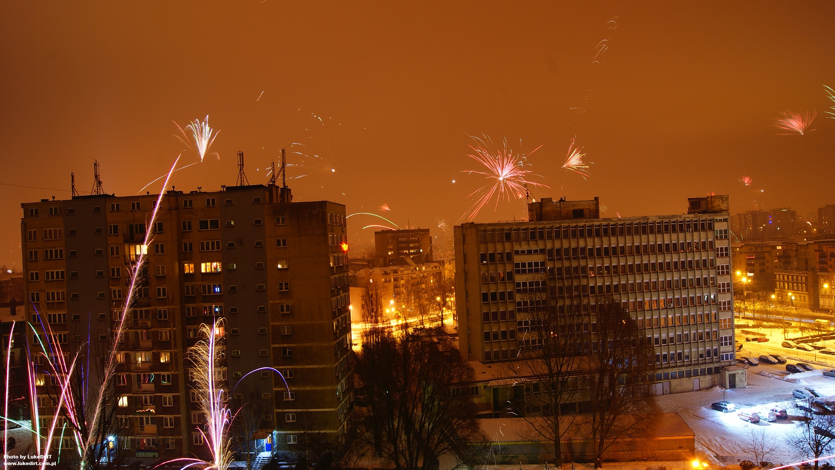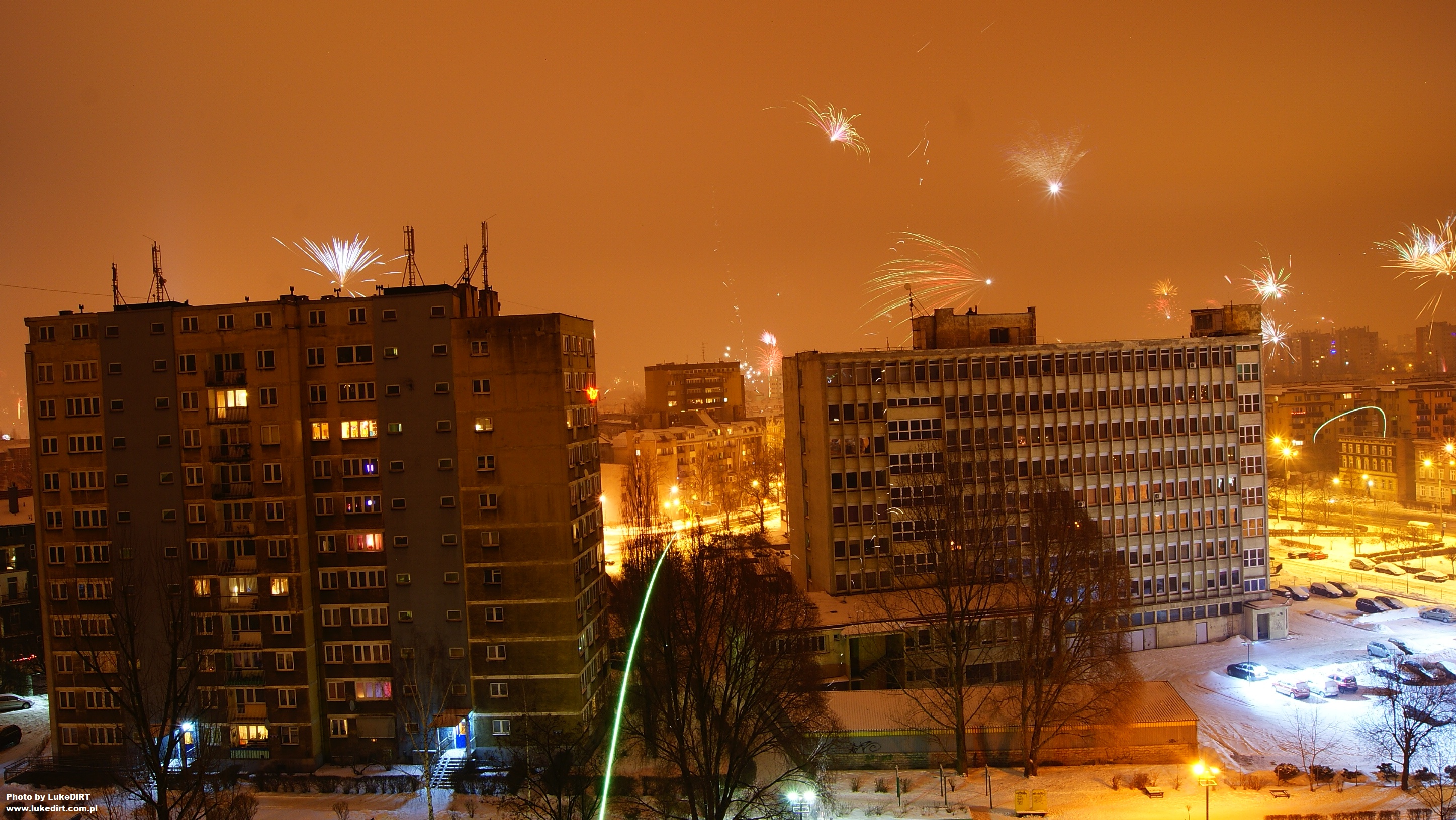 Fajerwerki na tle oświetlonych białych ulic, rzadki jest to widok w dzisiejszych czasach. ;-) Często większe ilości białej magii przypominają o sobie "dopiero" po Nowym Roku. ;-)