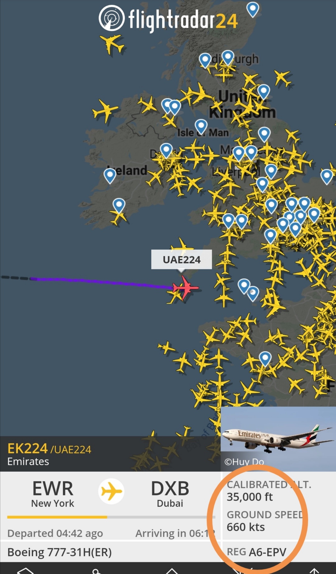 Poniżej - lot z Newark do Dubaju. Boeing 777-300ER leci z prędkością 660 kilowęzłów, to jest... 1224 kilometrów na godzinę względem ziemi. Robi wrażenie.
