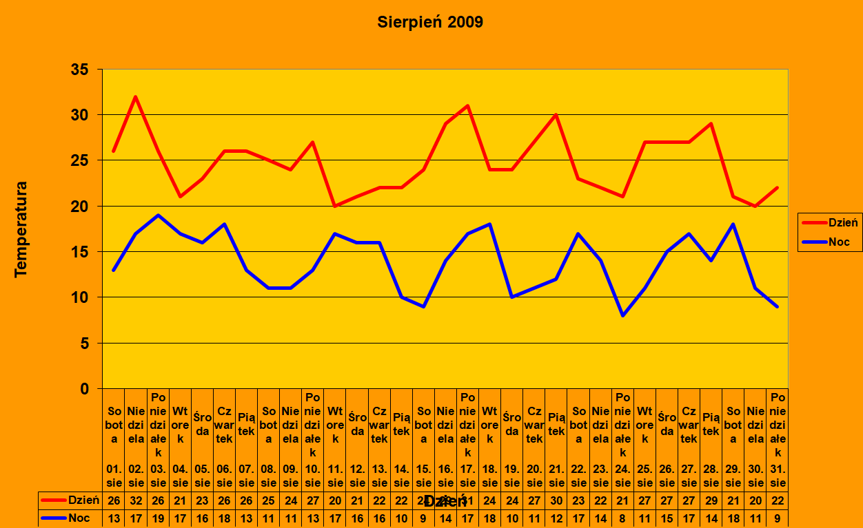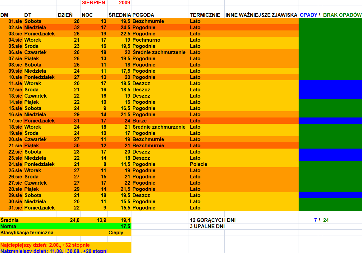 Podsumowanie sierpnia 2009 w Gliwicach. Dane zrobiłem w Excelu.