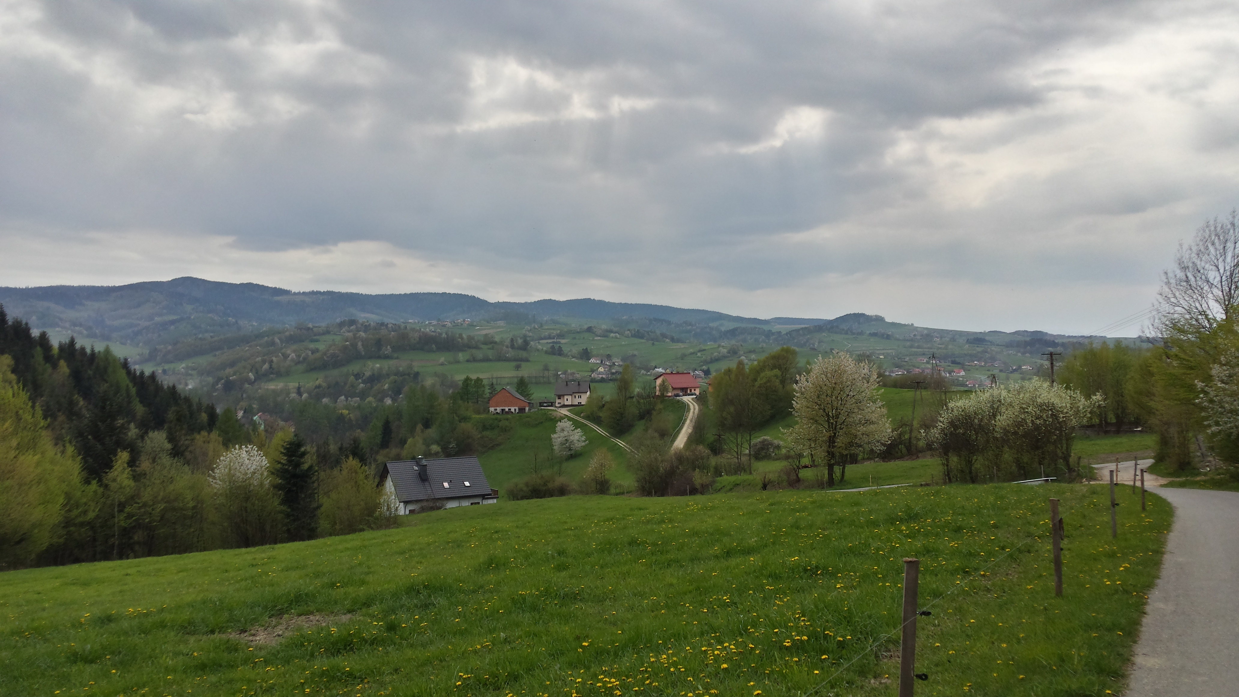 Te zdjęcia wykonałem w sobotę 23 kwietnia 2016 na wzgórzach nad Frycową i Popardową, nieopodal Nowego Sącza. Ciepła, zielona wiosna sprzyjała wędrówkom, zwłaszcza że ochłodzenie jeszcze się nie rozpoczęło. Większość zdjęć wykonałem na wysokości około 500-600 m, lecz i tam krajobrazy w ujęciu wegetacyjnym przedstawiały się bardzo okazale :) Na miejsce wraz z przyjacielem i jego bratem podeszliśmy pieszo, aby nie musieć pchać rowerów na dużym przewyższeniu (teraz może bym to przejechał). Zostawiliśmy je niżej, na szczęście mieliśmy zapięcia i można było skorzystać z gęsto rosnących drzew przy strumyku. Na górę poszliśmy w celu praktykowania pewnej dyscypliny. Nie jest to oficjalnie sport, ale coś podobnego. Kiedyś Wam o tym opowiem, a historia nie będzie krótka :)