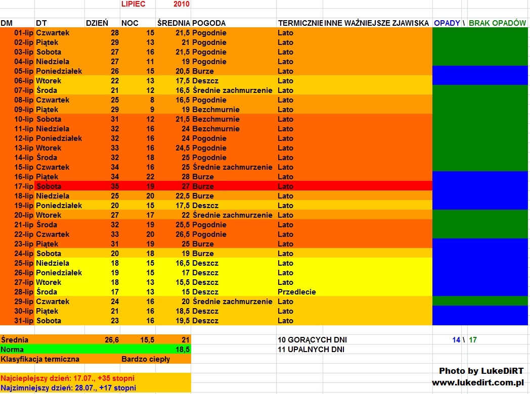 Fajny miesiąc. Przyniósł długotrwałą falę upałów przy niskiej wilgotności - zmieniać się zaczęło dopiero 16 dnia miesiąca. Na początku III dekady powrócił upał, ale na krócej - na 3 dni. 23 lipca przeszła gwałtowna frontowa burza, która zakończyła upał na dłużej. Końcówka miesiąca była niestety chłodna i deszczowa.