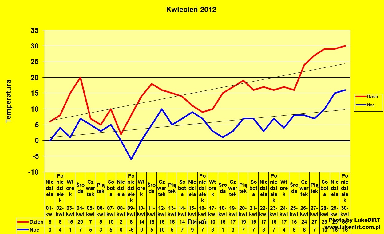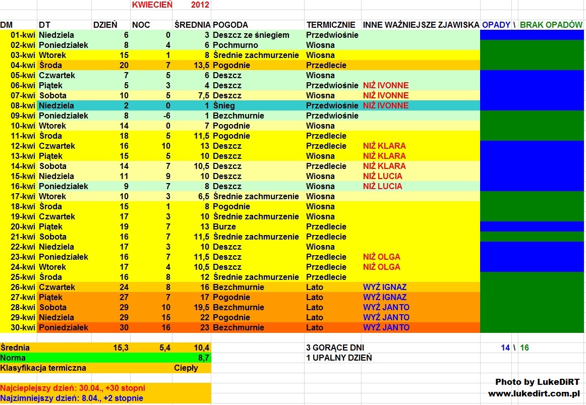 Tradycyjnie przyniósł zimową wręcz Wielkanoc, w połowie miesiąca przechodziły ciągłe deszcze, przy zasnutym chmurami niebie i temperaturami nie przekraczającymi 10 stopni, a podczas pogodniejszych dni występowały nawet przymrozki. Od 20.04 się ociepliło na dobre do prawdziwie wiosennych temperatur (wcześniej to tylko epizodycznie...), ale nadal było dość pochmurno. A kiedy w końcu się na dobre rozpogodziło, to od razu uderzyło upałem....