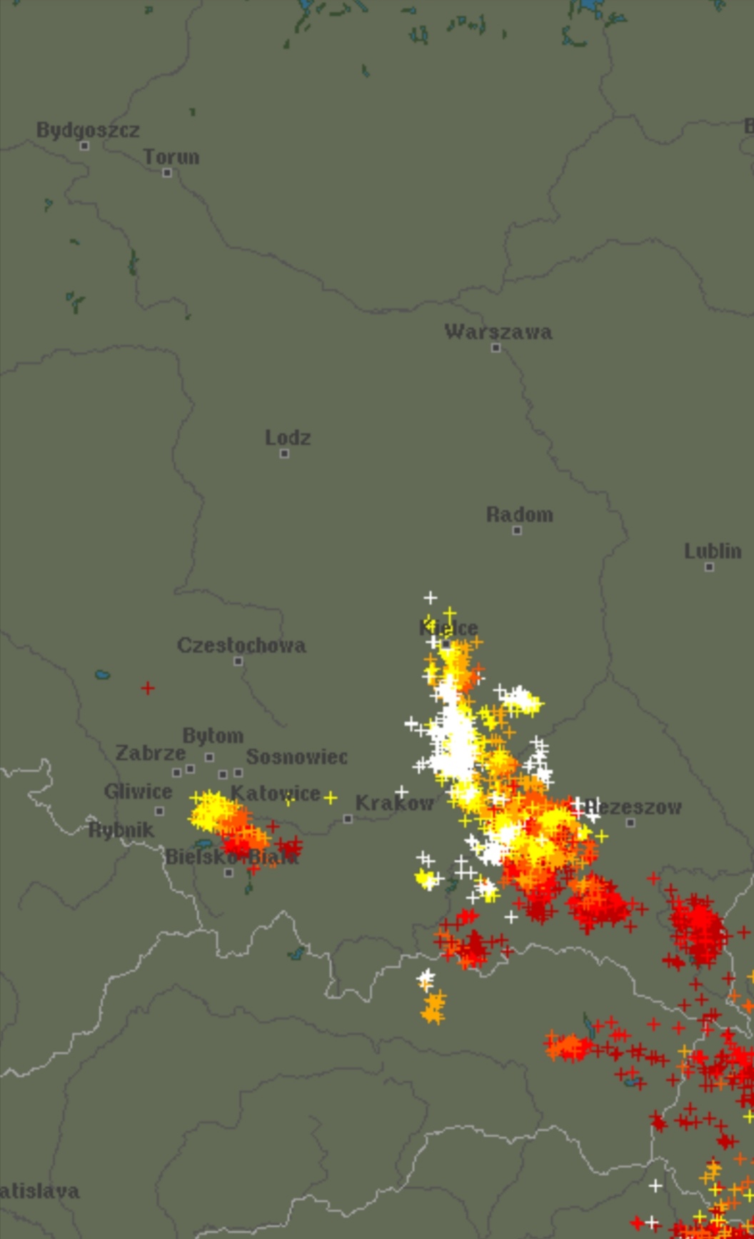 Przed 8:00 dotarłem na miejsce, rozsiadłem się w swoim "biurze" i czekałem aż dostanę swój zestaw zadań na dziś. W tym czasie włączyłem jeszcze internet i zobaczyłem zdjęcia pięknej chmury szelfowej nad Krakowem. Ten widok pobudził moją wyobraźnię, bo sam od dłuższego czasu nie widziałem żadnej chmury tego rodzaju. Aby sprawdzić, jak wygląda ten krakowski układ, włączyłem detektor wyładowań i przeżyłem niemałe zaskoczenie. Zobaczyłem jak od strony Słowacji zmierzają do mnie dwie duże komórki gotowe do wejścia na mój teren w najbliższych kwadransach.