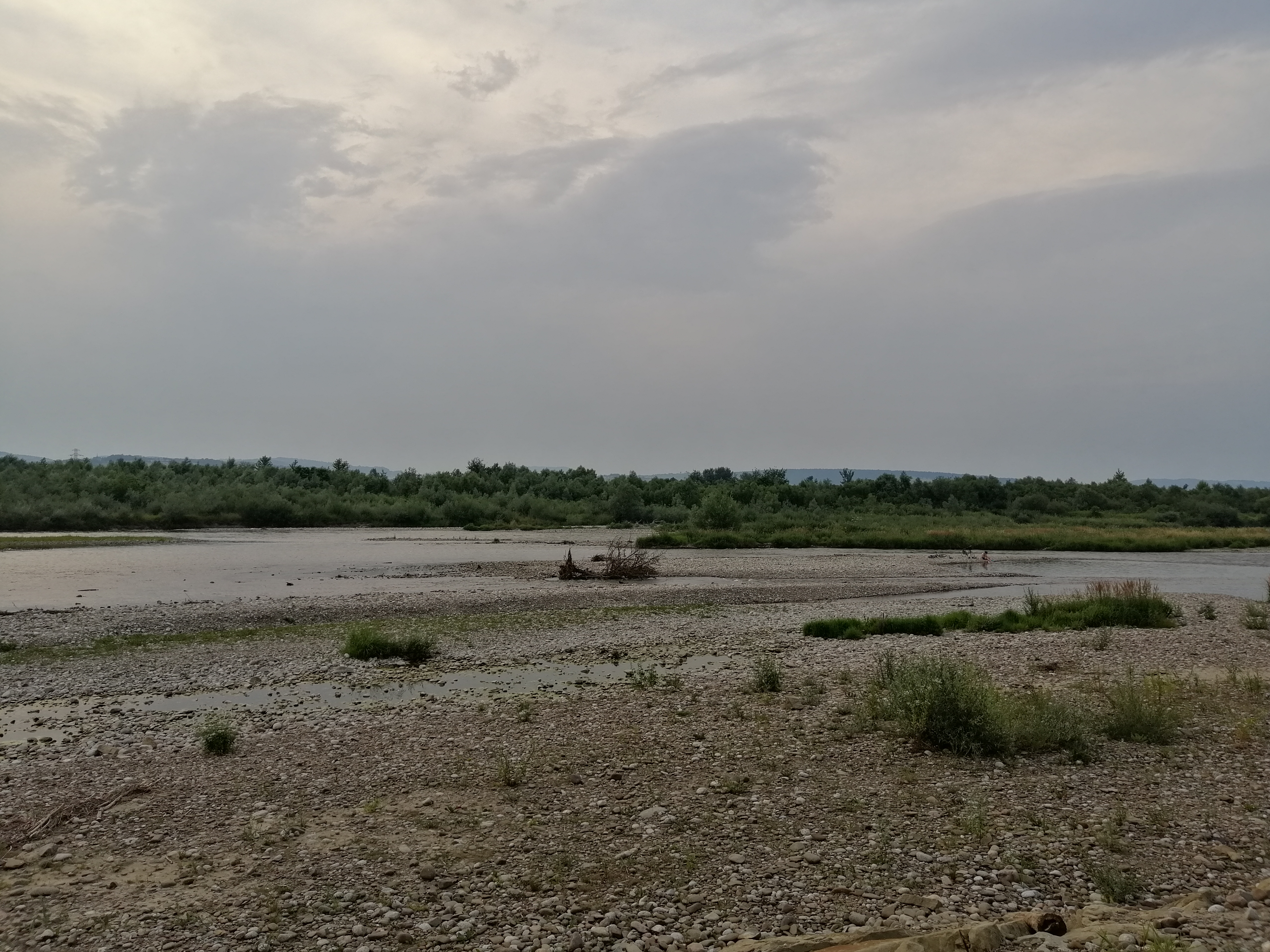 Zaraz po dodaniu postu i zareklamowaniu go na shoutboxie wsiadłem na rower i skierowałem się w stronę stacji nad Dunajcem i ścieżki rowerowej na starosądeckie Stawy. Był ciepły, ale pochmurny wieczór. Pomimo wysokiej temperatury tego dnia trasę przemierzało niewielu cyklistów, ale i ja nie rozpędzałem się zanadto. Czasami zdarza mi się jeździć za szybko (ale nie samochodem), jednak w tym czasie spora parność i wrażenie ociężałości nieba wywoływały wrażenie osiągania niższych prędkości przy takim samym nakładzie sił, przy jakim nieraz potrafię dać z siebie więcej. Było pochmurno, a chmury wyglądały tak, jakby wkrótce miał spaść deszcz. Zboczyłem nawet z trasy, aby na plaży nad Dunajcem ocenić stan wody. Dość normalny.