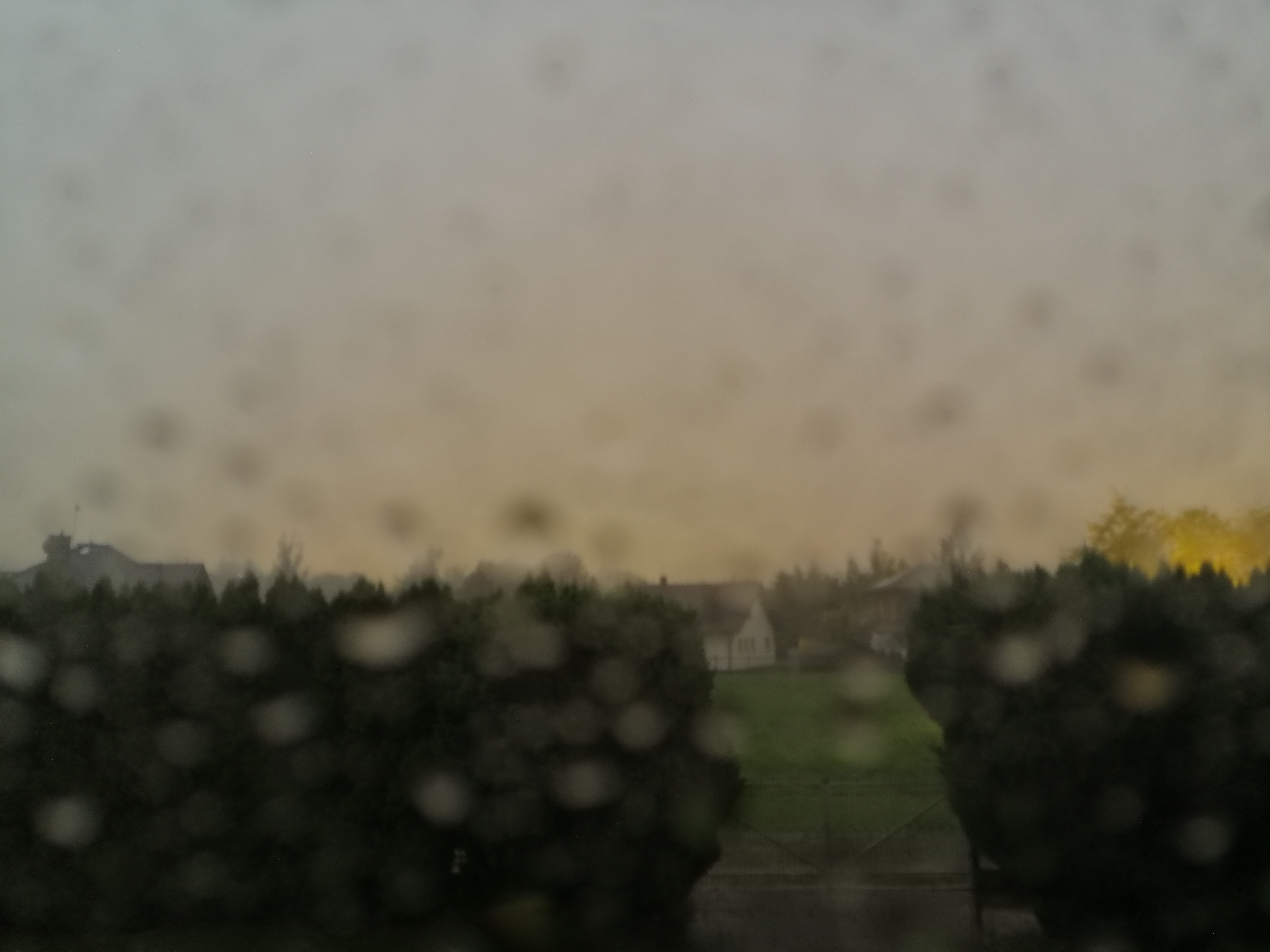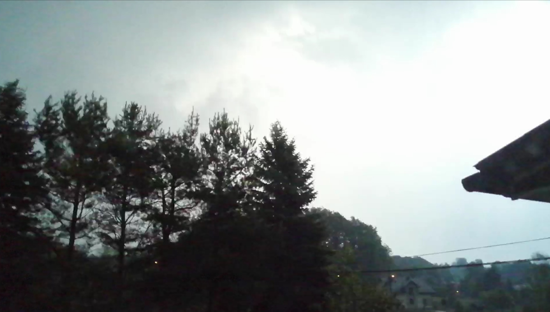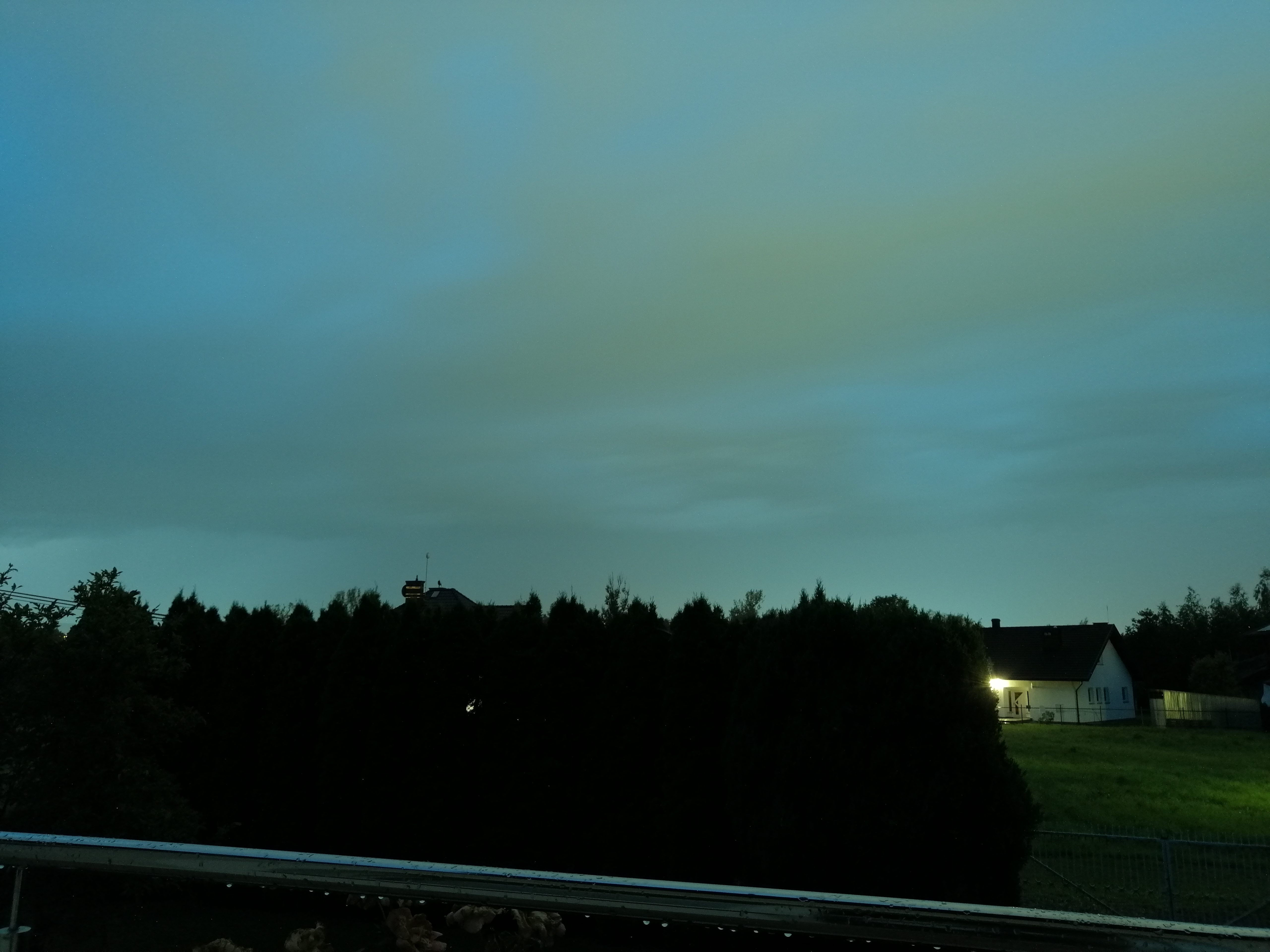 Kiedy dowiedziałem się, że burza nie wydaje się nazbyt spektakularna, nieco się uspokoiłem i od tej pory skupiłem się już w pełni na swoich działaniach. Po pewnym czasie zaczęło mocno padać i usłyszałem ciche grzmoty. Woda pięknie spływała po tych lekko pochylonych dachach widocznych na powyższym zdjęciu. Wyglądała tak, jakby płynęła po zjeżdżalni na basenie. Opad był mocny i kiedy raz musiałem przemieścić się na wyższą kondygnację po schodach na boku budynku, gdzie izolacja jest słabsza, wyraźnie słyszałem jak pięknie dudni. To nie mogło jednak potrwać długo. Już po krótkim czasie na niebie pojawiły się prześwity. Kiedy miałem wolną chwilę, stanąłem przy oknie, aby choć przez krótki czas móc podziwiać wyładowania. Widziałem kilka, w tym jedno doziemne. Uderzyło gdzieś w miasto. Niedaleko, ale grzmot został mocno przytłumiony. Potem widziałem jeszcze jak opad przesuwa się na północ, a