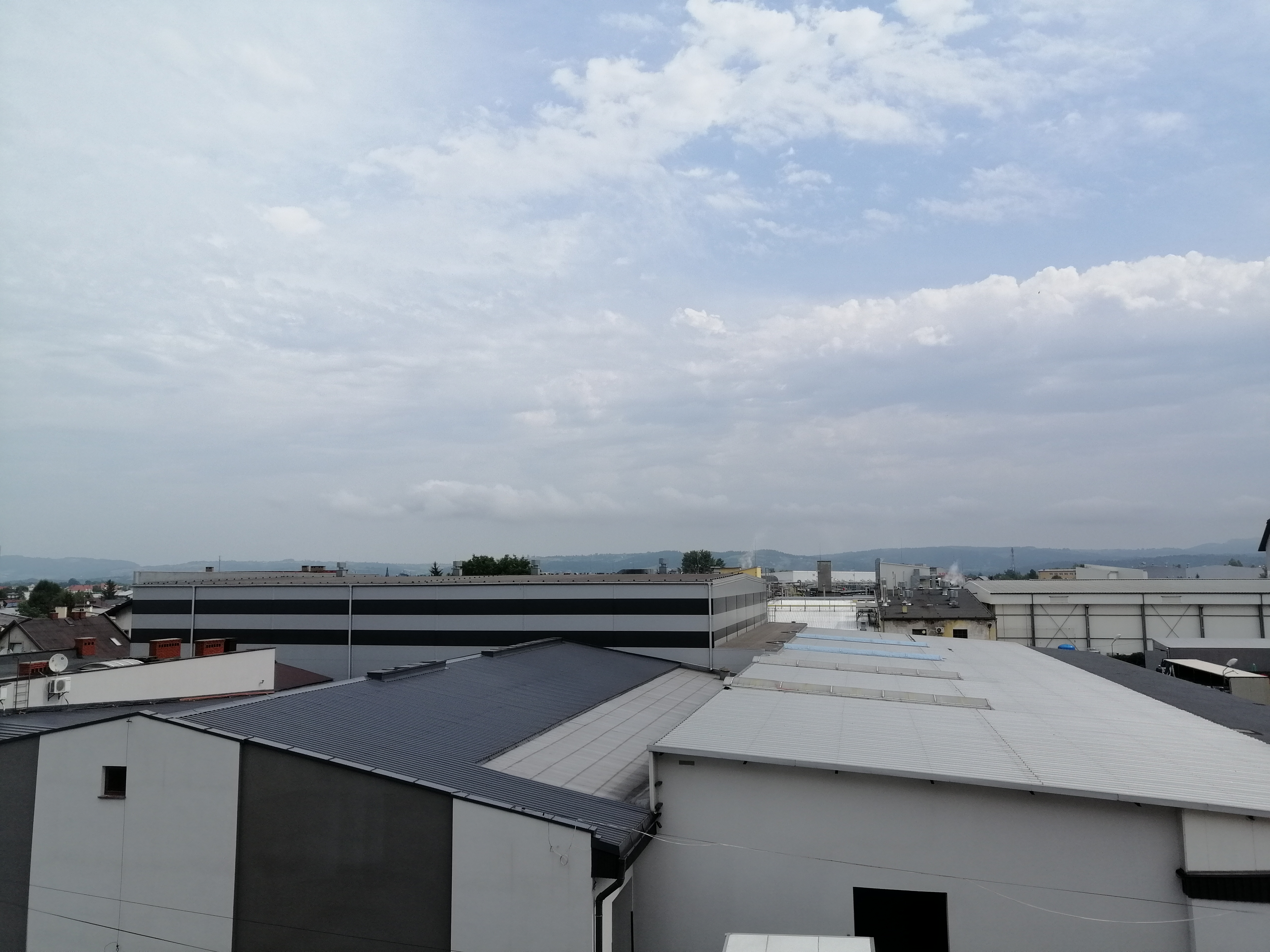 Na niebie pojawiło się trochę błękitu. O 10:00 zrobiłem zdjęcie swojego widoku za oknem, widoku na przemysłową część Nowego Sącza.