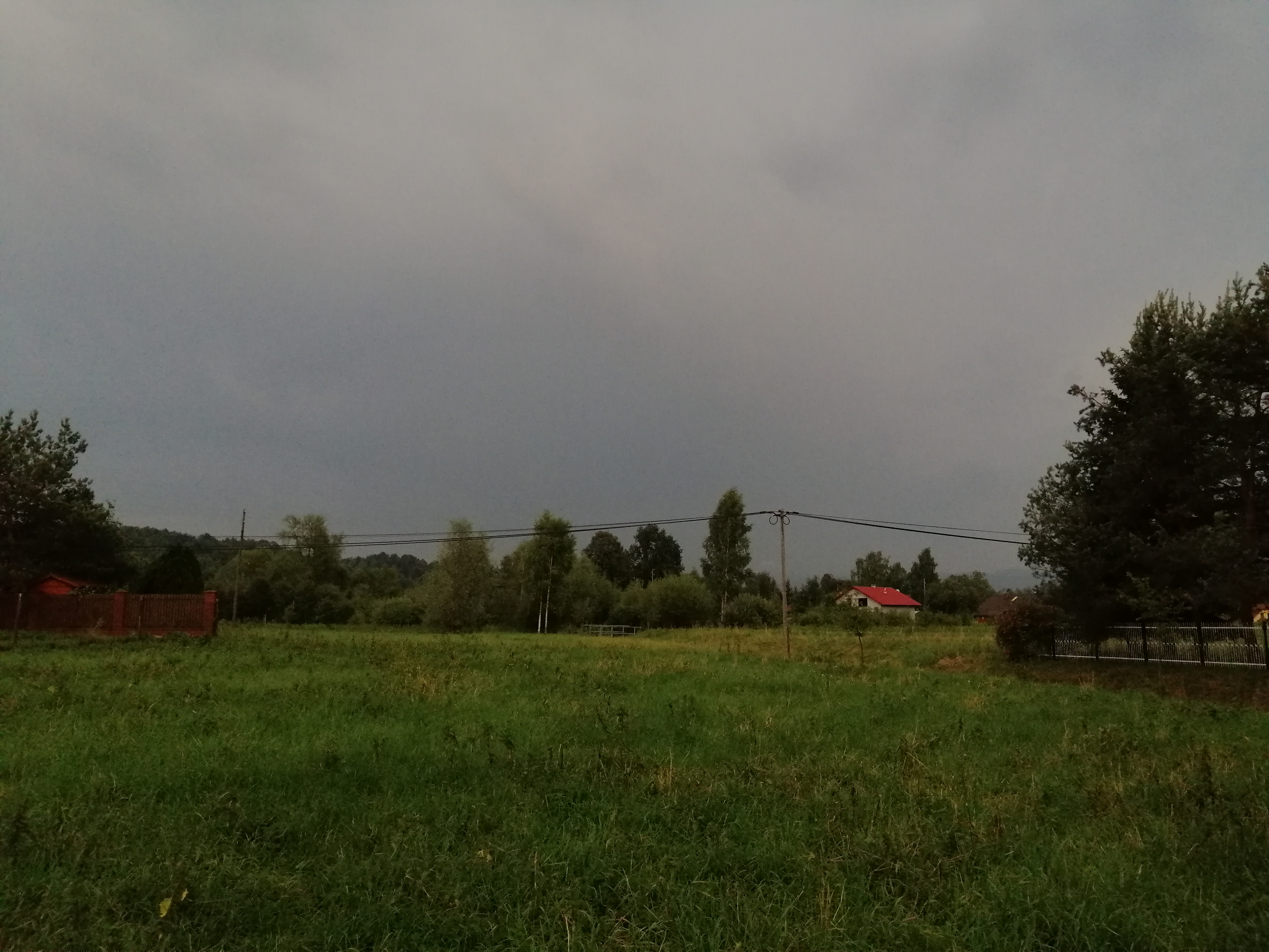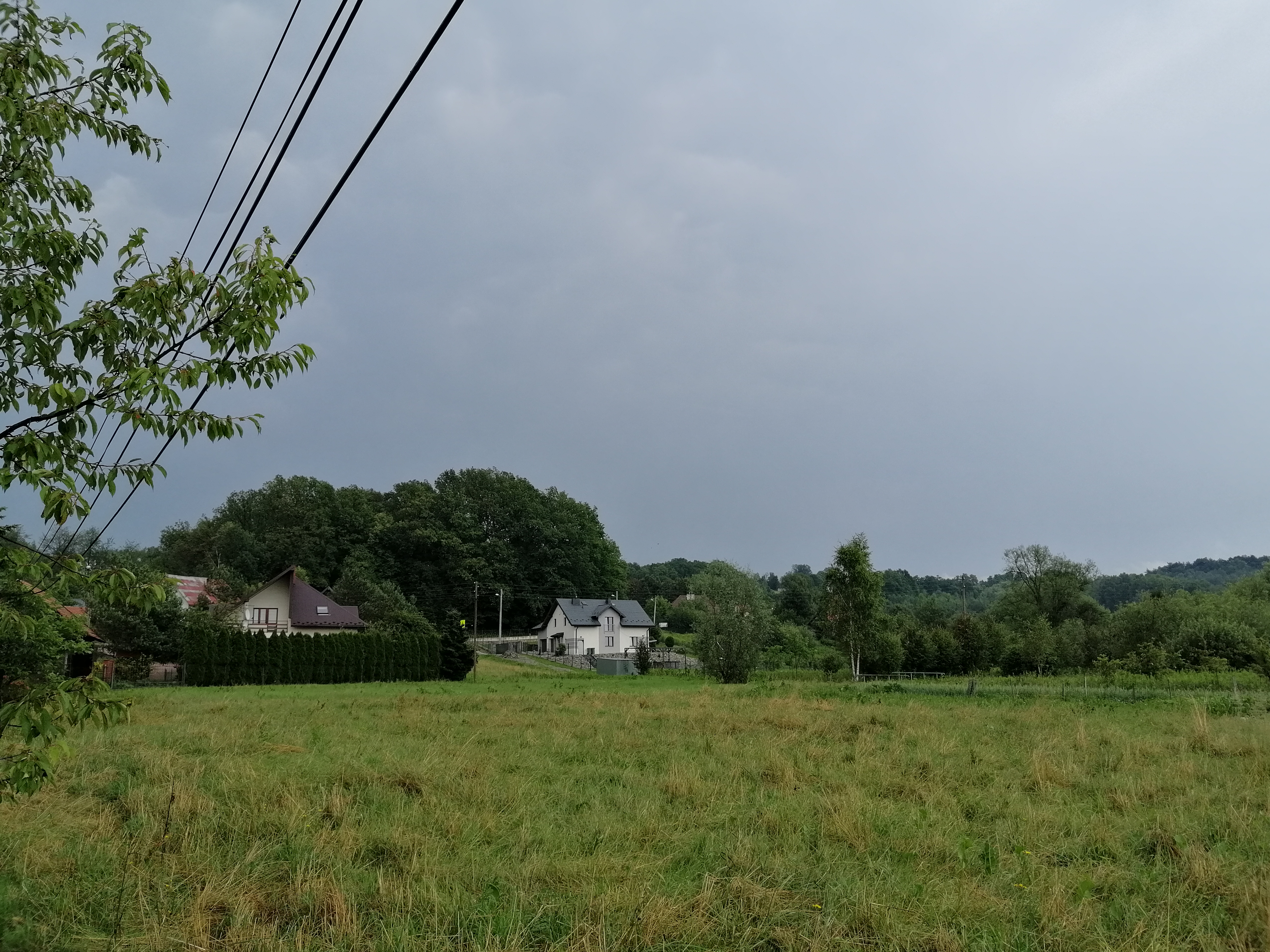 Druga burza przeminęła i w kolejnych godzinach nie działo się u mnie nic ciekawego. Skończyłem o 14:00 i po dwudziestu minutach w korkach dotarłem do domu. Trawniki były mokre, a niebo zachmurzone, choć Słońce usilnie próbowało wtrącić swoje trzy grosze. W okolicach Krosna szalała inna burza i szukając kluczy usłyszałem nawet cichy grzmot z tamtej strony. Zrobiłem zdjęcie sytuacji na wschodzie. I czas na obiad.