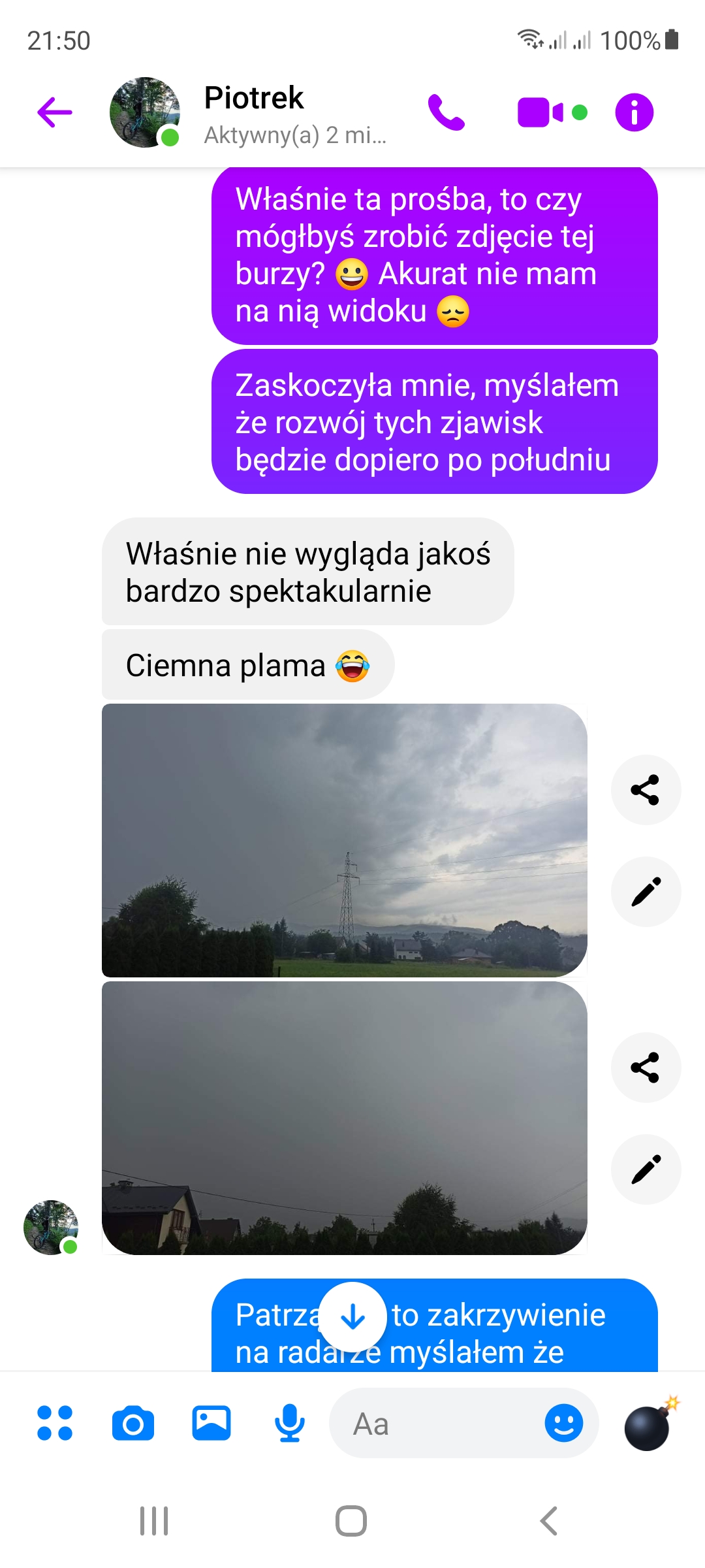 Pisanie do różnych kolegów by relacjonowali i wysyłali zdjęcia jest dla mnie codziennością, pamiętam jak raz w dniu 21.06.2019 napisałem do mojego jedynego znajomego z Wesołej, aby się dowiedzieć, jak wygląda ponad 100mm ulewa u niego.