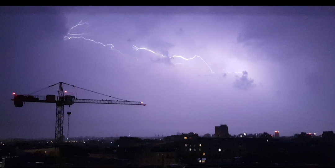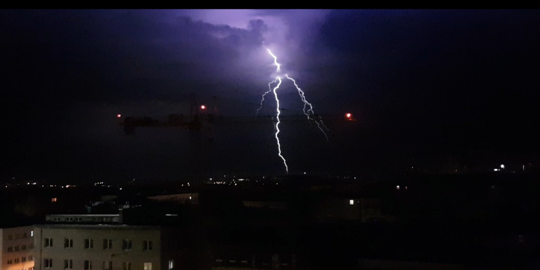 Na drugim zdjęciu ten wał wygląda tak groźnie i tajemniczo, a jednocześnie podświetlone niebo ma kolor kojarzący mi się z niebem po wieczornych opadach śniegu A było tak cieplutko Błyskawice pięknie uchwycone, najbardziej podoba mi się ta rozświetlająca niebo, na którego tle prezentuje się dumny żuraw. Od kiedy pamiętam, ten rodzaj sprzętu budowlanego zawsze mi się podobał jako nieodłączna część składowa miejskiego klimatu.