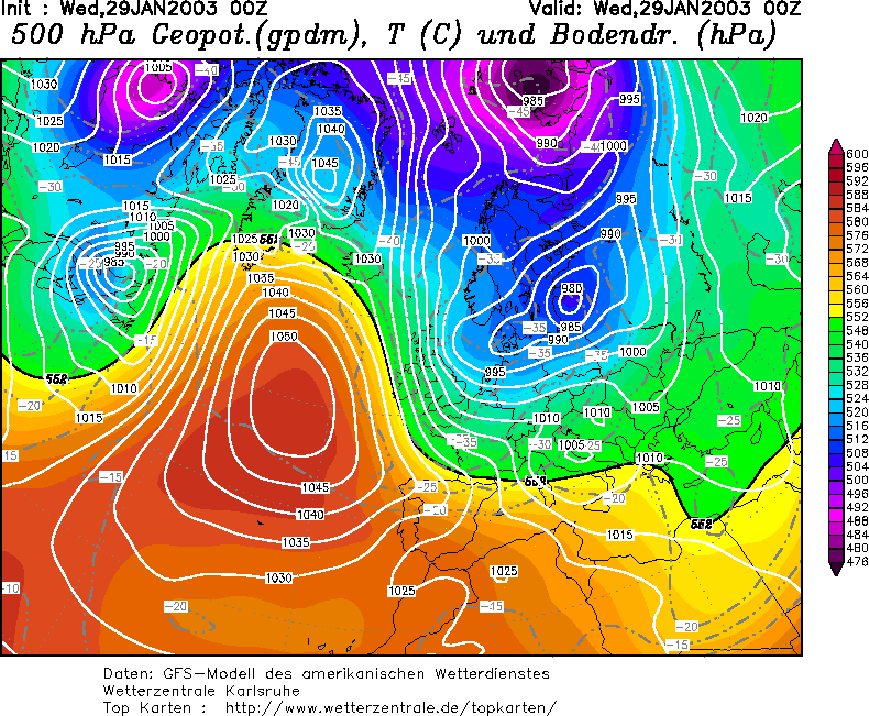 29.01 układ wyglądał już tak. Po parszywym, strefowym układzie nie było śladu. Był to ostatni dzień odwilży przed dłuższą przerwą, jednak patrząc na panujący układ, to nadal nie napawało to optymizmem. Wyż nad Atlantykiem nadal nie zachowywał się astrefowo, nadal był w wysokim geopotencjale i nic nie wskazywało na jego odcięcie się od zwrotnika...