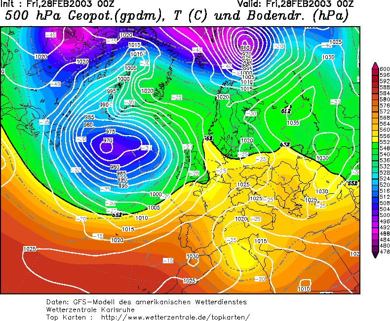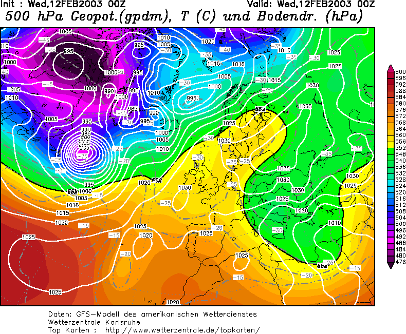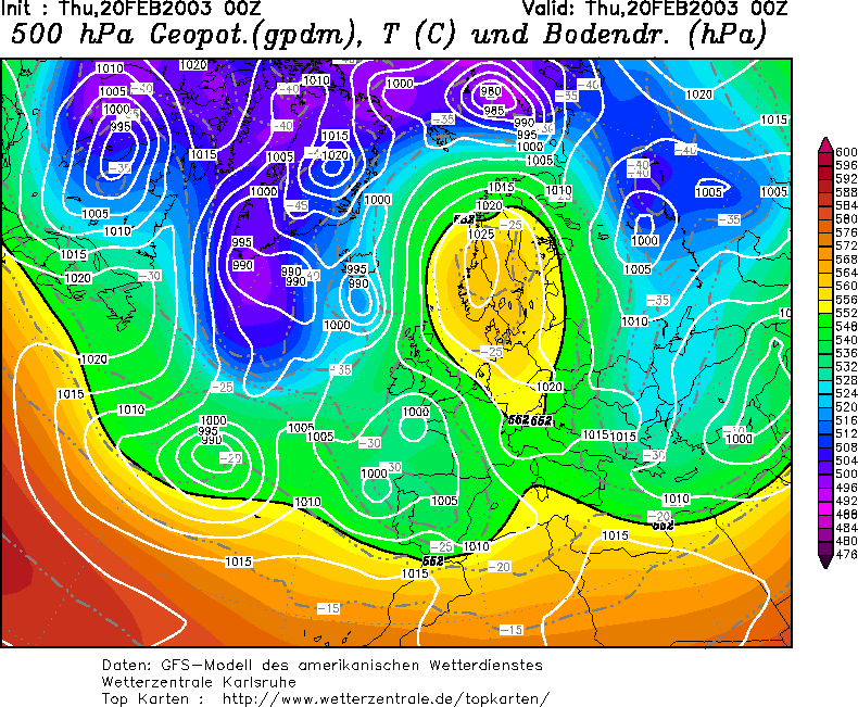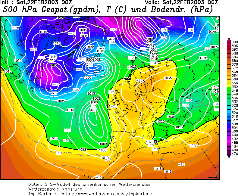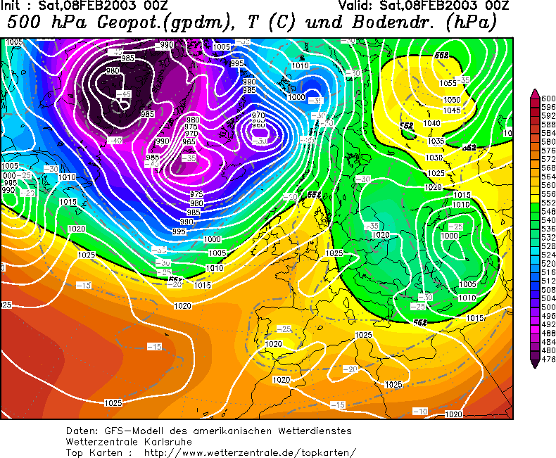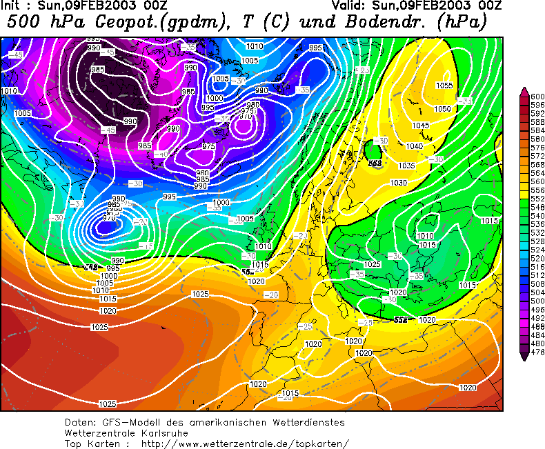 Brak blokady na Atlantyku rzeczywiście zdumiewa, podobnie jak fakt niepewnej sytuacji na zachodzie Europy przez tak poważną część zimy, która w Polsce okazała się najchłodniejszą w XXI wieku. Cóż, nasz kontynent jest na tyle duży, że skrywa wiele takich elementów niemal zawsze. Na szczęście w lutym 2003 wszystkie późniejsze zaszłości baryczne przemawiały na naszą korzyść. Myślę jednak, że od około 5 lutego, kiedy kształtował się genueńczyk, można było być z grubsza spokojnym. Opady z 5-6 lutego 2003 w Nowym Sączu, to coś czego w latach 80-tych nie było ani razu, nawet luty 1985 czy styczeń 1987 nigdy nie dały aż takiej bieli. Ruski wyż ułożył się bardzo korzystnie, bo z jednej strony podkreślił zimę ostrym mrozem poniżej -25 stopni, to zarazem nie sprawił, że ekstremalnie niskie temperatury pozostały na bardzo długo. Końcówka miała swój urok, bowiem pomimo lekkoplusowych temperatur przy lampie, nocami nadal notowano tęgi mróz i średnie dobowe wychodziły poniżej normy. Fura śniegu utrzymywała się na ziemi i widoki musiały być super. Niestety w Nowym Sączu miesiąc ten był pewnego rodzaju "złośnikiem". 28 lutego, w ostatnim dniu miesiąca, średnia temperatura dobowa przekroczyła zero. A była wyjątkowa szansa na dołączenie lutego 2003 do ekskluzywnego grona miesięcy pozbawionych jakiejkolwiek dodatniej średniej - czyli do lutego 1956 i dałbieli 1969.