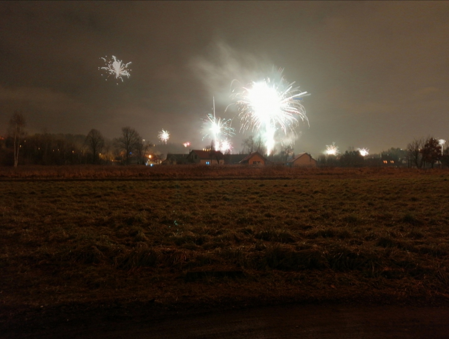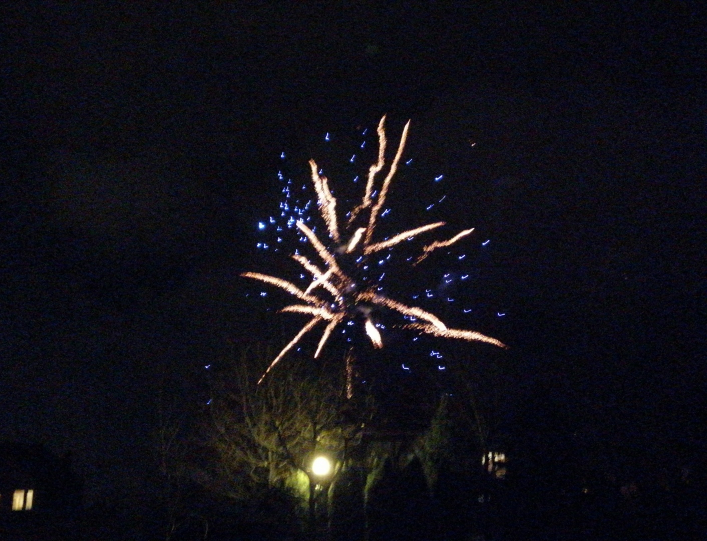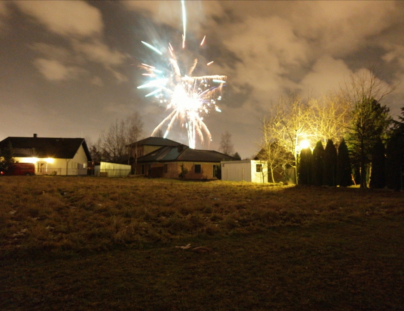 To była przepiękna noc. Od wieczora całe nieodległe miasto, a szczególnie moja okolica ruszyła do pirotechnicznej rywalizacji. Początkowo spokojnie i bez pośpiechu, ale o 23:55 kiedy i ja wytoczyłem działa, wszystko ruszyło bardzo ostro i po chwili na niebie pojawił się istny pióropusz sztucznych ogni. Nawet baterie 50mm i potężne kątówki poszły w ruch, otaczając wszystko blaskiem. Sąsiedzi ze wszystkich stron bardzo się postarali i całymi rodzinami powychodzili na swoje pokazy, które trwały do około 0:20. Magiczna północ i magiczna cała noc.