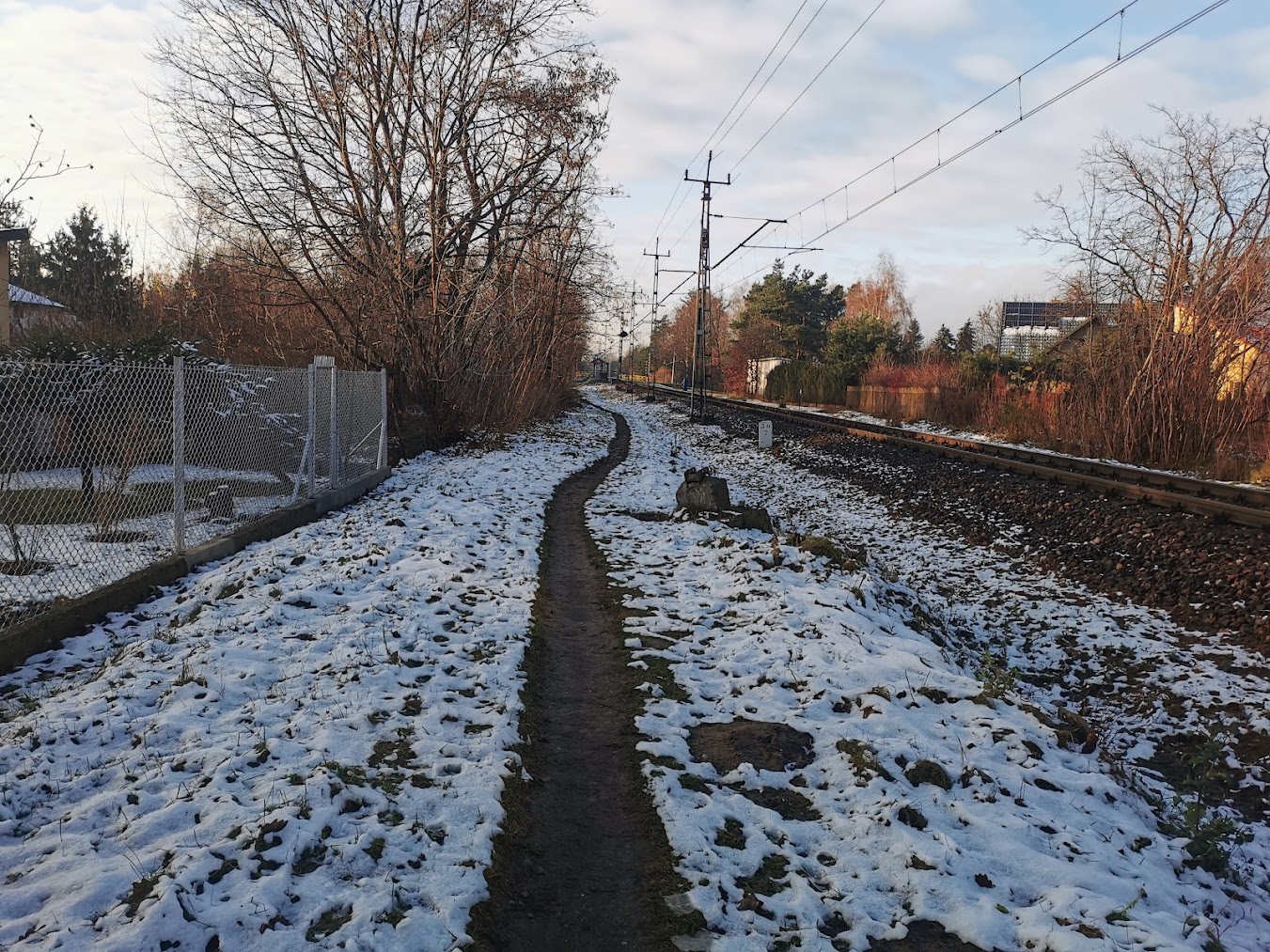 Dopiero gdy opuściłem zasadnicze miasto i szedłem wzdłuż torów, to udało się zobaczyć jeszcze trochę bialutkich krajobrazów. Tuż przed dotarciem na stację przy ulicy Piaskowej. Drugie zdjęcie rozmazane, bo zacząłem biec na pociąg, ledwo zdążyłem XD