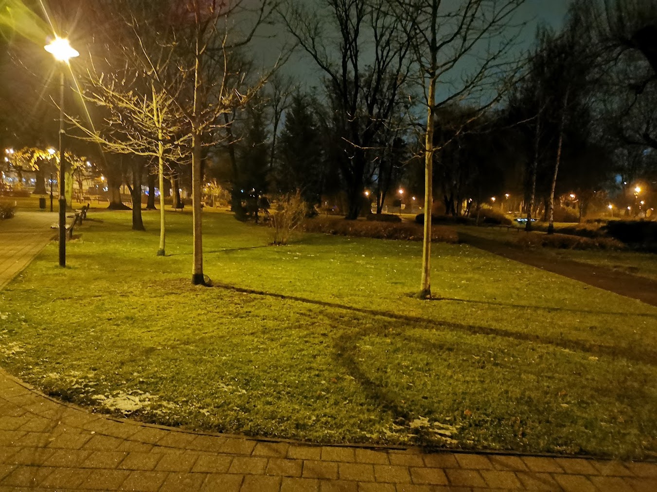 Gdy po 16:30 zakończyłem zajęcia, udałem się deptakiem w kierunku stacji PKP (znajduje się ona po drugiej stronie miasta niż WKD), a następnie do Parku Skarbków tuż obok niej, w którym dzień wcześniej onlinowo sobie oglądałem magiczne krajobrazy. Niestety, śladu już nie było...